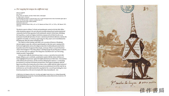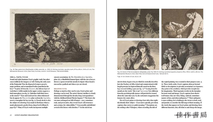 书中包含两篇文章、一份详细的年表和100多件作品,展示了身处当时时代背景下,戈雅所作的素描和版画的非凡广度和力量。这些作品记录了戈雅平面创作的各个阶段和特质,从他早期创作的临摹委拉斯开兹油画的蚀刻版画到“随想曲”和“战争灾难”等版画系列再到其晚期的“波尔多公牛”,以及其他揭示艺术家噩梦、梦想和愿景的作品。