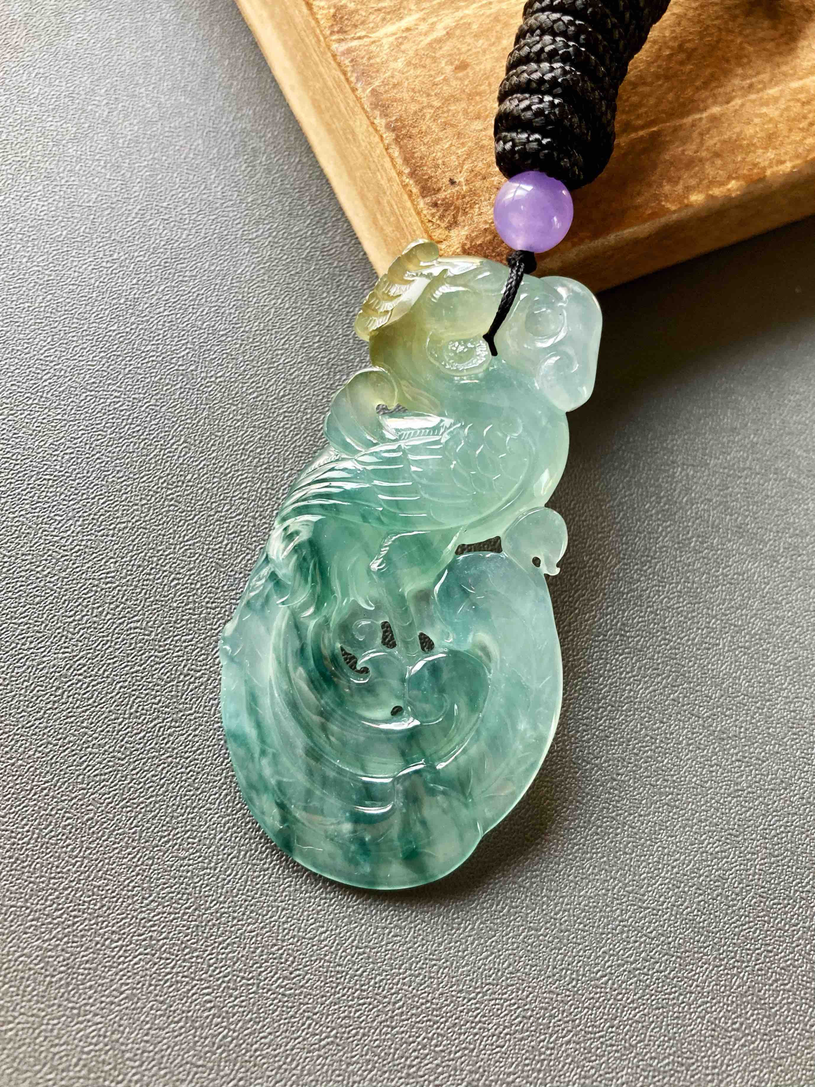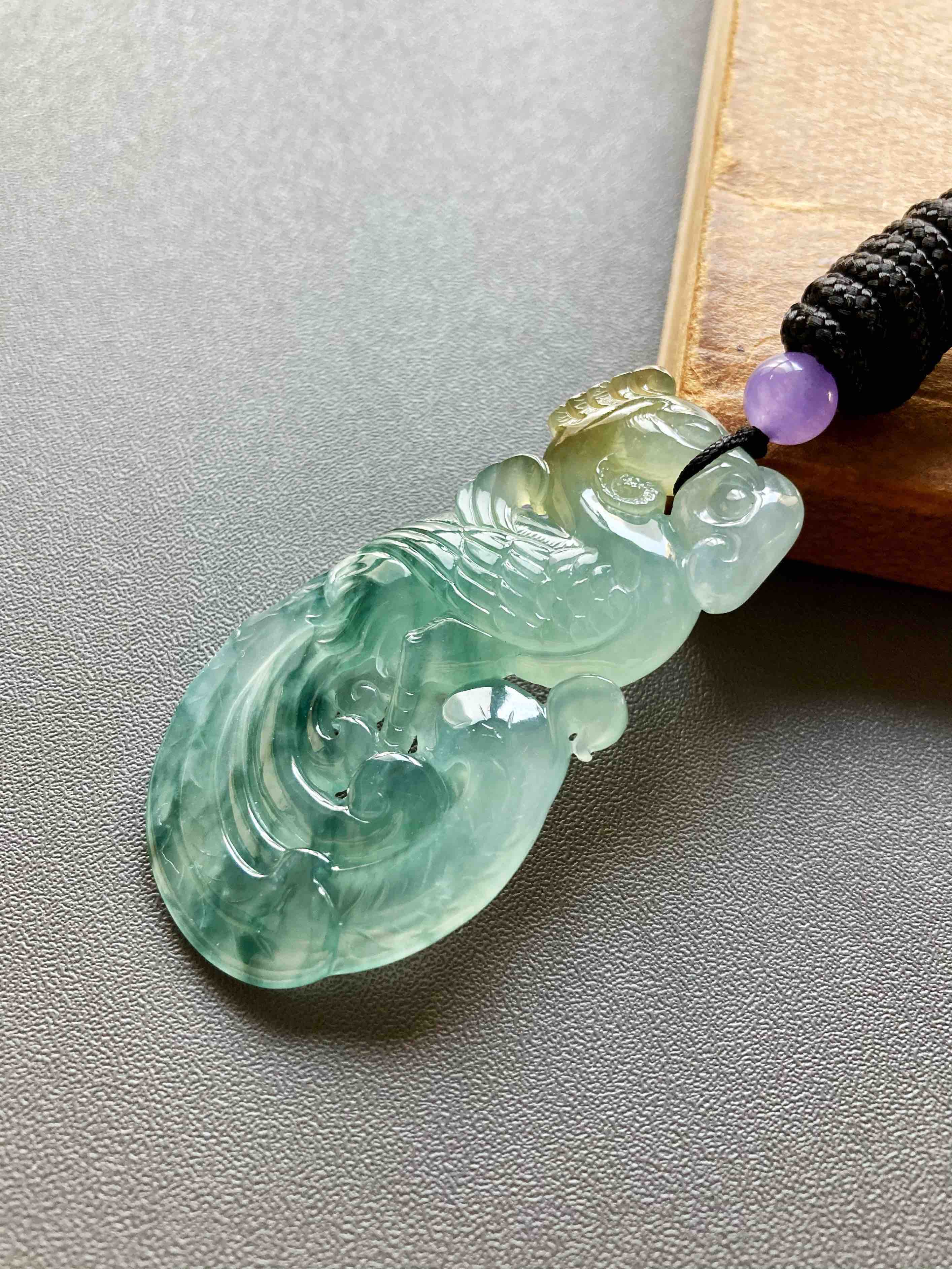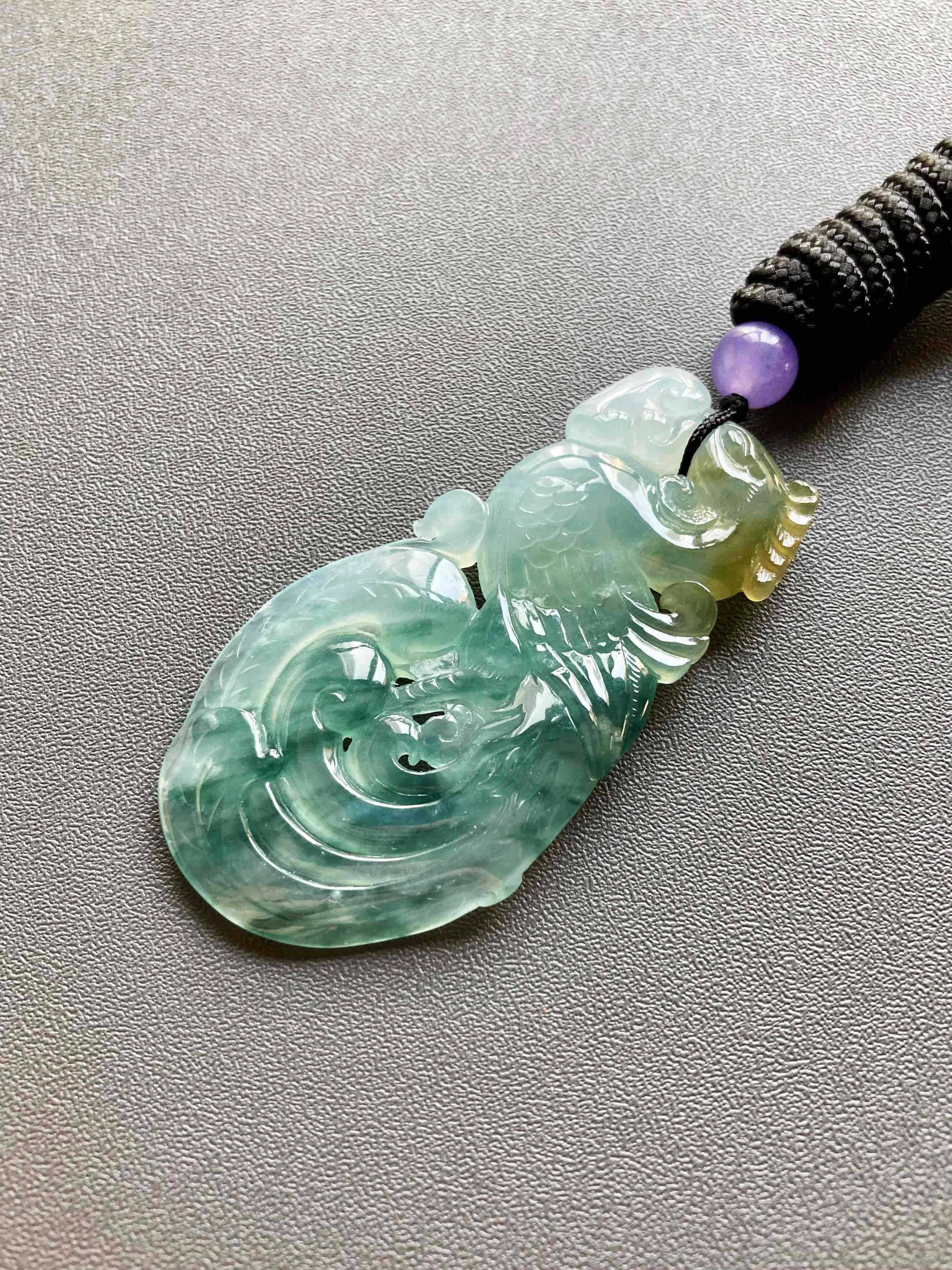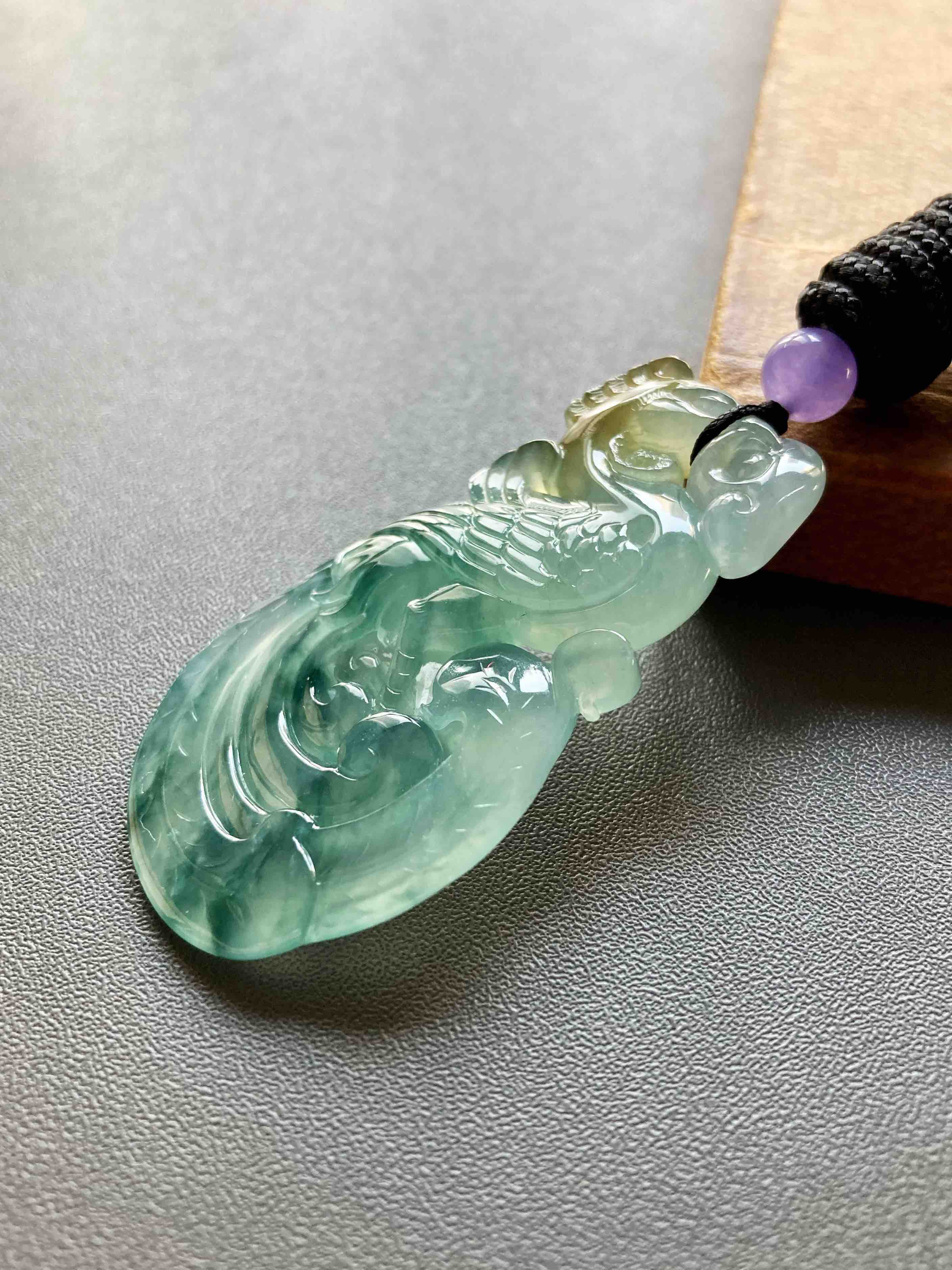 美极了,高冰种飘花翡翠凤凰,51.2×27.5×6.2mm,种水晶莹剔透,荧光四射,种气极老,果冻般胶质感强烈,雕工精美无比,飘花灵动写意,凤凰口衔如意,寓意吉祥如意,头顶黄翡俏色,寓意鸿运当头,大气宝贝,女士佩戴绝佳