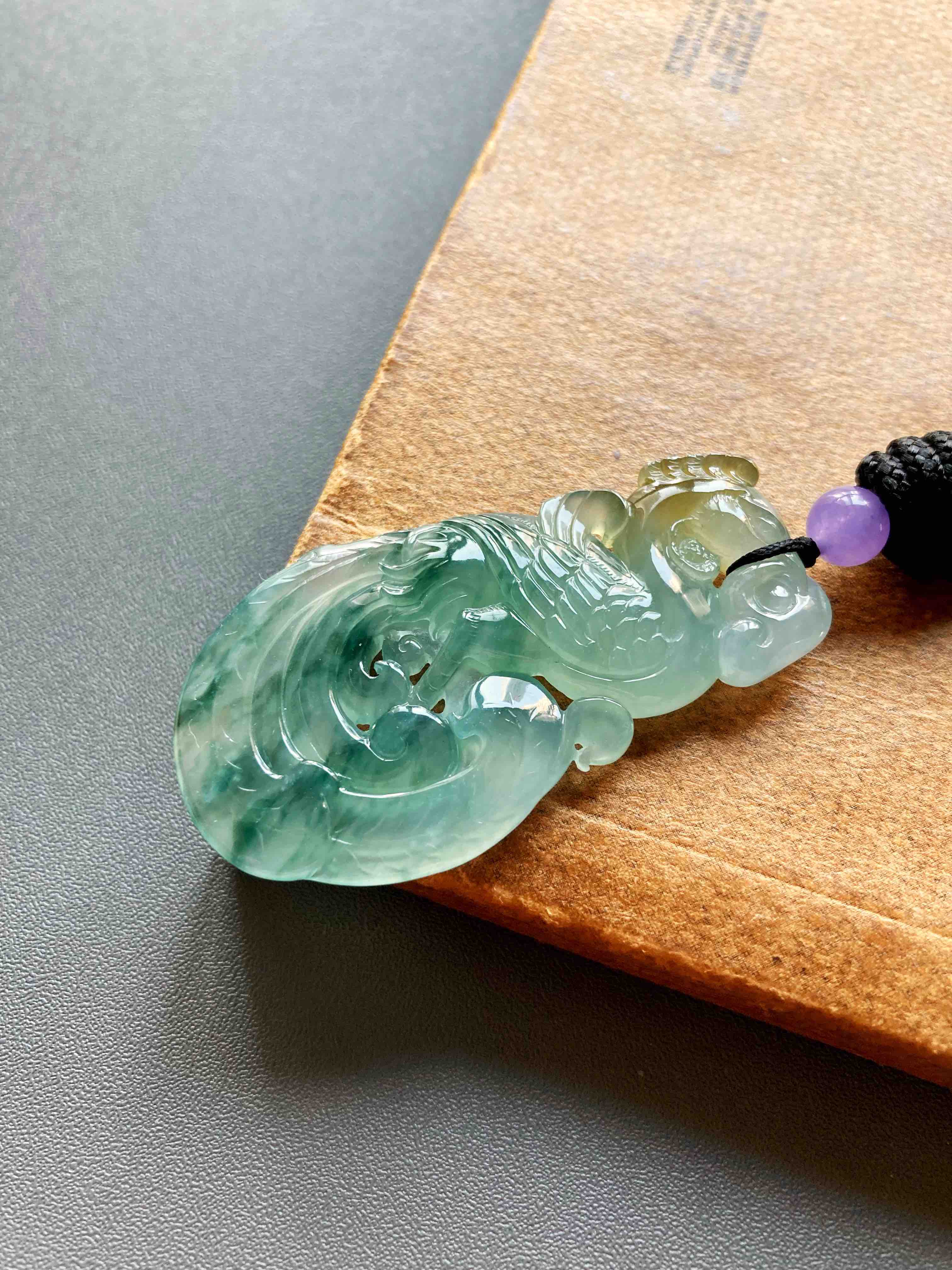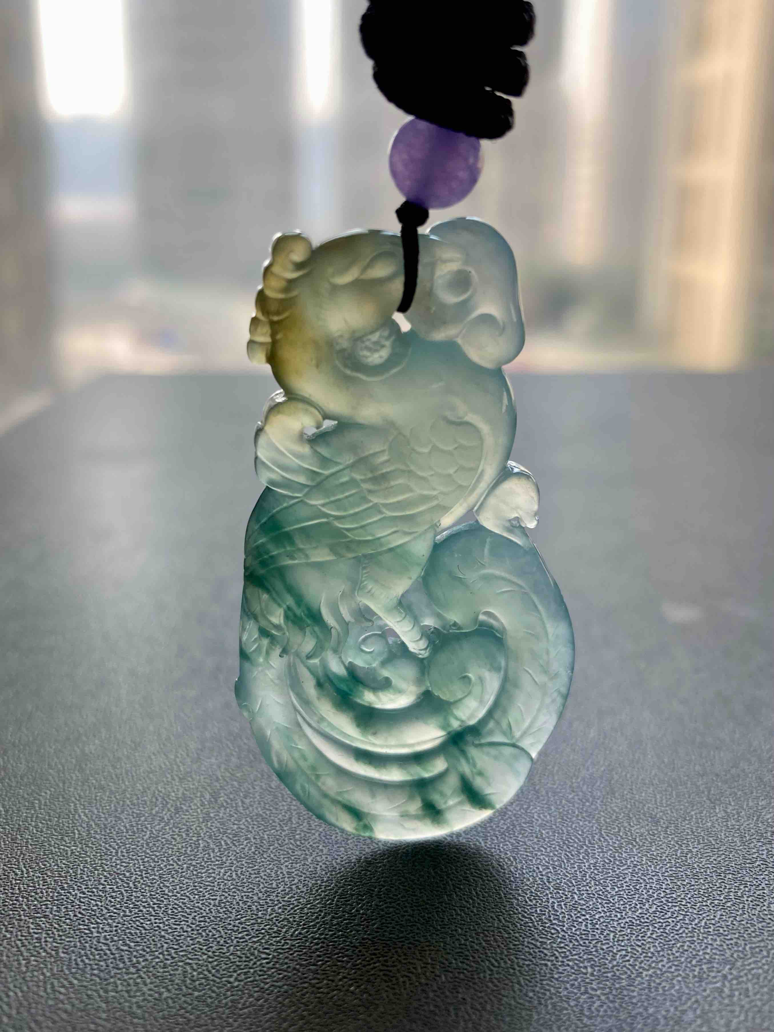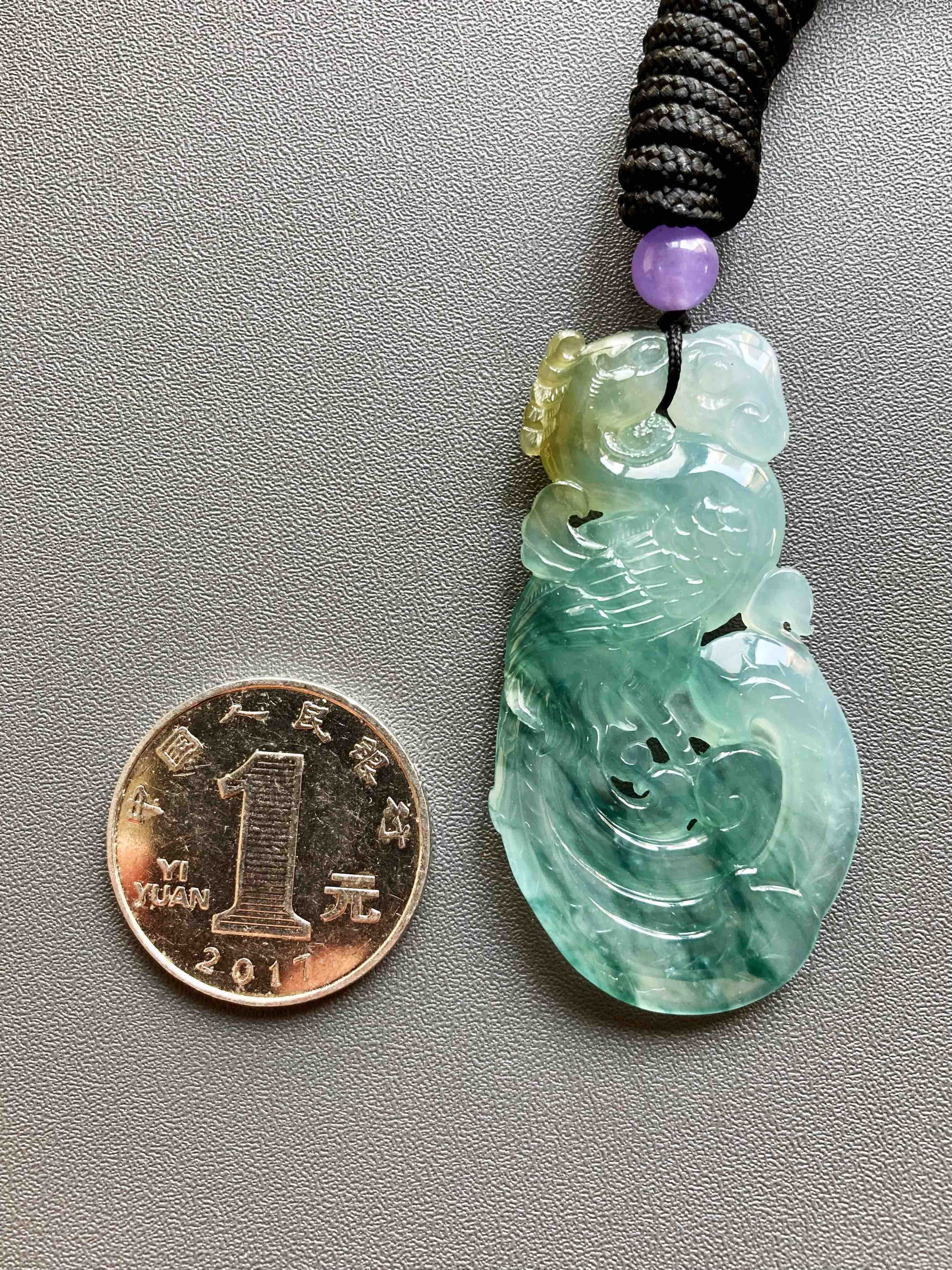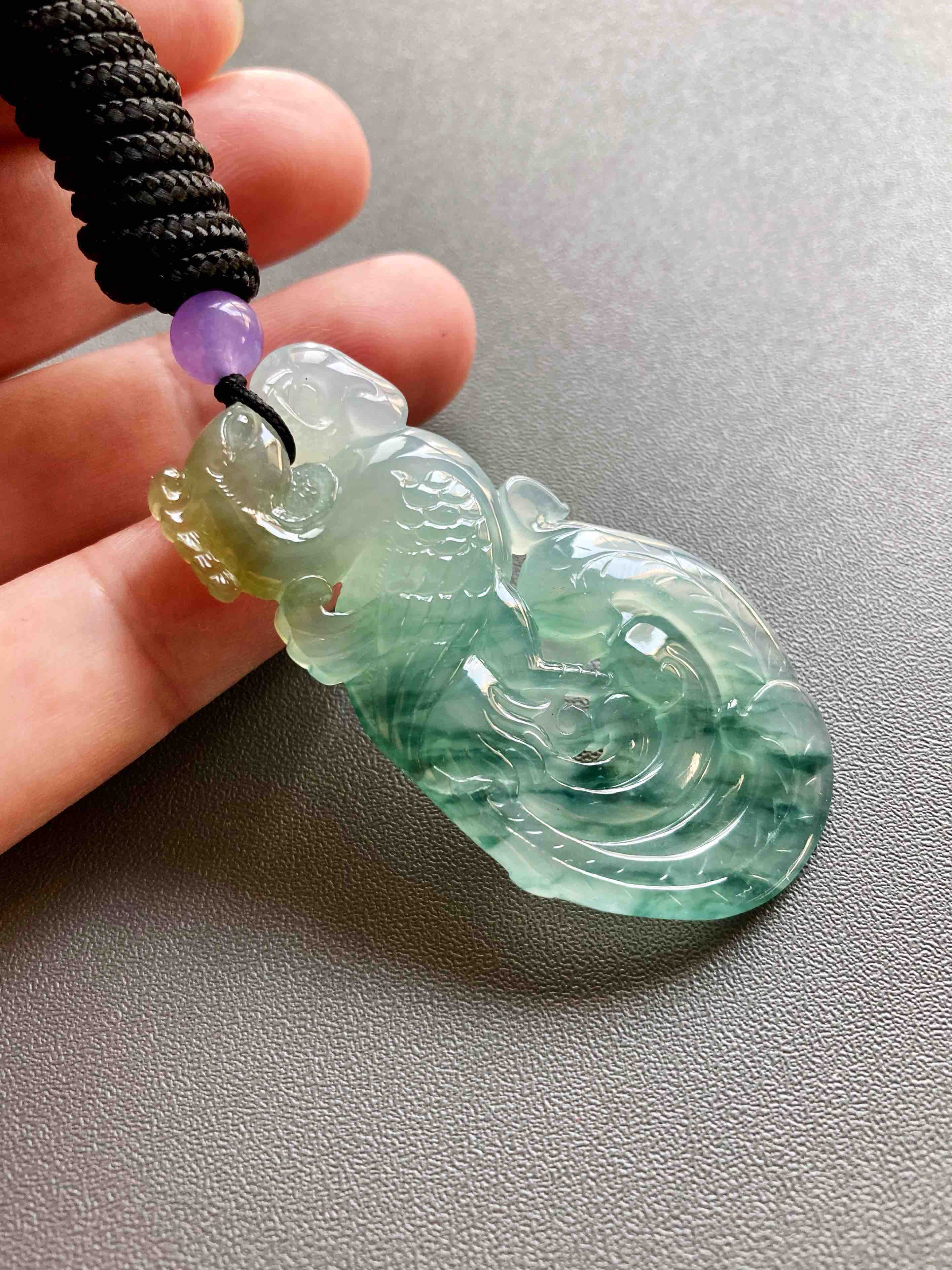 美极了,高冰种飘花翡翠凤凰,51.2×27.5×6.2mm,种水晶莹剔透,荧光四射,种气极老,果冻般胶质感强烈,雕工精美无比,飘花灵动写意,凤凰口衔如意,寓意吉祥如意,头顶黄翡俏色,寓意鸿运当头,大气宝贝,女士佩戴绝佳