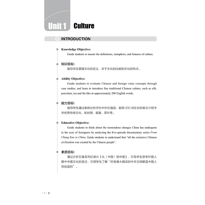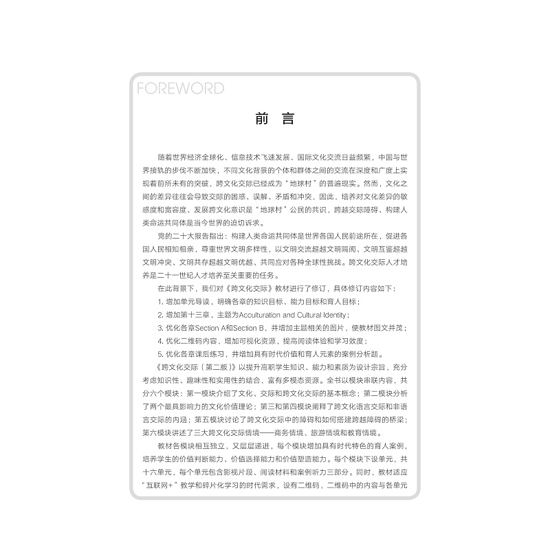 本教材面向高职学生,是集视频、音频、拓展资源等为一体的多模态教材。教材共15章,每个模块章节包括;课前影视片段欣赏;跟我学;跟我做和;自己做四个方面。教材从跨文化交际的基本概念入手,以影视片段、相关文章和交际案例等视听素材为载体,通过视听、阅读以及师生、生生之间的口语交互活动来增强学生的跨文化意识。 本教材依托省在线开放课程;跨文化交际,包括30个微课教学视频和大量的习题库、案例,目前面向三所院校的600多名学生,且未来数量还将扩大。