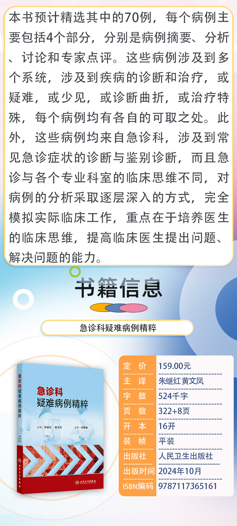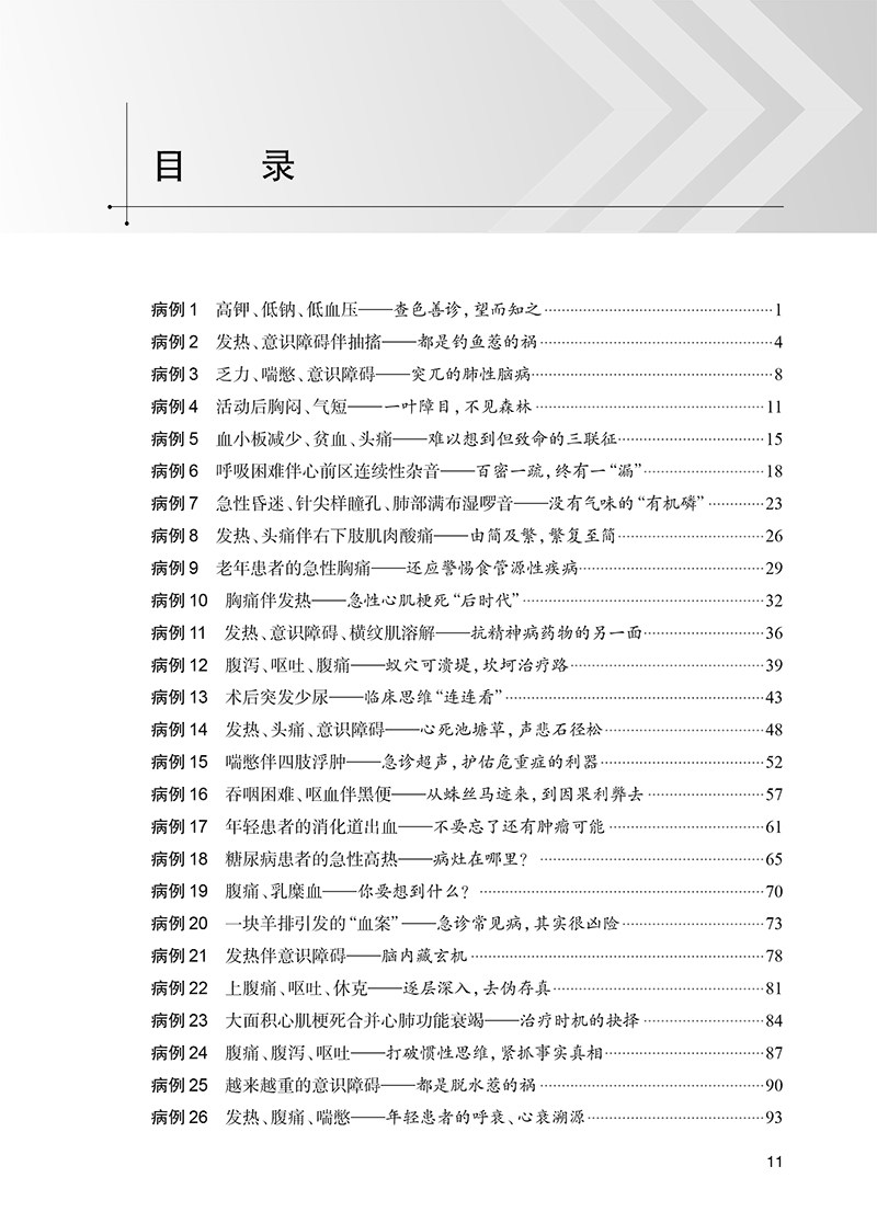 本书预计精选其中的70例,每个病例主要包括4个部分,分别是病例摘要、分析、讨论和专家点评。这些病例涉及到多个系统,涉及到疾病的诊断和治疗,或疑难,或少见,或诊断曲折,或治疗特殊,每个病例均有各自的可取之处。此外,这些病例均来自急诊科,涉及到常见急诊症状的诊断与鉴别诊断,而且急诊与各个专业科室的临床思维不同,对病例的分析采取逐层深入的方式,完全模拟实际临床工作,重点在于培养医生的临床思维,提高临床医生提出问题、解决问题的能力。