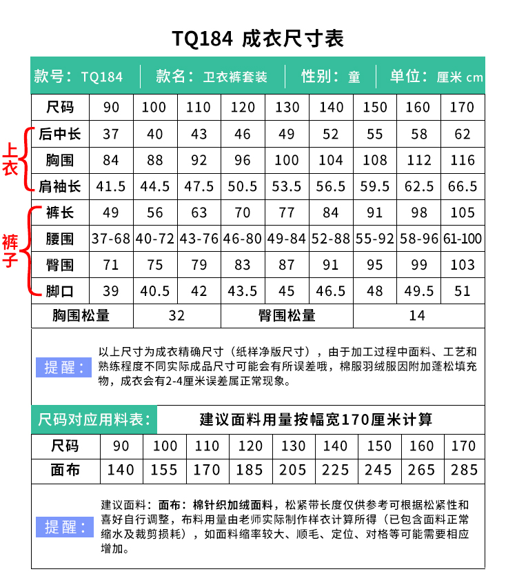 裁缝学苑TQ184儿童加绒宽松连帽卫衣纸样卫裤套运动服打版裁剪图纸