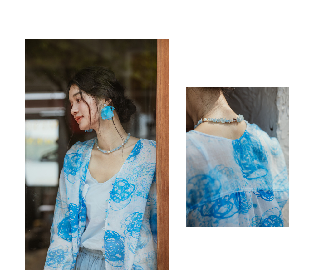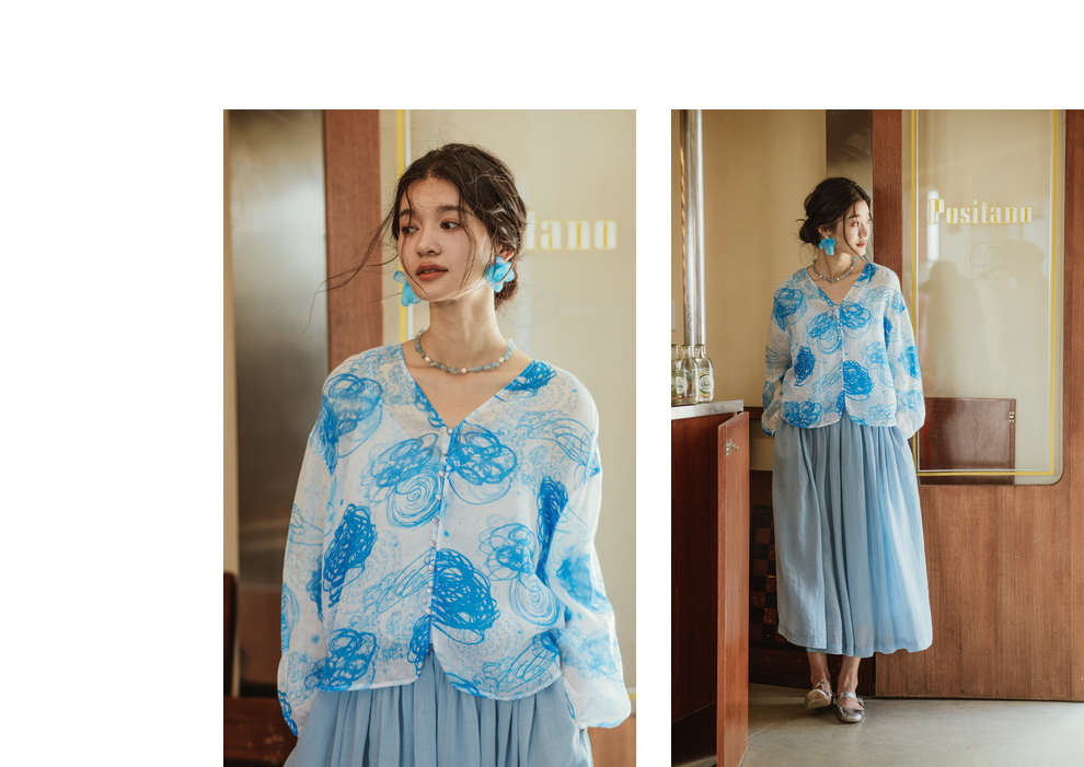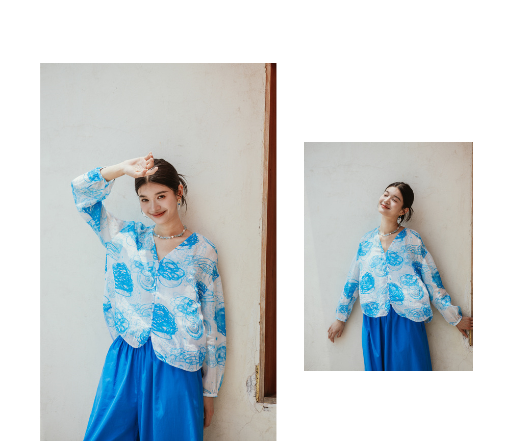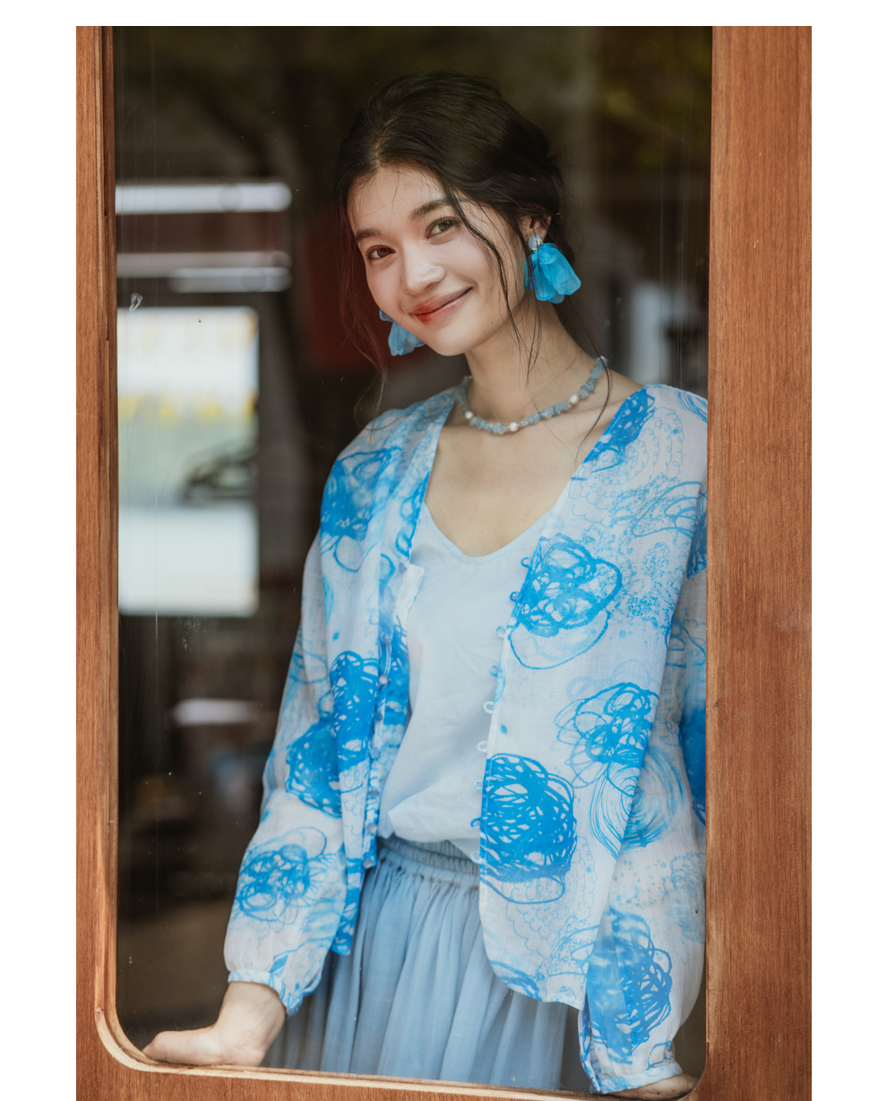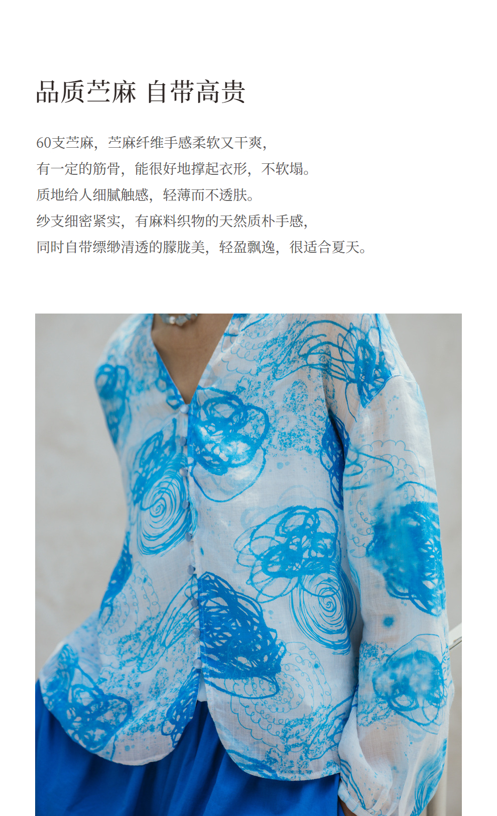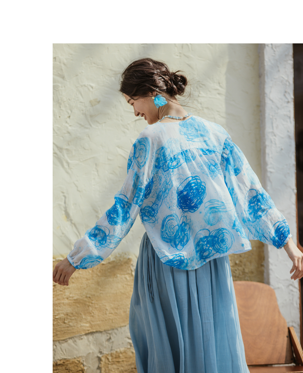 绽放380朵【入蓝系列】克莱因蓝高端60支苎麻印花v领泡泡袖衬衫