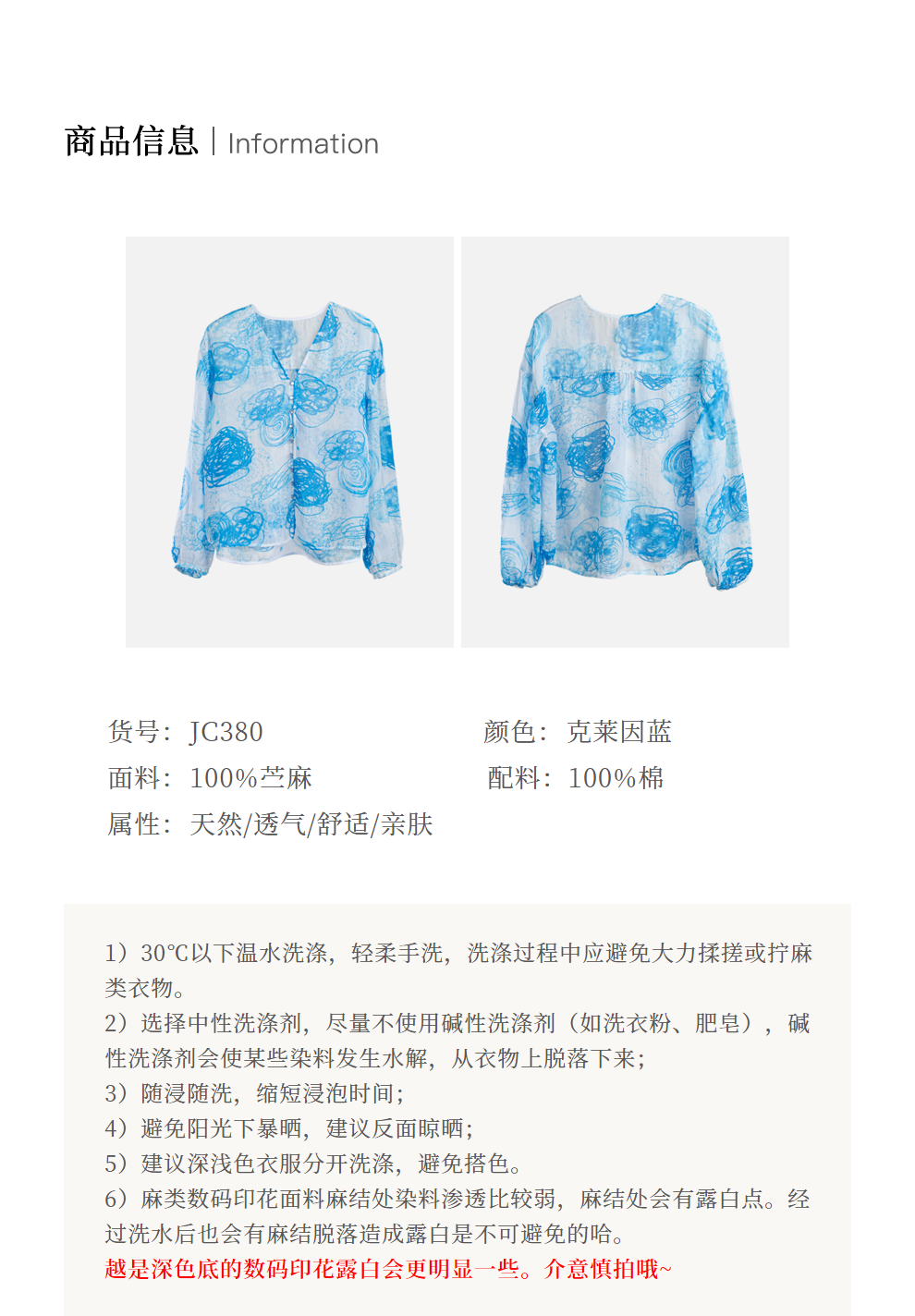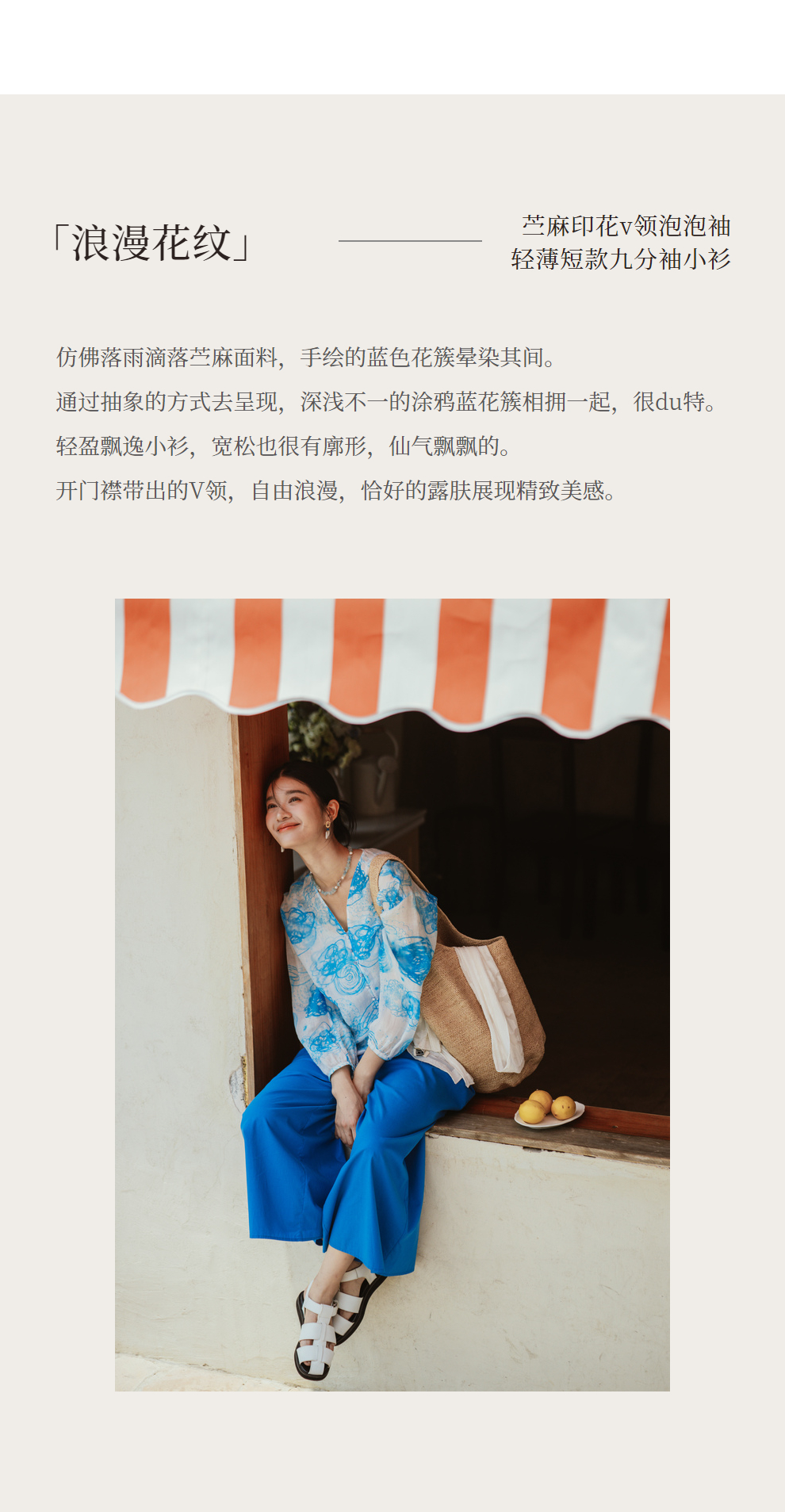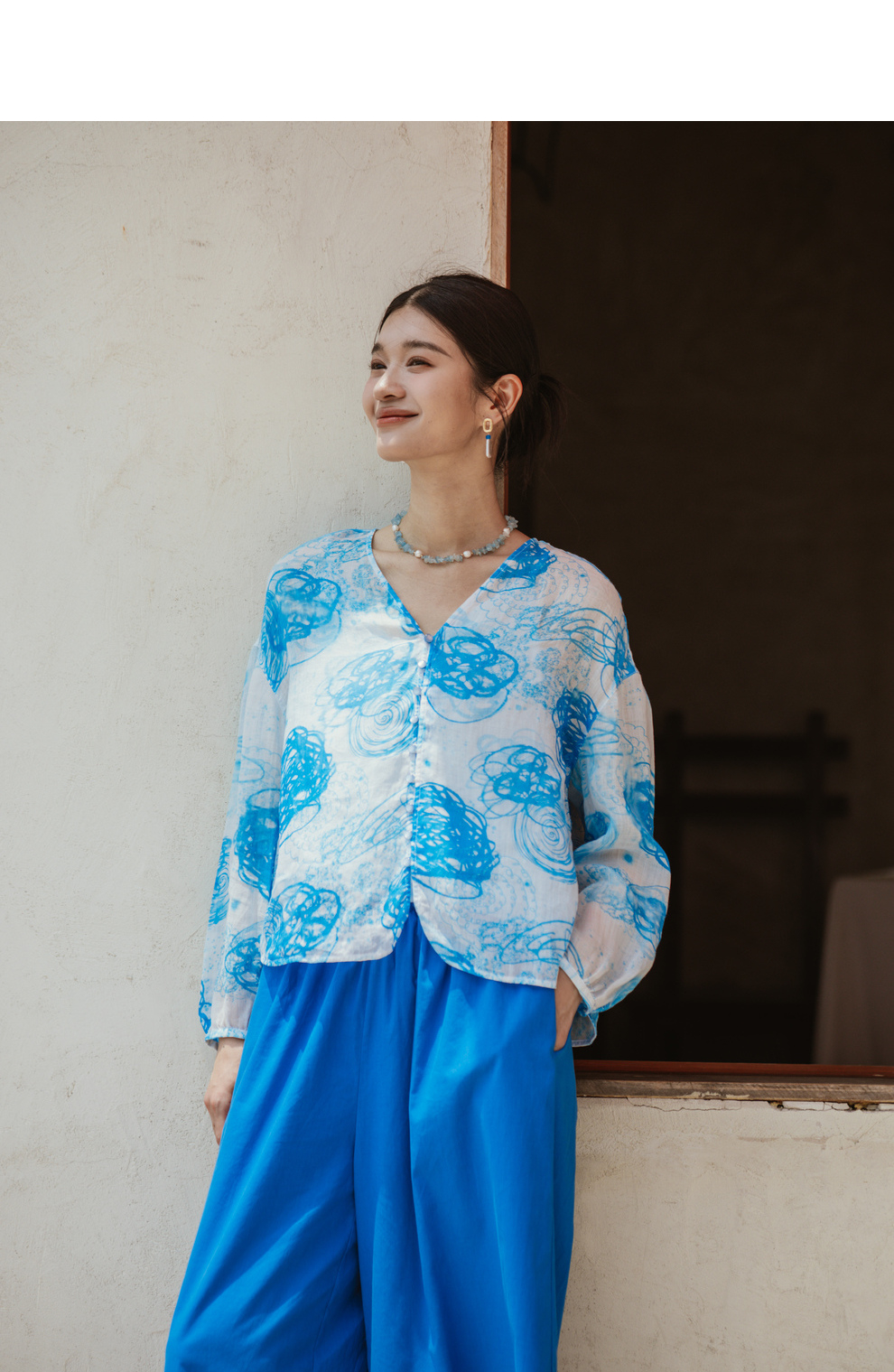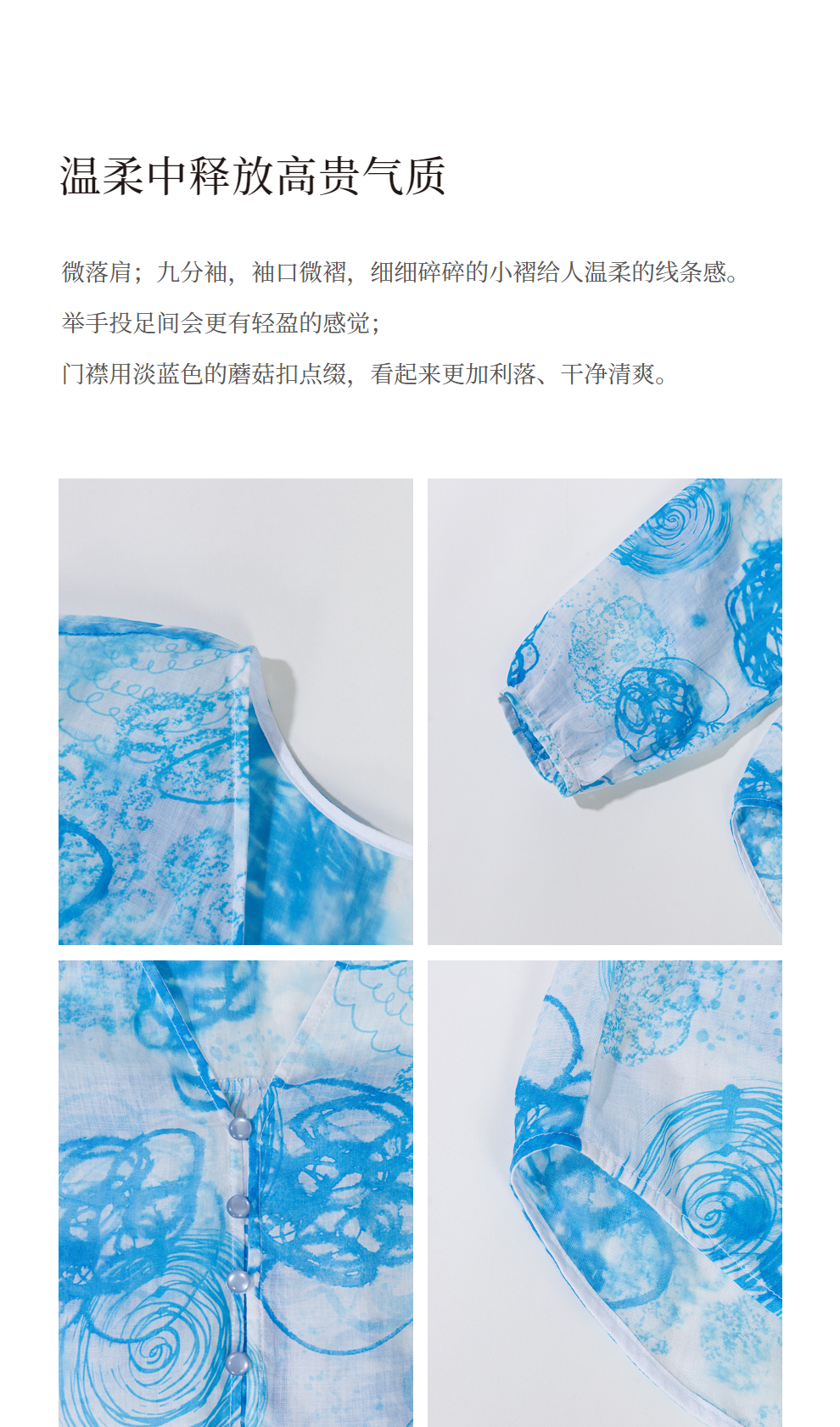 绽放380朵【入蓝系列】克莱因蓝高端60支苎麻印花v领泡泡袖衬衫