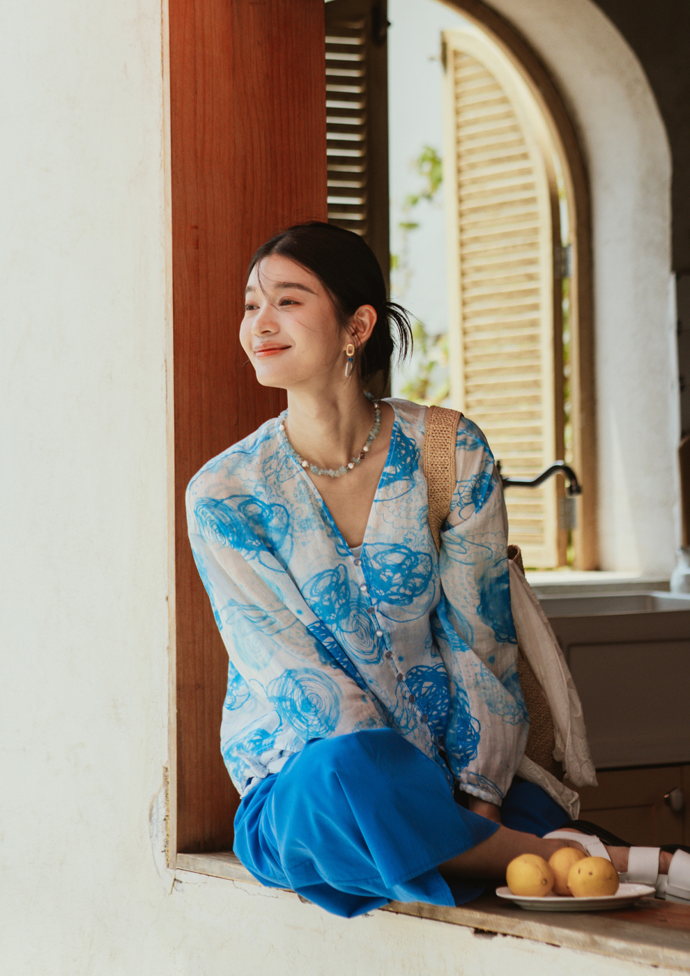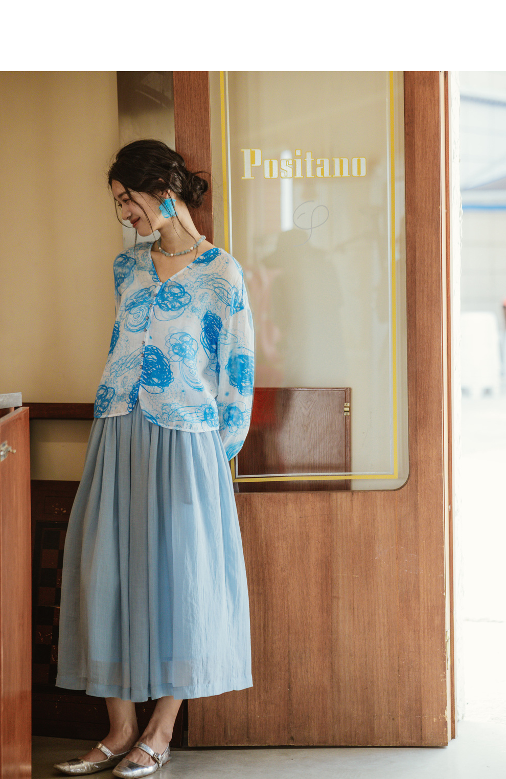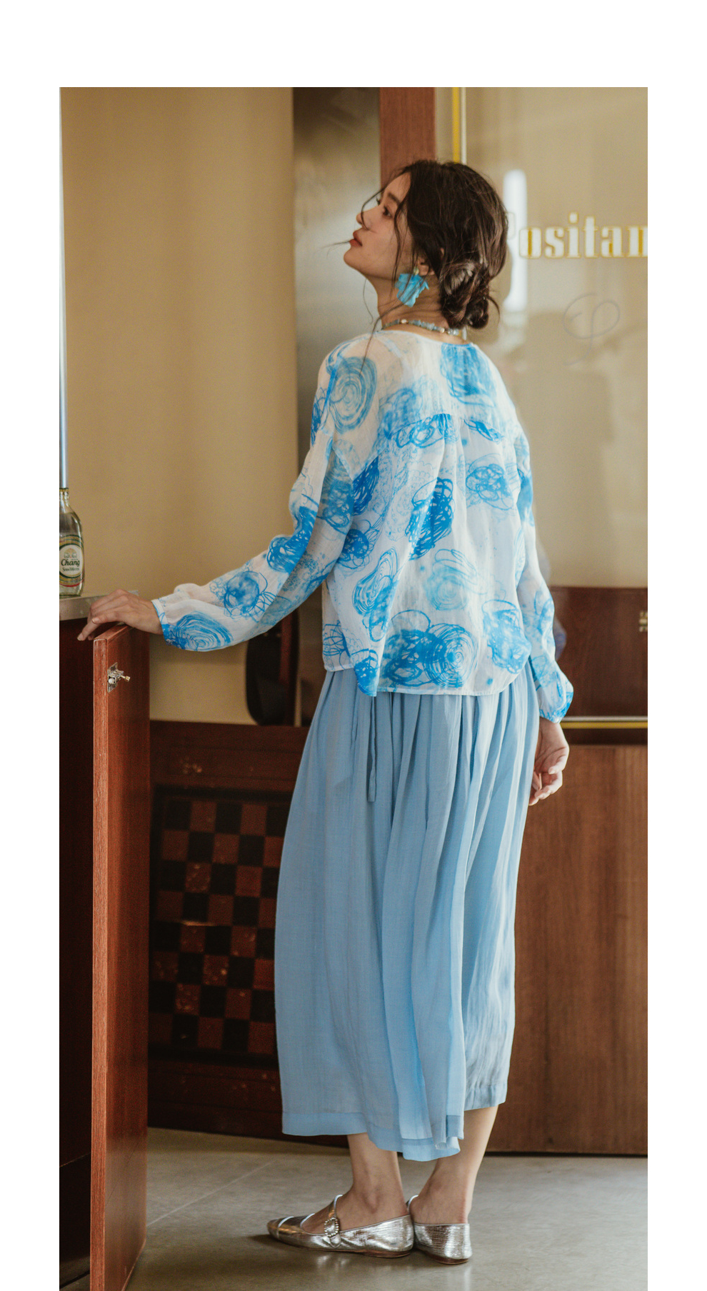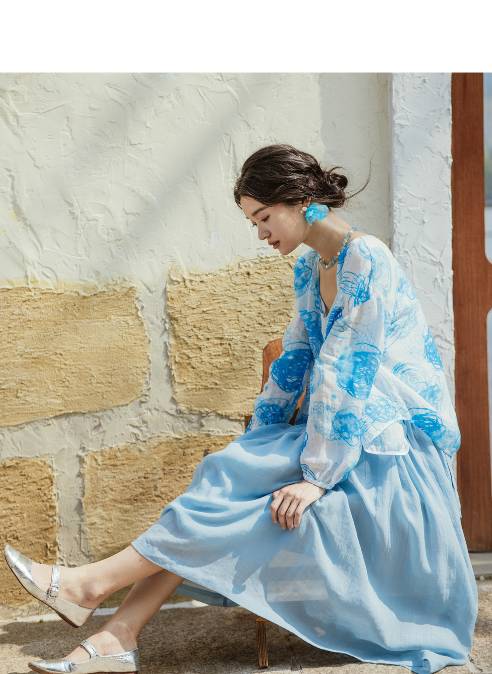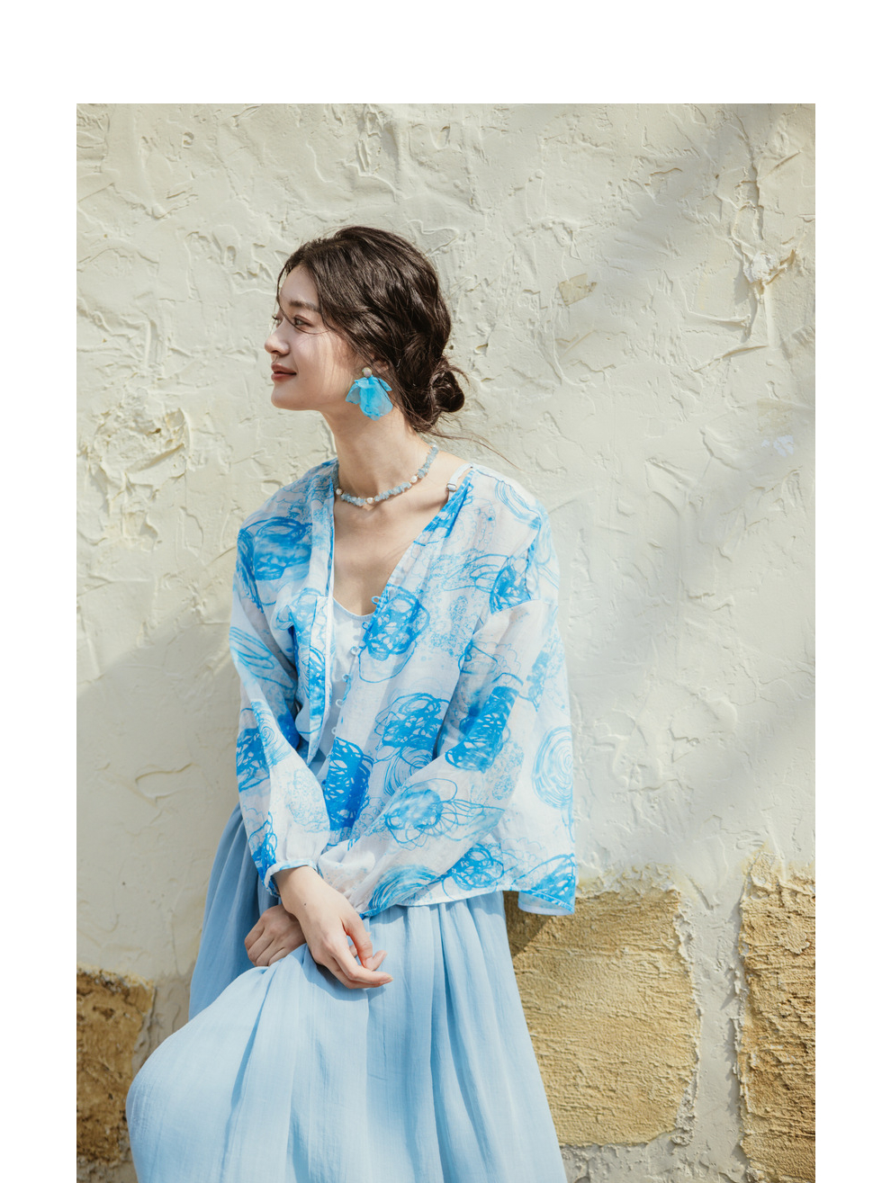 绽放380朵【入蓝系列】克莱因蓝高端60支苎麻印花v领泡泡袖衬衫