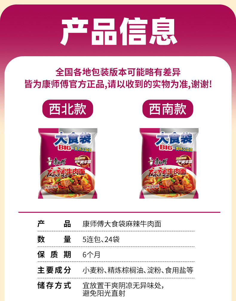 康师傅方便面 BIG大食袋 麻辣牛肉面 143g 泡面速食