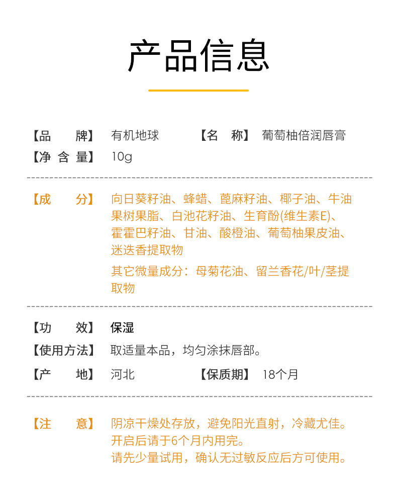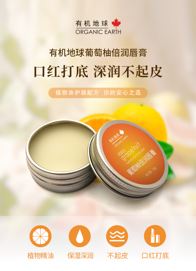 有机地球葡萄柚倍润唇膏10g植物保湿