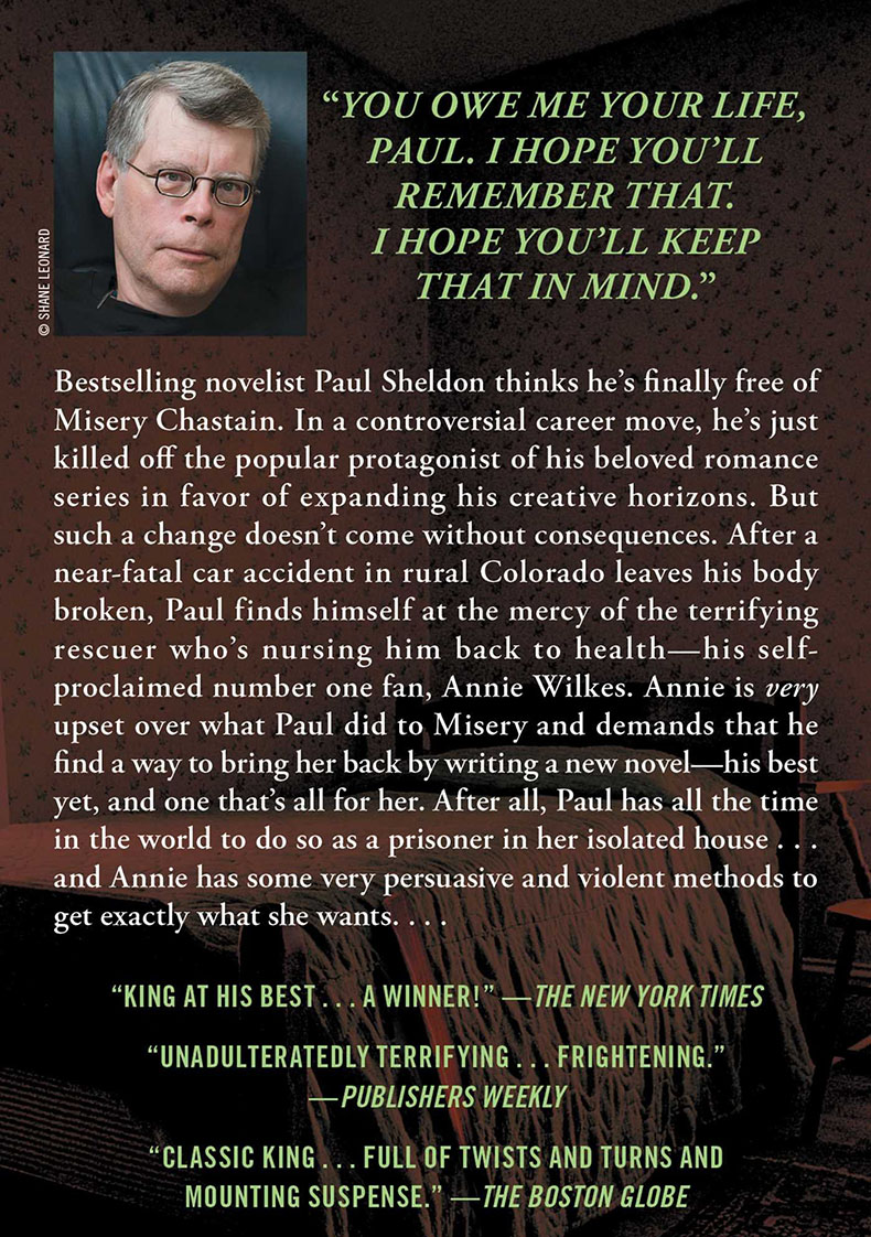 Bestselling novelist Paul Sheldon thinks he's finally free of Misery Chastain. In a controversial career move, he's just killed off the popular protagonist of his beloved romance series in favor of expanding his creative horizons. But such change doesn't come without consequences. After a near-fatal car accident in rural Colorado leaves his body broken, Paul finds himself at the mercy of the terrifying rescuer who's nursing him back to health--his self-proclaimed number one fan, Annie Wilkes. Annie is very upset over what Paul did to Misery, and demands that he find a way to bring her back by writing a new novel--his best yet, and one that's all for her. After all, Paul has all the time in the world to do so as a prisoner in her isolated house...and Annie has some very persuasive and violent methods to get exactly what she wants....