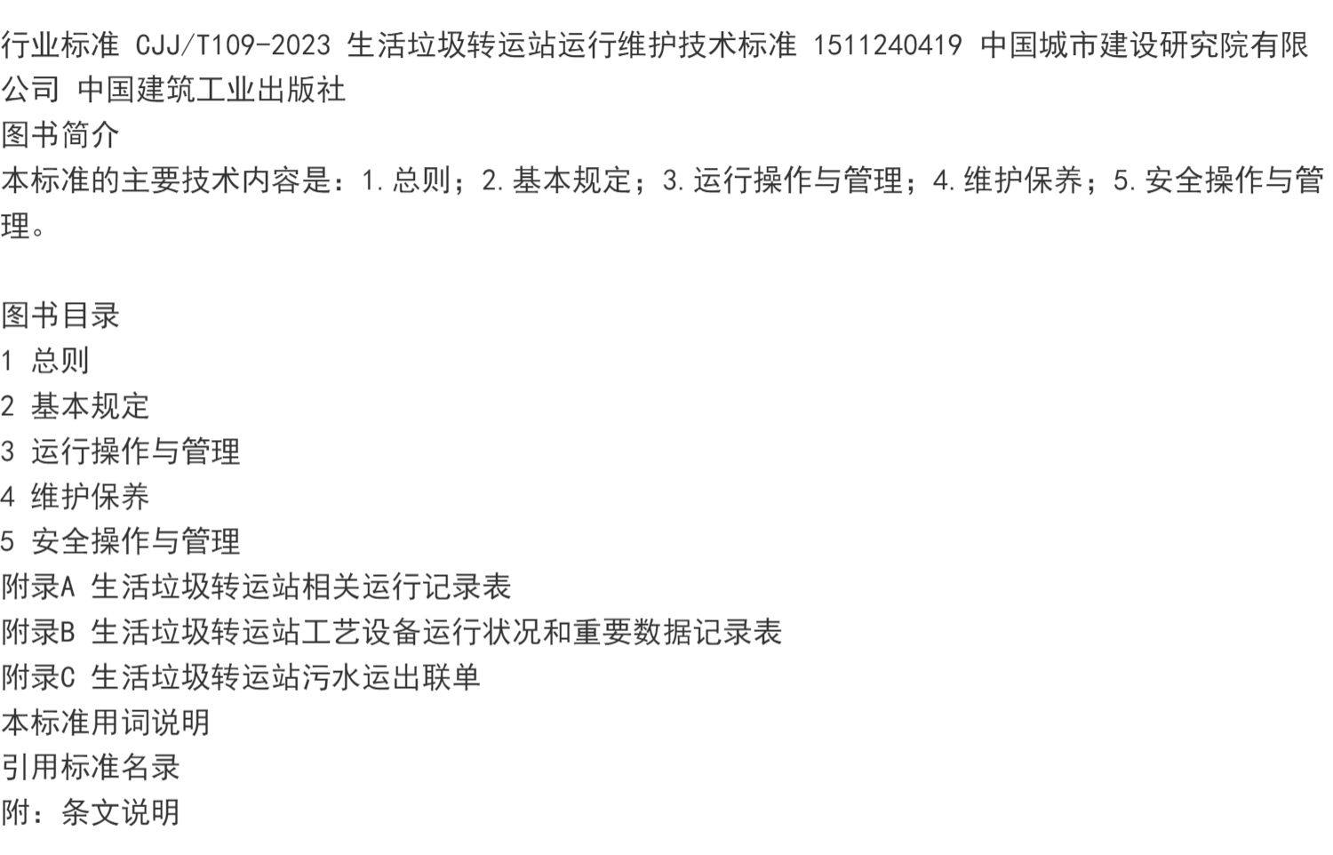 CJJ/T109-2023 生活垃圾转运站运行维护技术标准