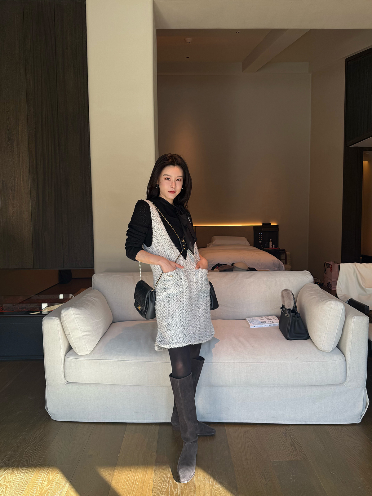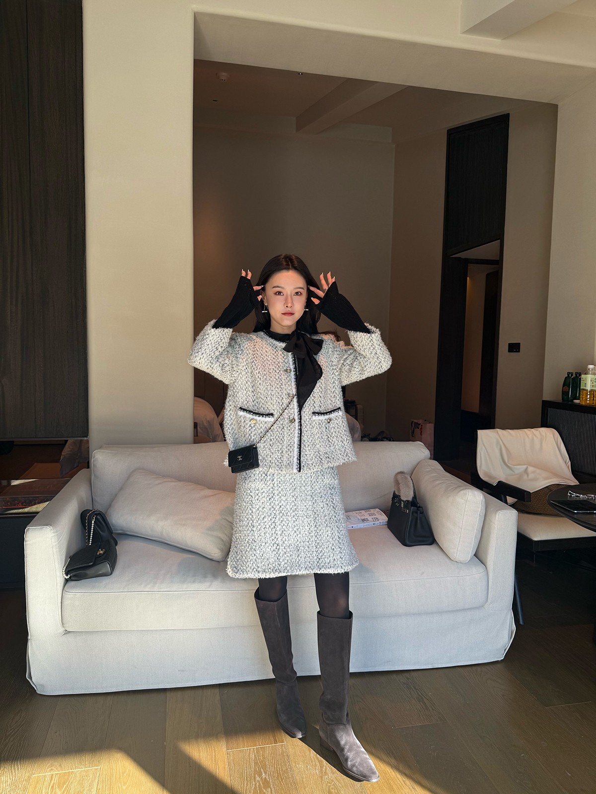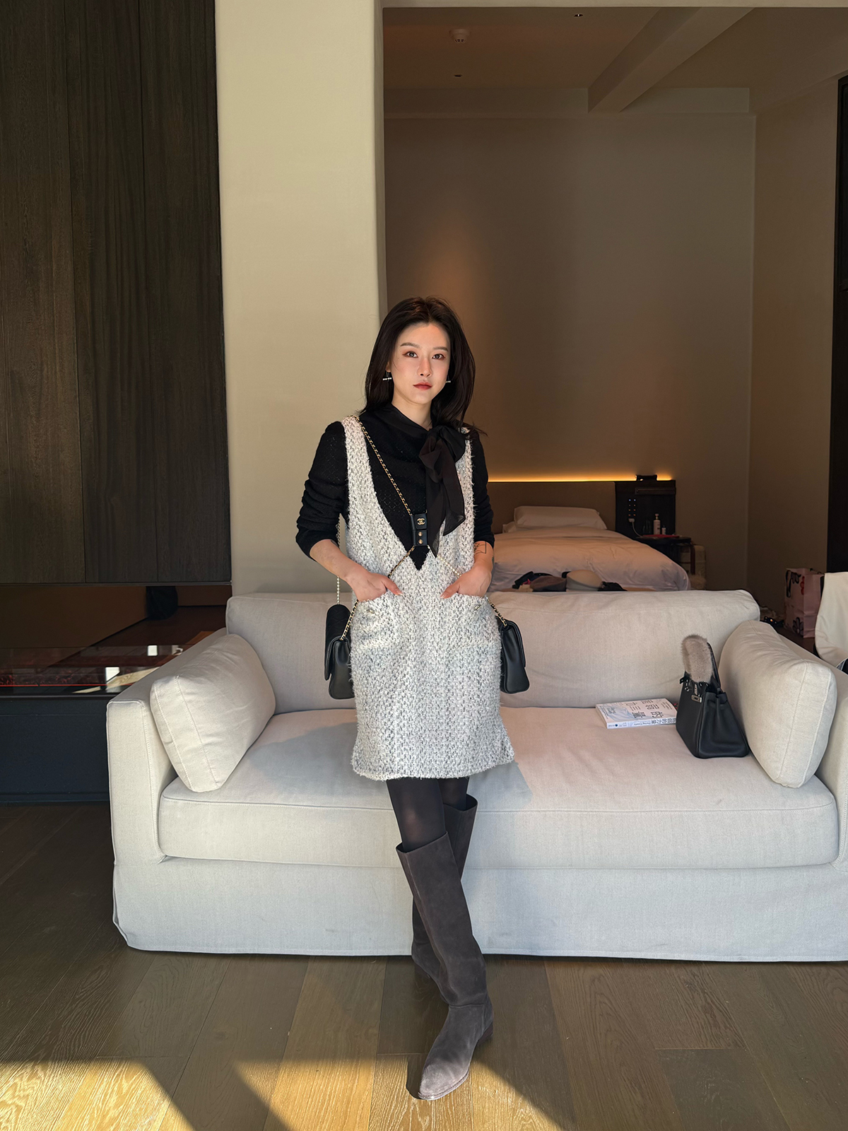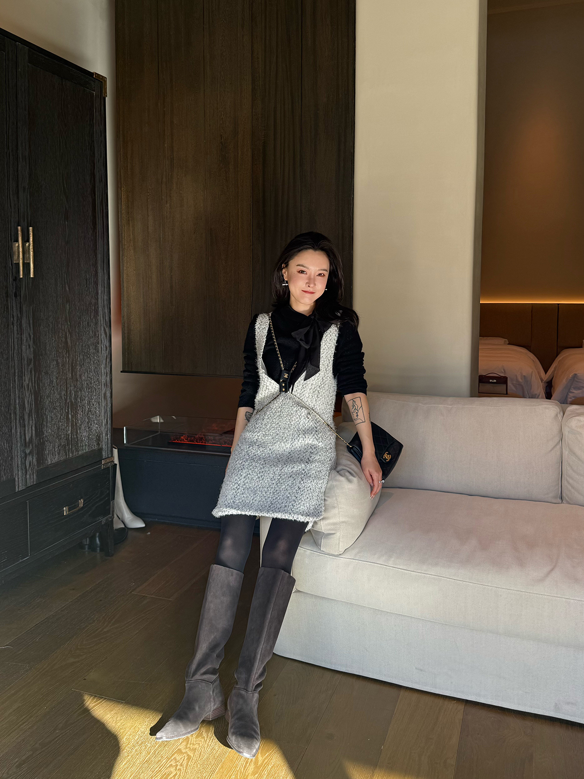 DUO智仙生 黑标 煎盐叠雪 白色粗花呢外套和背带连衣裙