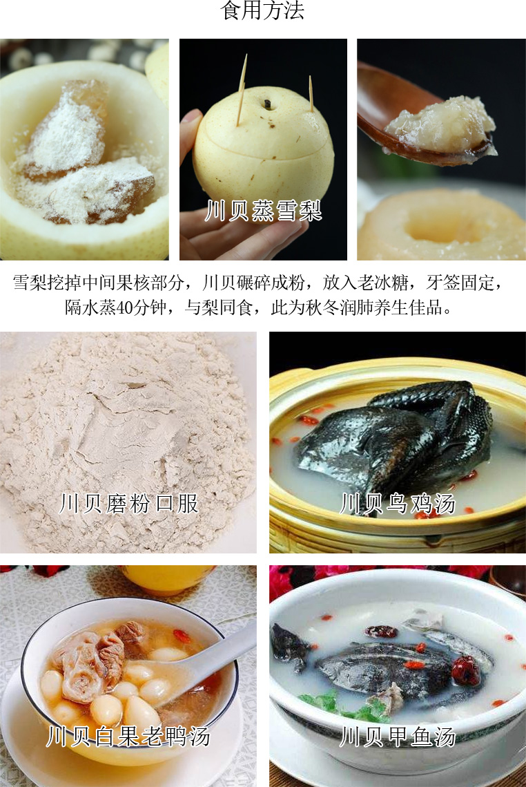 【使用方法】1.川贝蒸雪梨:雪梨挖掉中间果核部分,川贝碾碎成粉,放入老冰糖,牙签固定,隔水蒸40分钟,与梨同食,此为秋冬润肺养生佳品。