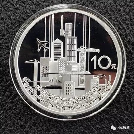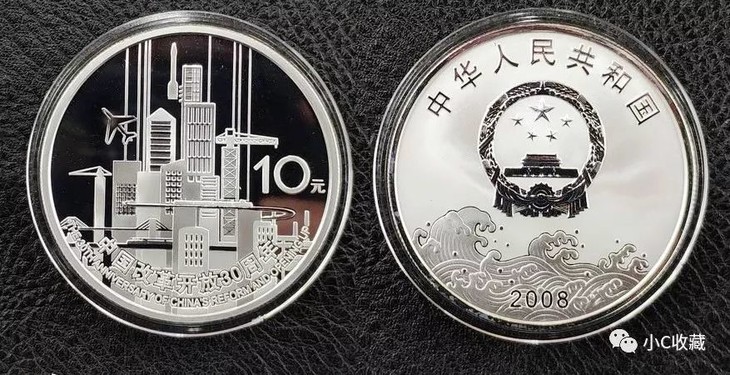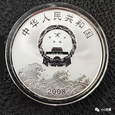 ▲银币正面图案是国徽和浪花组成,寓意改革开放乘风破浪奋勇向前的勇气。
