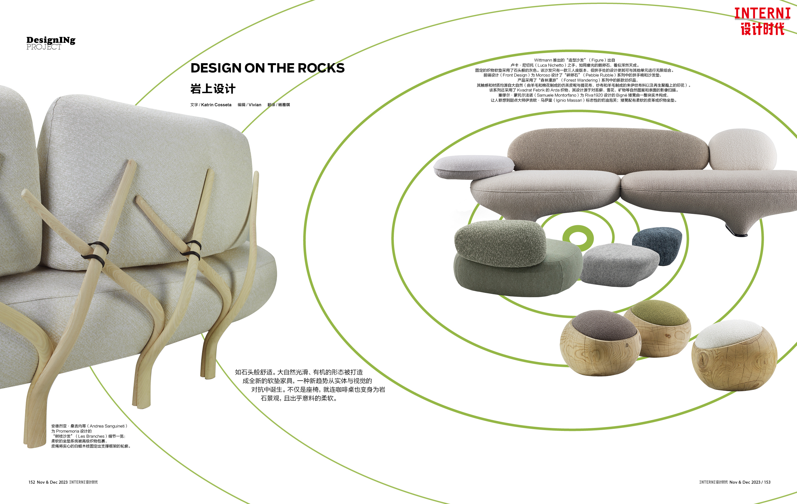 如石头般舒适。大自然光滑、有机的形态被打造成全新的软垫家具,一种新趋势从实体与视觉的对抗中诞生。不仅是座椅,就连咖啡桌也变身为岩石景观,且出乎意料的柔软。