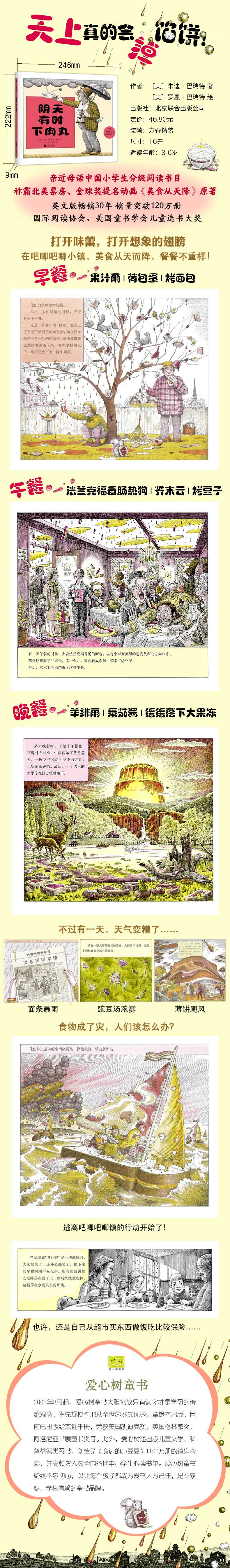 吧唧吧唧小镇和别的小镇一样,有街道、有花园、有学校。不同的是,这里没有卖食物的商店。尽管如此,小镇居民的生活中却不乏美味。因为这儿下雨的时候不下雨珠,下雪的时候不下雪花,刮来的也不只是单纯的风——从天而降的是各种美味的食物。可是有一天,天气变糟了,面包风暴、薄饼飓风、番茄龙卷风,各种坏天气接连袭来!面对堆满街道的肉丸、汉堡和番茄,人们开始害怕起来……
