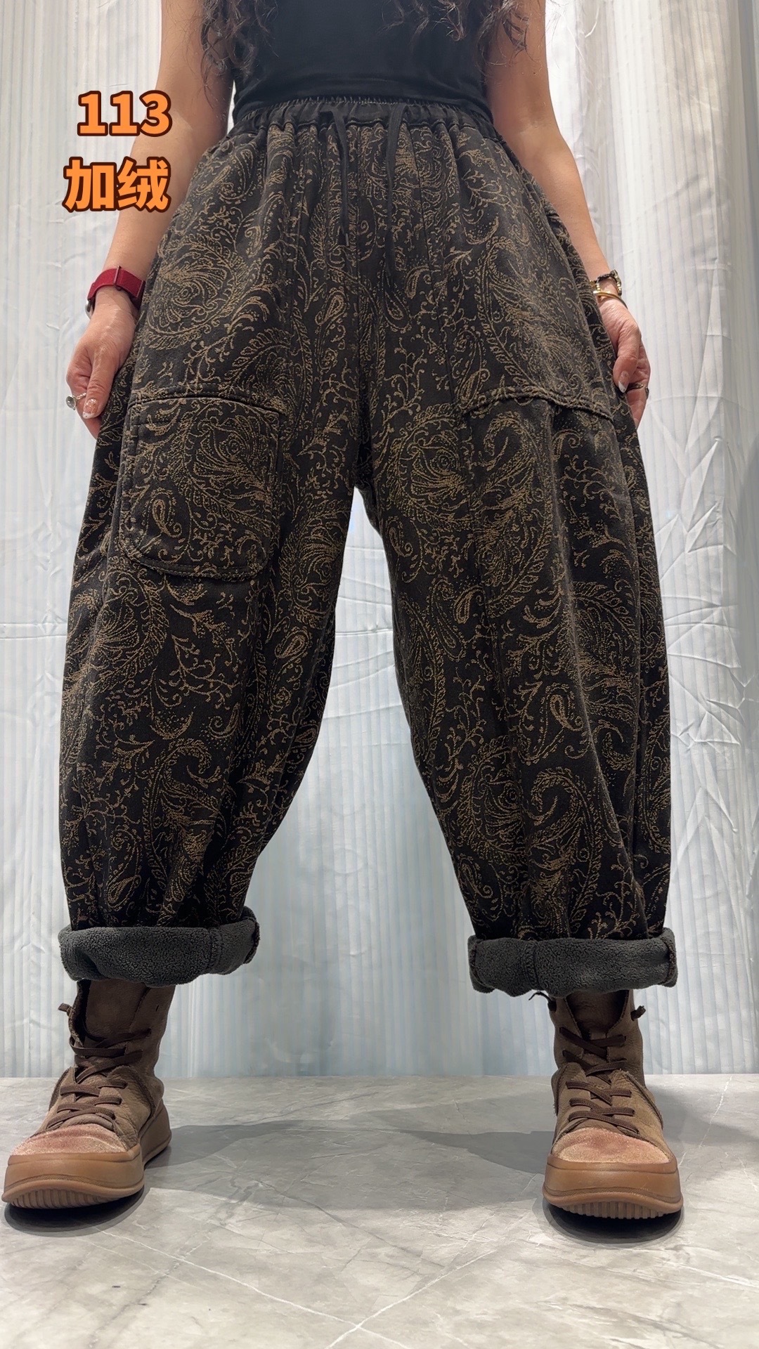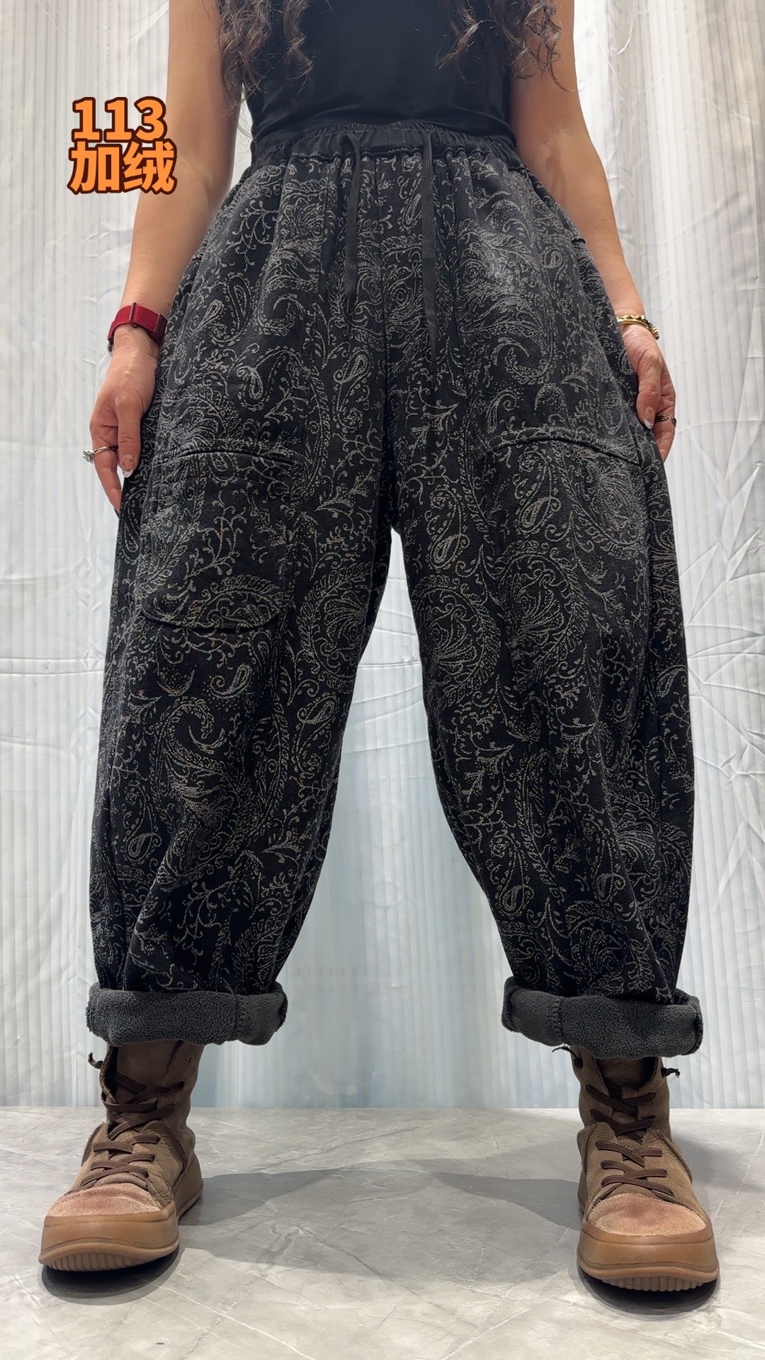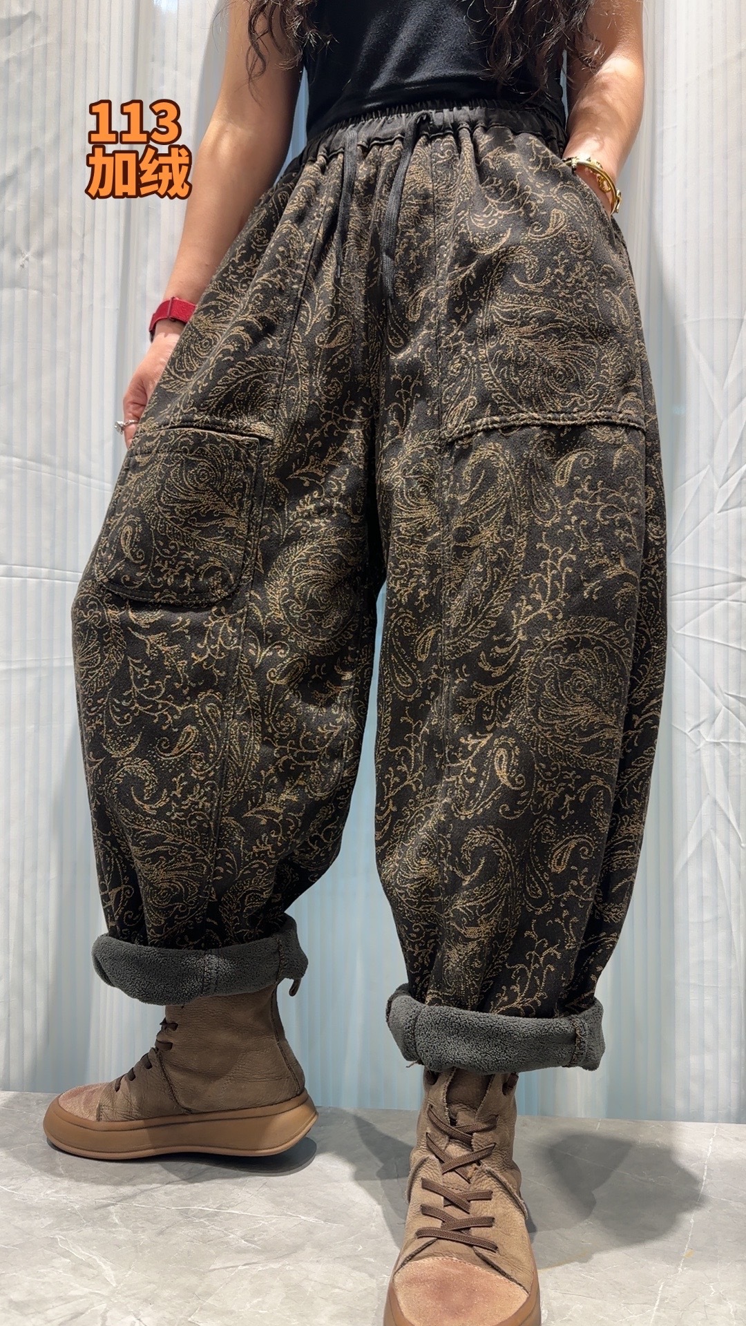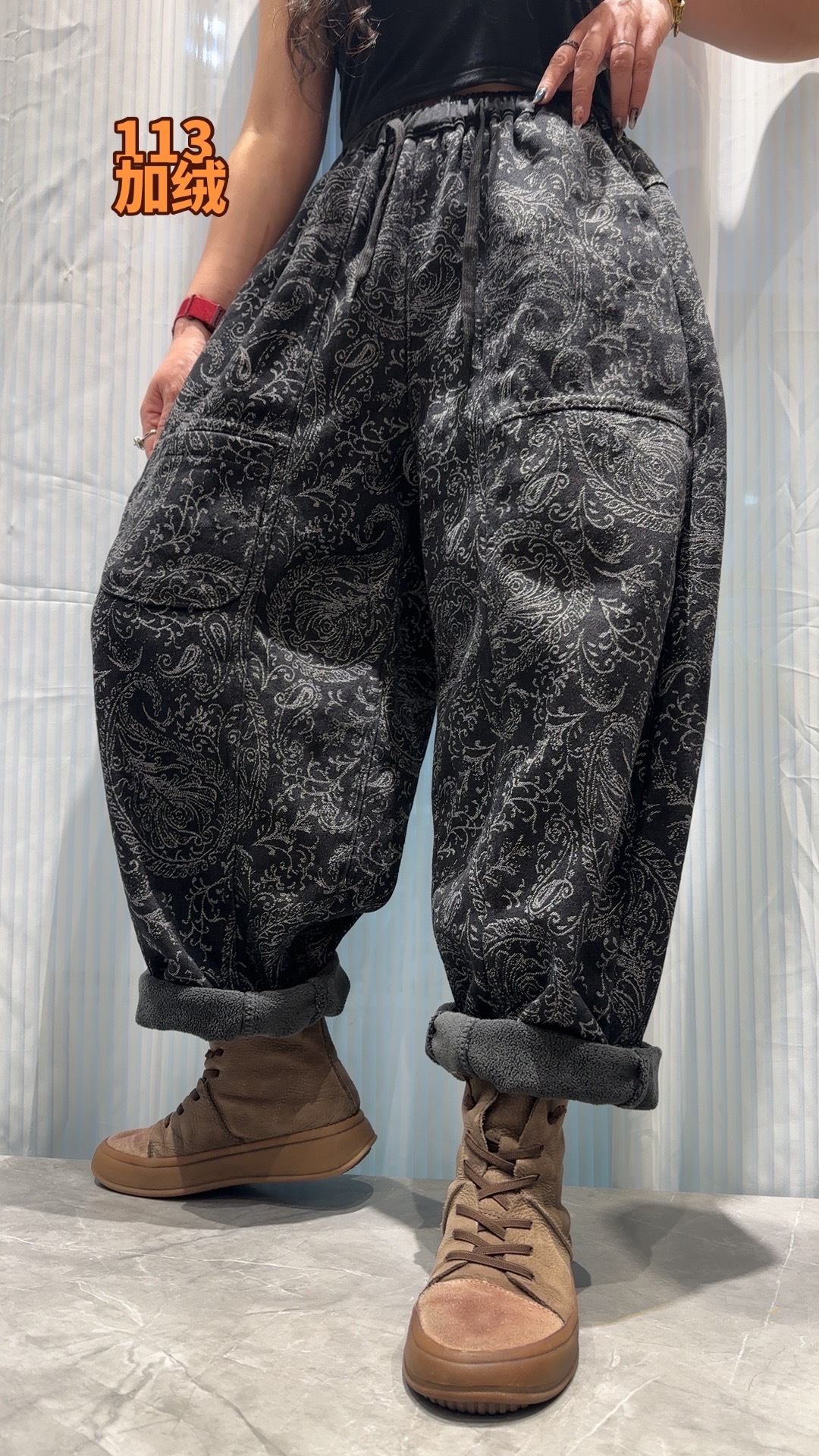 S668662025冬季新款 拼接提花贴布口袋加绒牛仔裤女 宽松高腰系带长裤女 商品图2