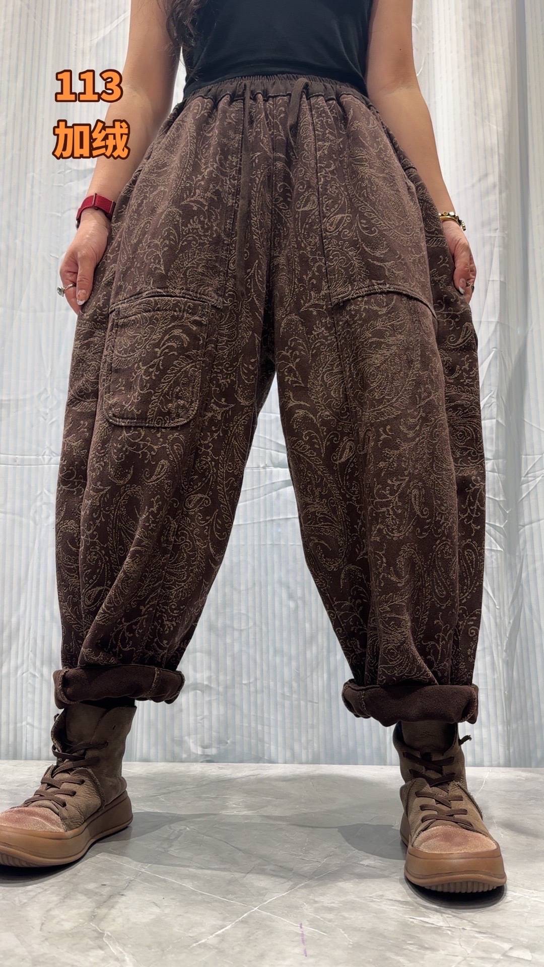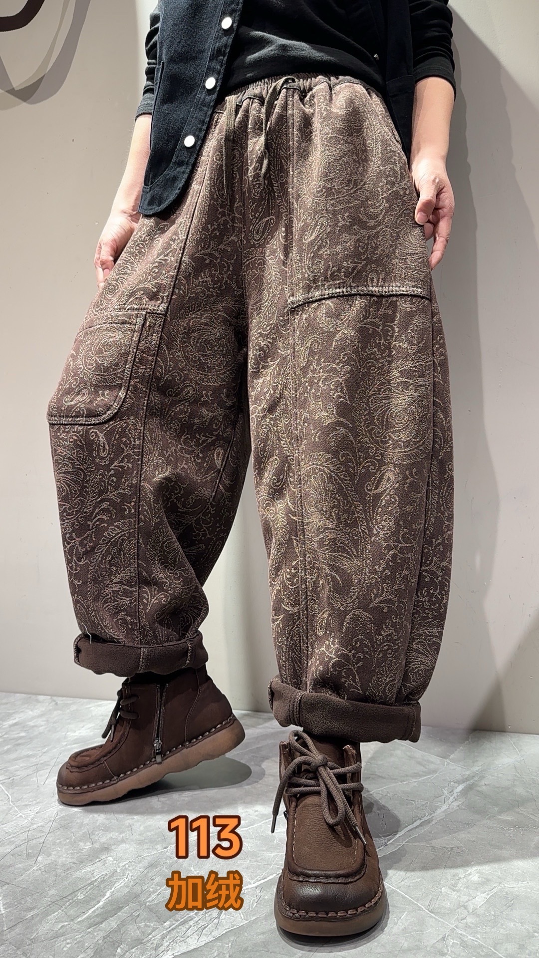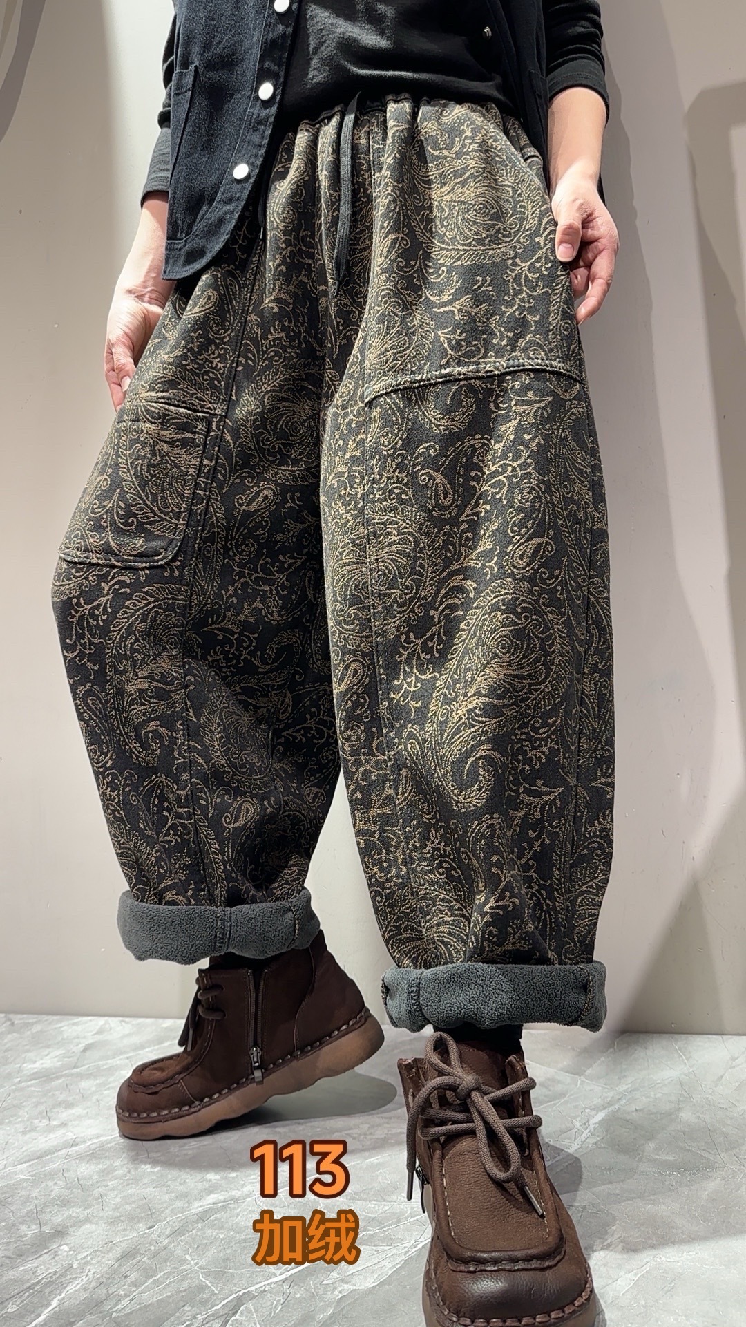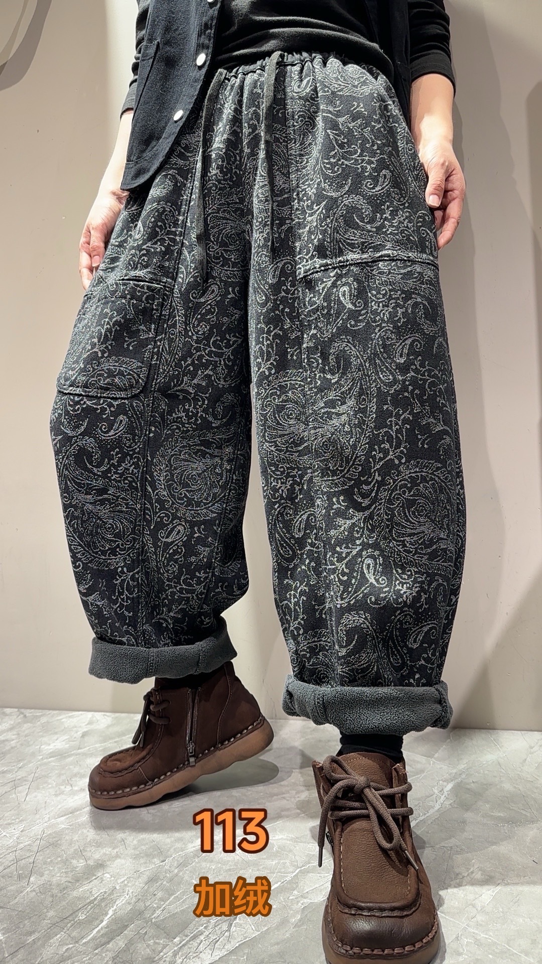 S668662025冬季新款 拼接提花贴布口袋加绒牛仔裤女 宽松高腰系带长裤女