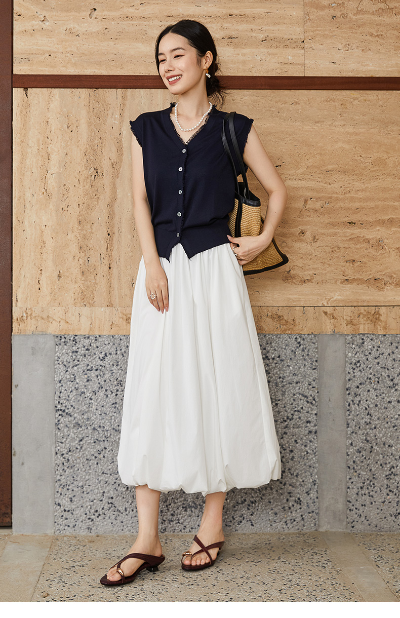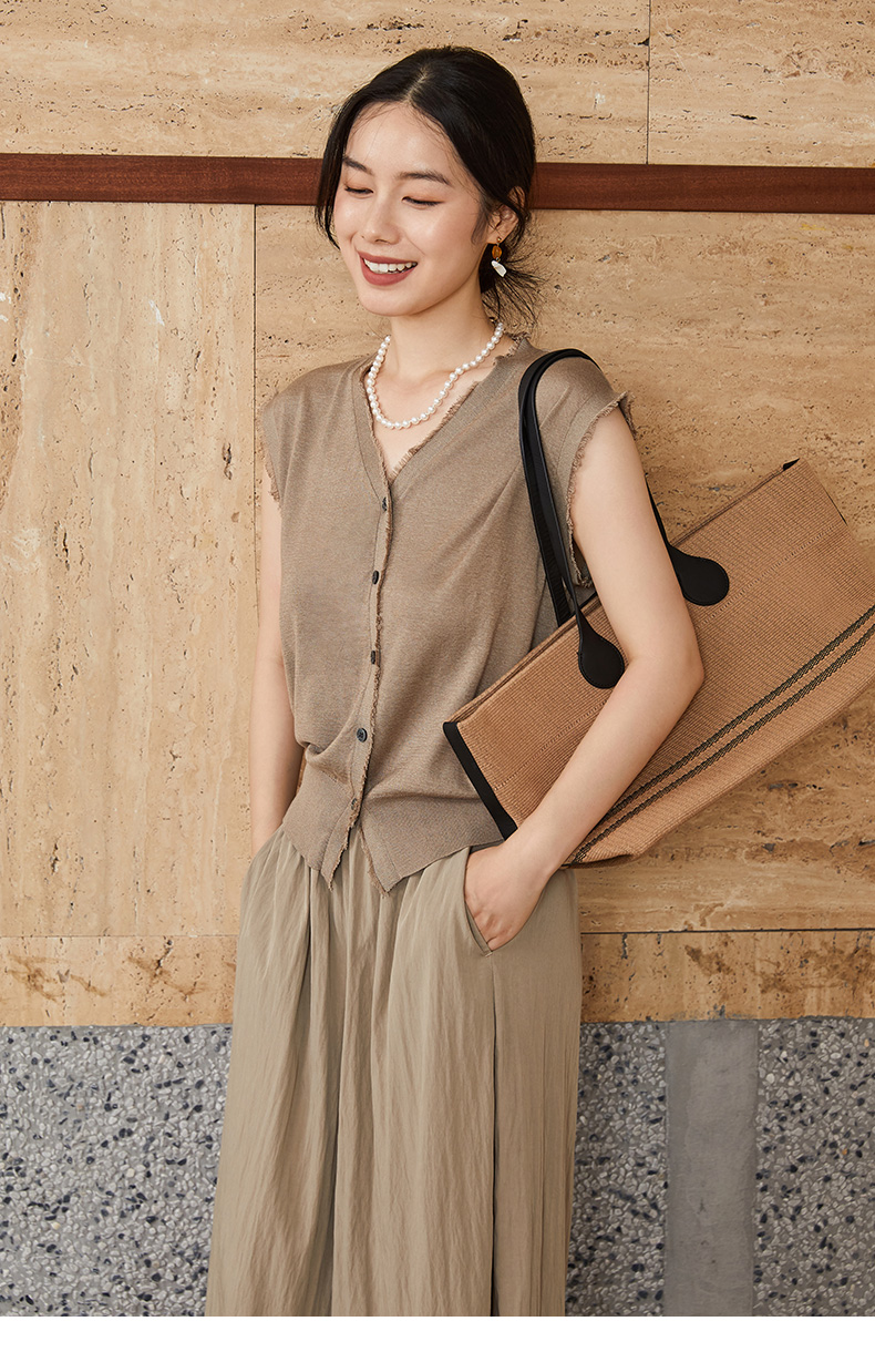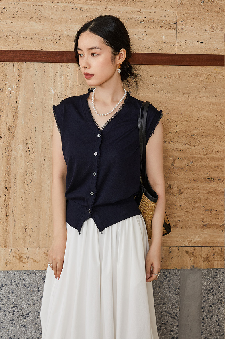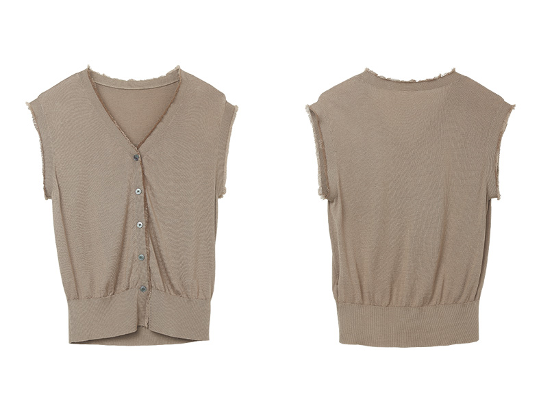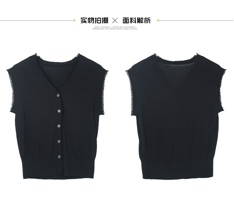 夏季新款深色针织马甲 毛边 V 领无袖透气显瘦单排扣外穿上衣