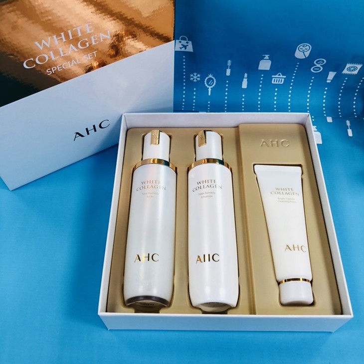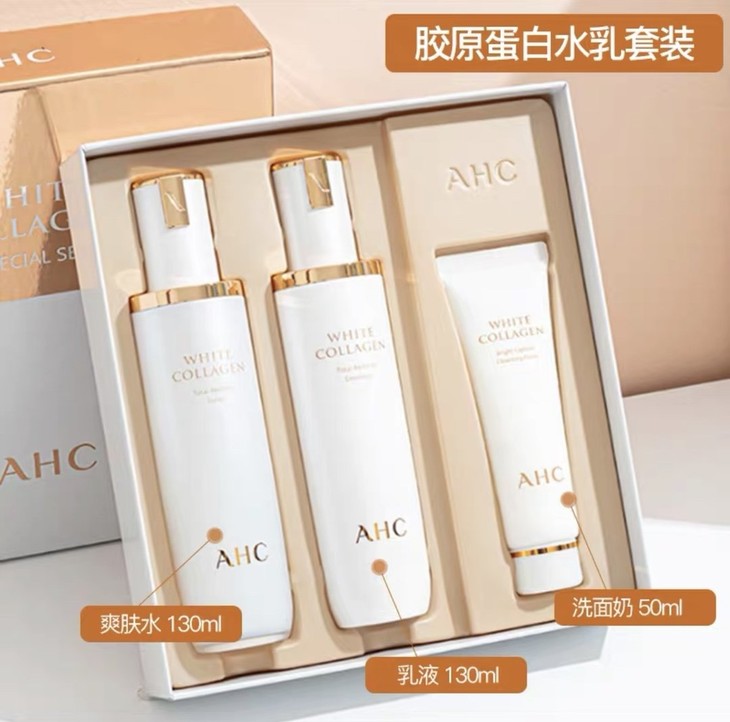 AHC胶原蛋白水乳套装👍人体胶原20岁后开始减少,40岁左右会急剧减少😱。胶原的减少会令皮肤变得没有弹性,出现皱纹,干燥,粗糙等各种皮肤衰老问题❌。AHC这个套装不仅保湿锁水💦,还能给肌肤提供缺少的营养和维生素。含有透明质酸和海洋胶原蛋白,使肌肤柔润弹力,补充肌肤弹性与营养,改善暗黄,提亮肤色🌟,紧致修复,让肌肤白嫩水润。质地清爽吸收快。套装包括:爽肤水130ml➕润肤乳130ml➕洗面奶50ml。