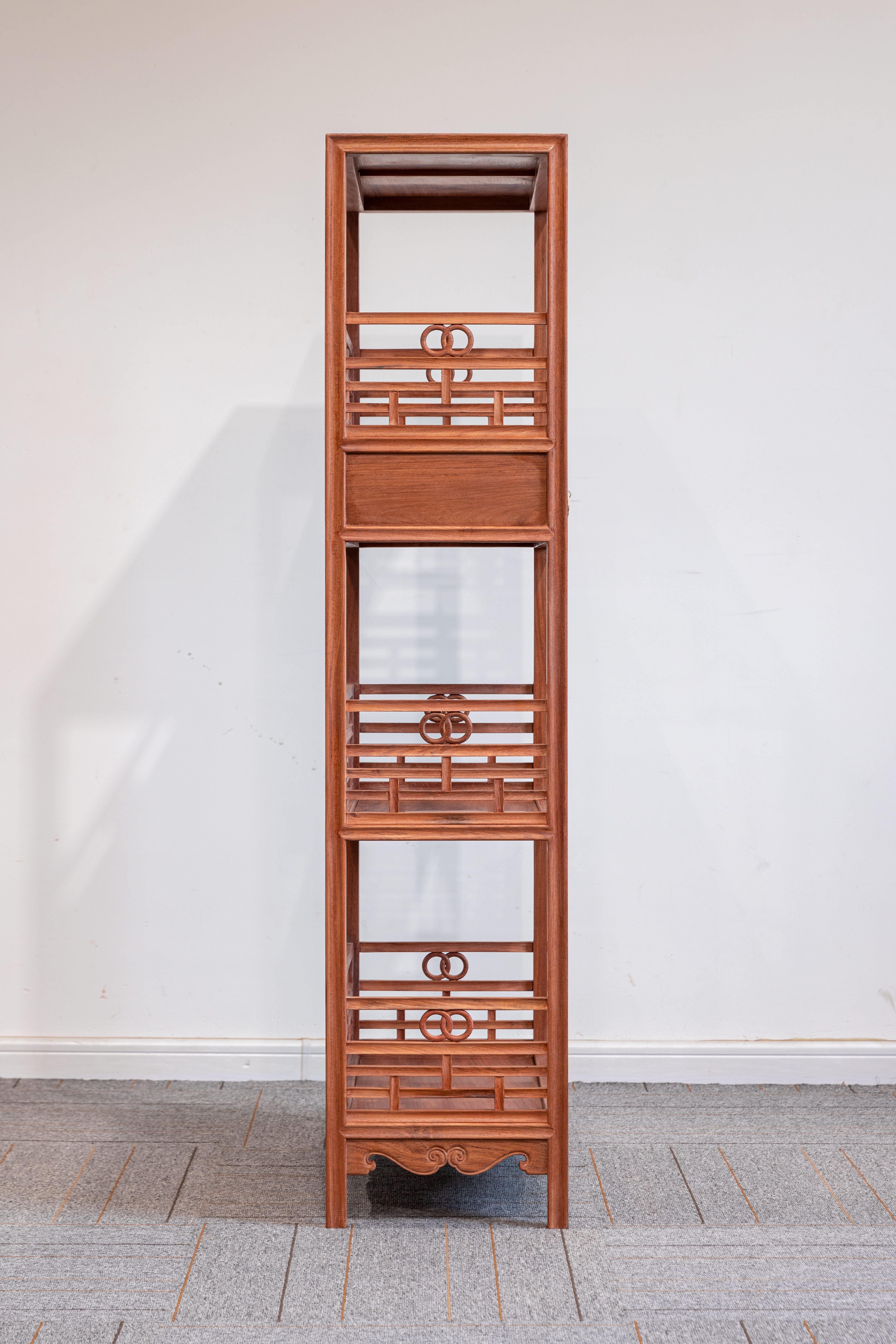 架格整体用方材打洼踩委角线,颇为吃工,设隔板三层,最上层之下安抽屉两具,抽屉面浮雕螭龙纹,用手托抽屉底实现开关,并未施铜拉手,可使图案保持完整的观赏度,隔板的三面设围子,围子用攒接横竖材组成,是品字栏杆的一种变体,最上面两道横材之间加双套环卡子花,下枨足尖用宽牙条,略施浮雕花纹。