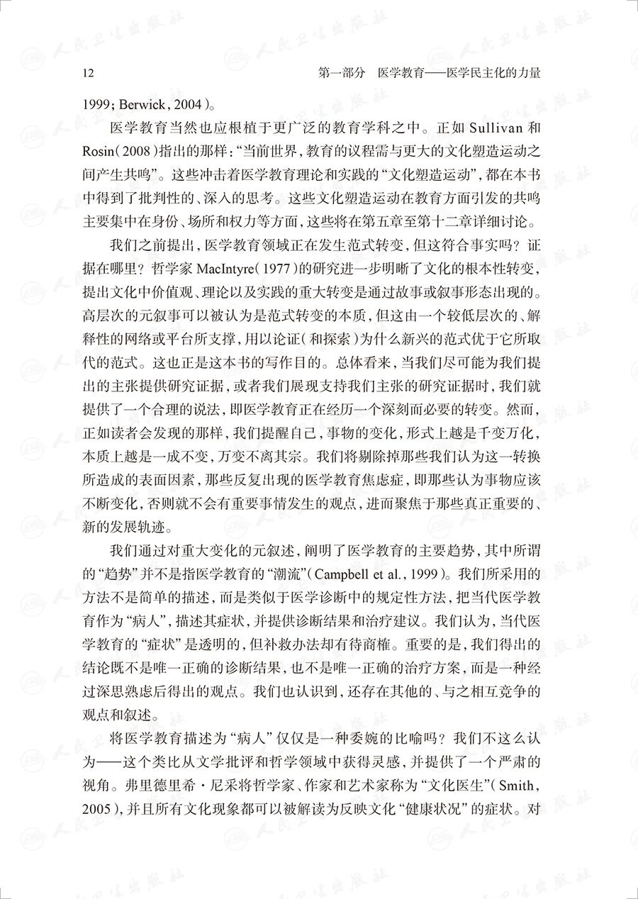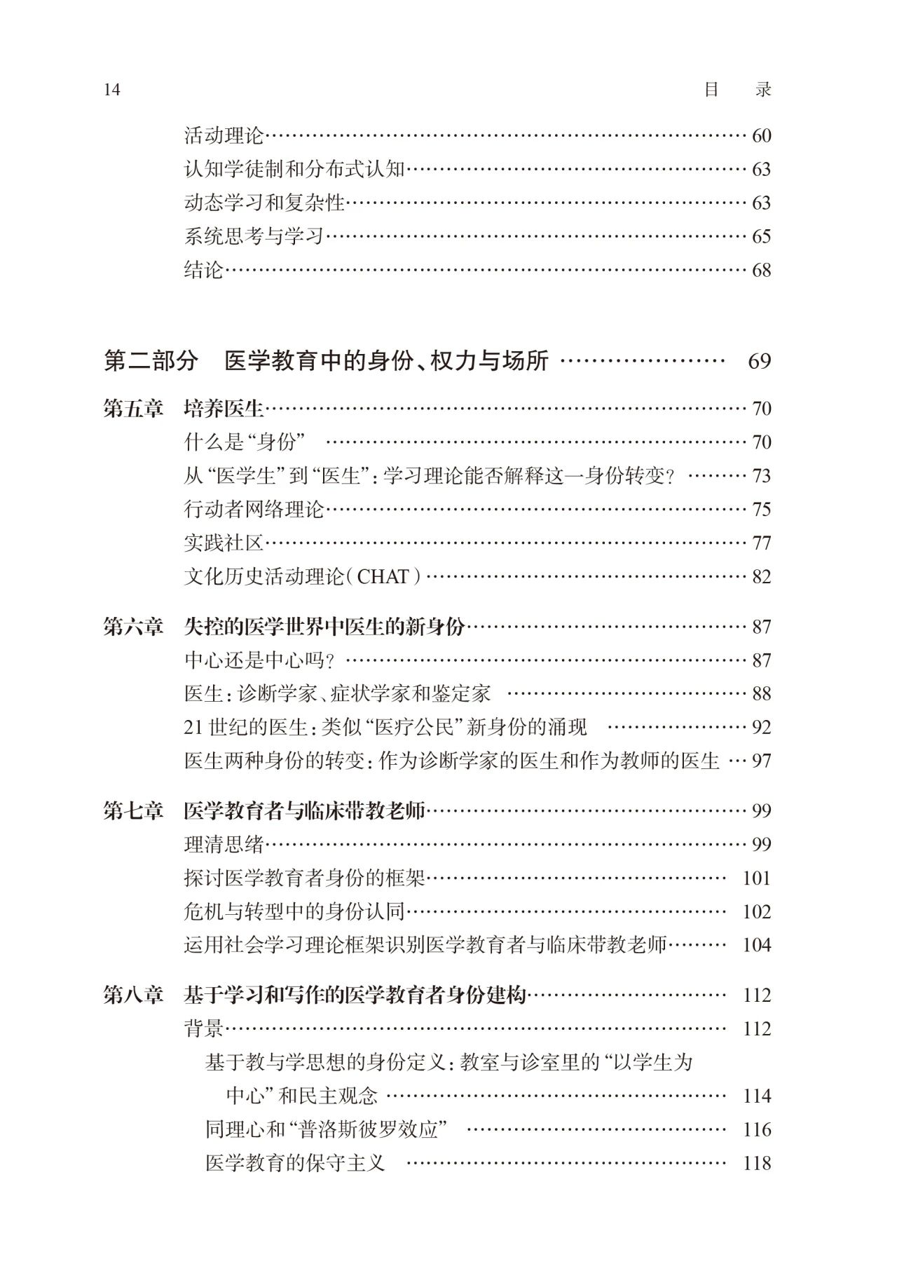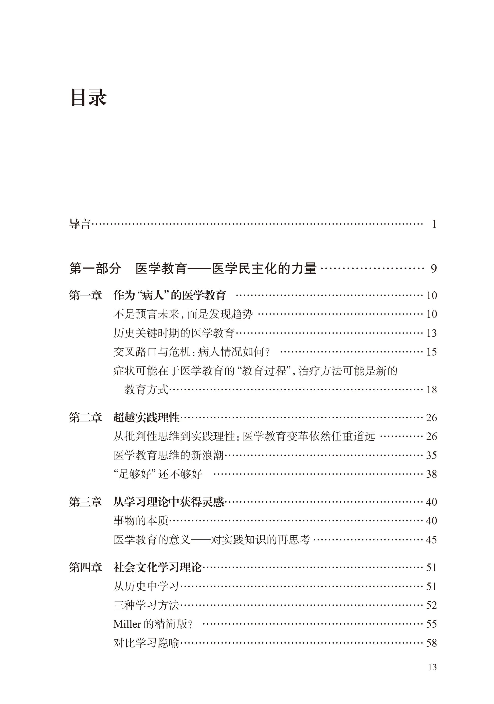 医学教育正在处于十字路口,与其相关的卫生保健和教育系统正在发生深刻变化,医疗保健专业人员所扮演的角色正在转变,社会公众对医学教育的期望值也在不断提升。本书首先从医学教育的历史背景出发,指出医学教育正在向更加民主的方向过渡,并简要介绍了社会文化、学习等相关理论;其次分析了医学生和医生如何在基于工作的环境中学习,并就医学教育中的身份、权力和场所等问题进行重点讨论;再次对医学教育研究中存在的问题进行梳理,对如何开展医学教育研究进行阐述,并提出医学教育研究的框架;最后总结出本书主要论点,并展望了医学教育的未来。本书致力于促进医学教育进行范式转变,不仅关注教学或研究方法,更加聚焦思维方式的转变,致力于培养具有深刻理论、精湛教学和研究技能的医学教育者和临床教师队伍,最终促使医学教育更加民主,医疗实践更加“以病人为中心”。