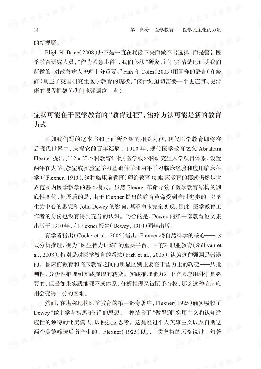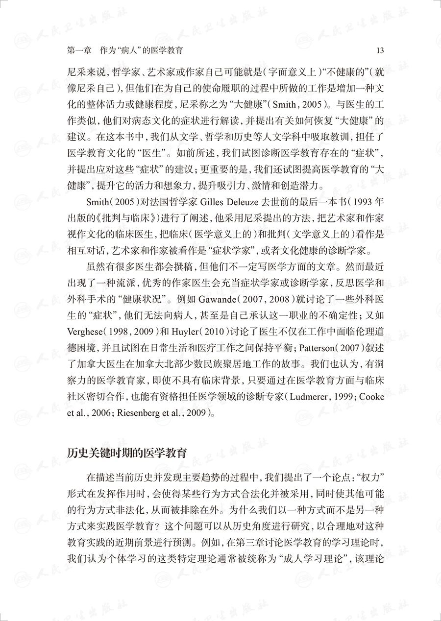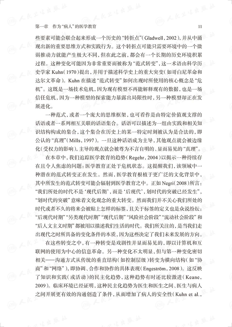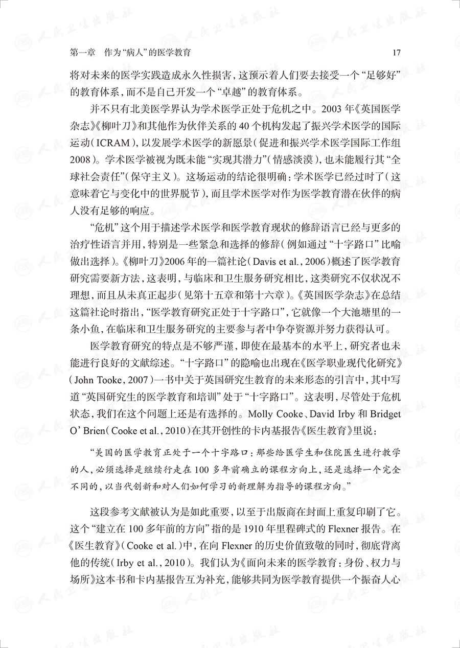 医学教育正在处于十字路口,与其相关的卫生保健和教育系统正在发生深刻变化,医疗保健专业人员所扮演的角色正在转变,社会公众对医学教育的期望值也在不断提升。本书首先从医学教育的历史背景出发,指出医学教育正在向更加民主的方向过渡,并简要介绍了社会文化、学习等相关理论;其次分析了医学生和医生如何在基于工作的环境中学习,并就医学教育中的身份、权力和场所等问题进行重点讨论;再次对医学教育研究中存在的问题进行梳理,对如何开展医学教育研究进行阐述,并提出医学教育研究的框架;最后总结出本书主要论点,并展望了医学教育的未来。本书致力于促进医学教育进行范式转变,不仅关注教学或研究方法,更加聚焦思维方式的转变,致力于培养具有深刻理论、精湛教学和研究技能的医学教育者和临床教师队伍,最终促使医学教育更加民主,医疗实践更加“以病人为中心”。