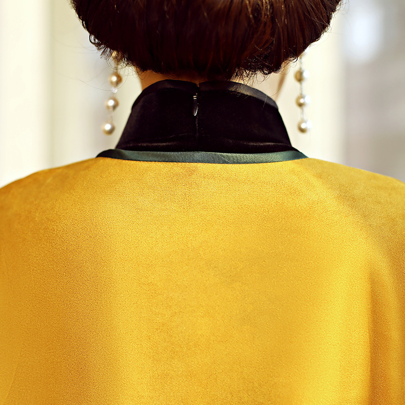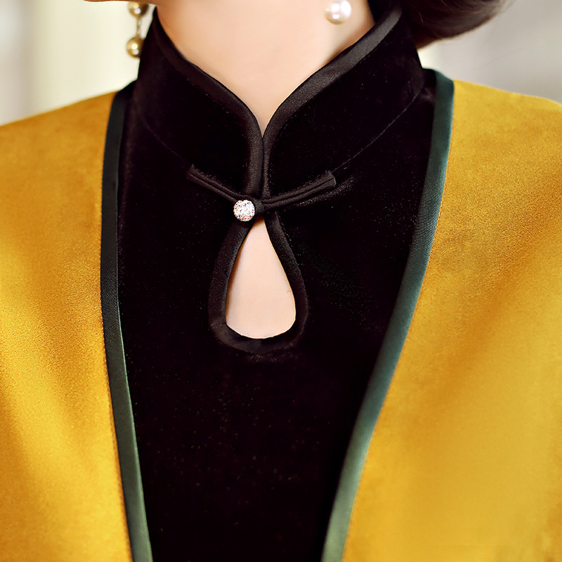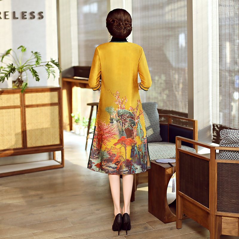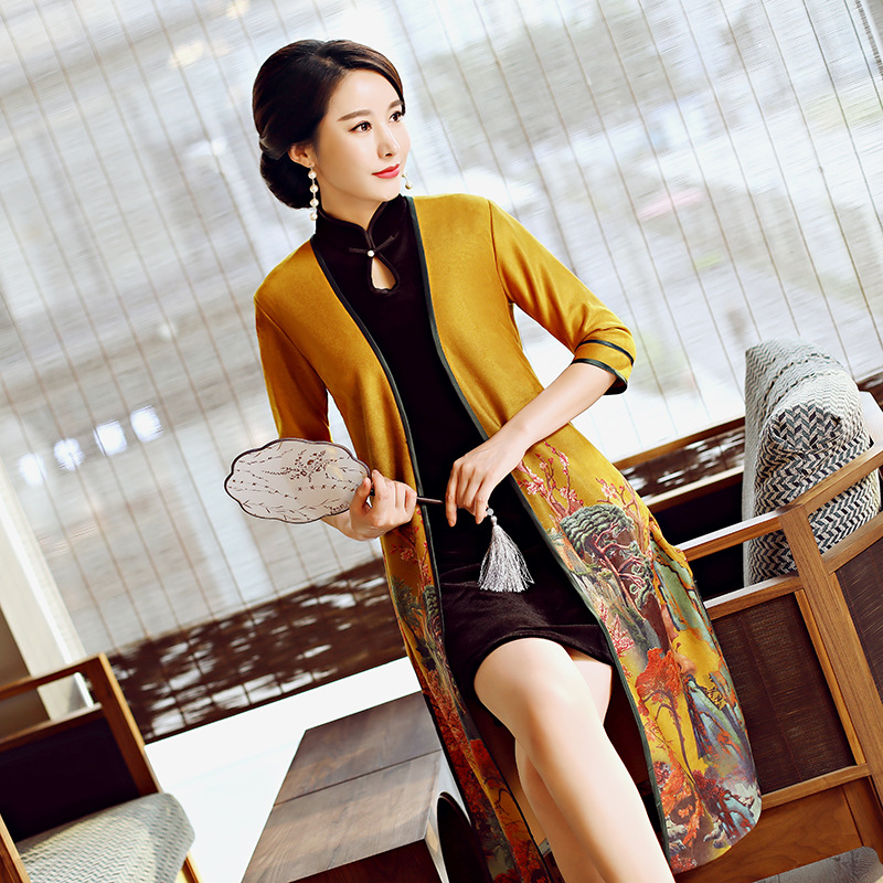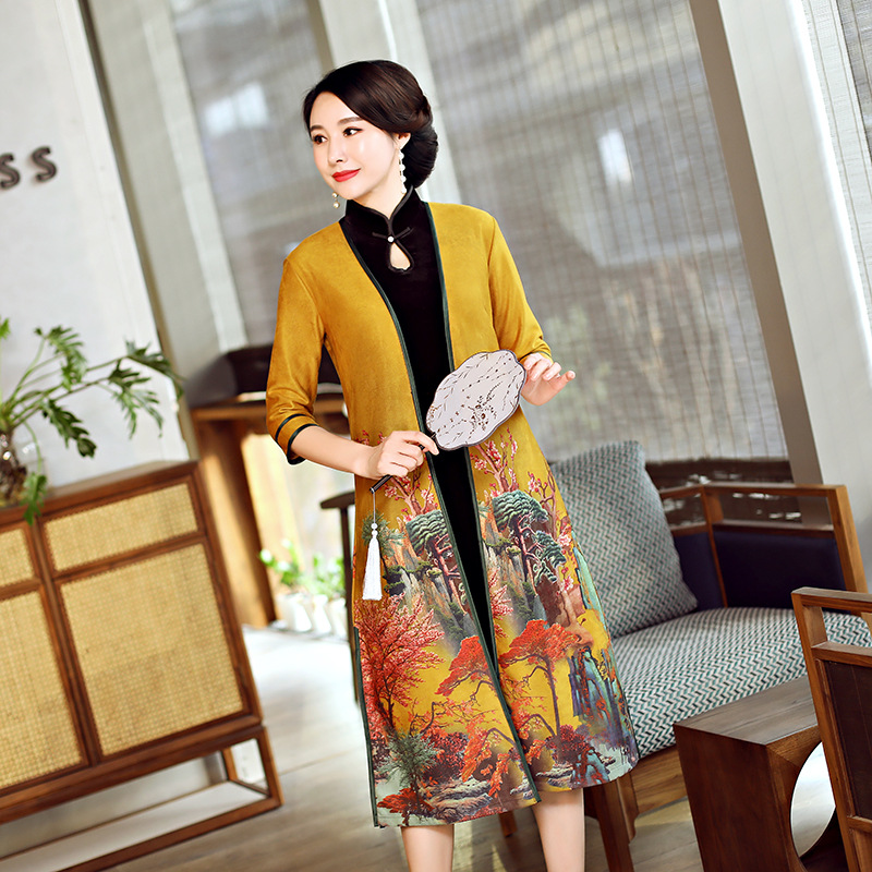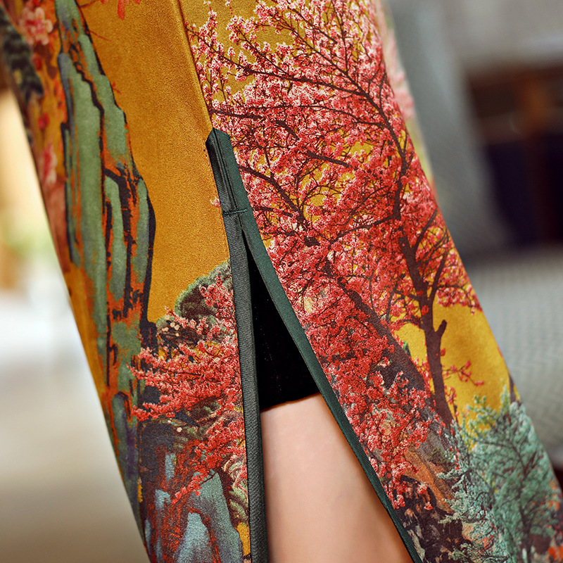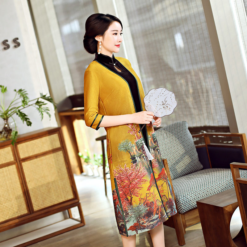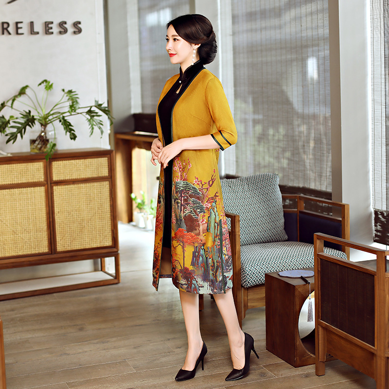 MTX-8190 秋冬新款中长款鹿皮绒旗袍七分袖两件套改良修身版妈妈装
