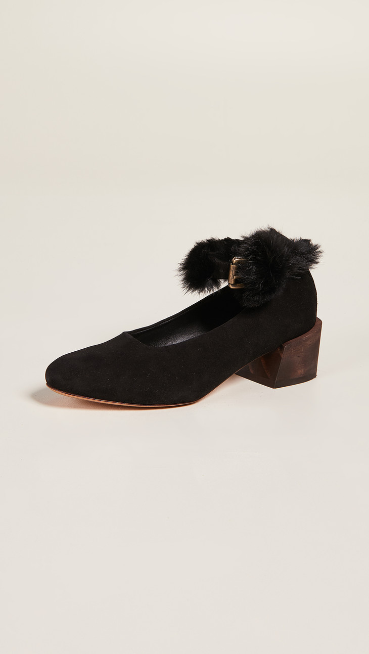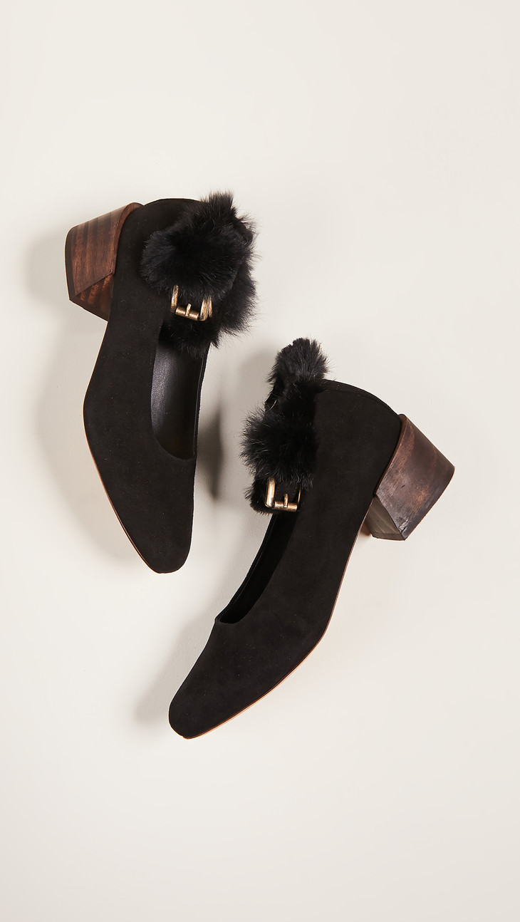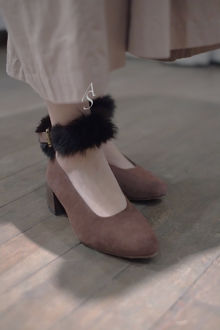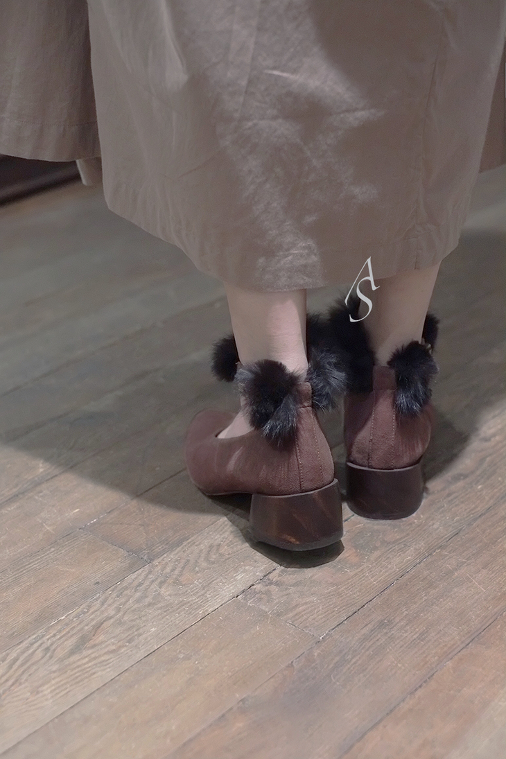 鞋子表层为绒面皮,内里则是小羊皮,脚感舒适。鞋子有丝带、毛绒搭扣两种穿法,可以应对不同季节。另外,丝带和毛绒搭扣都可拆卸,鞋子就变成一脚蹬单鞋,非常方便好穿。