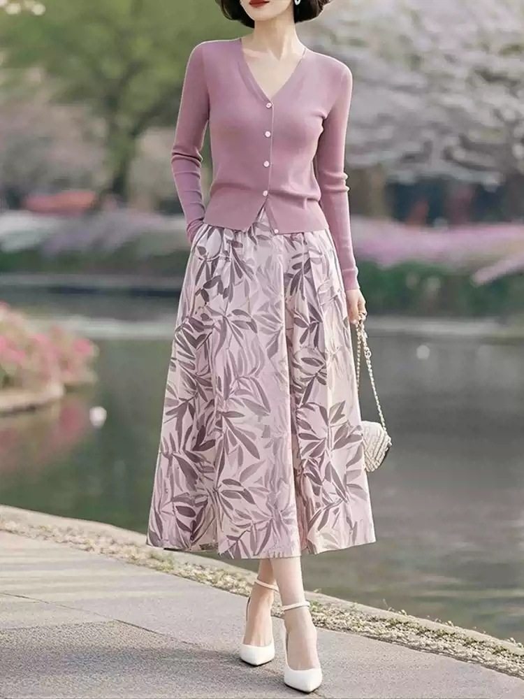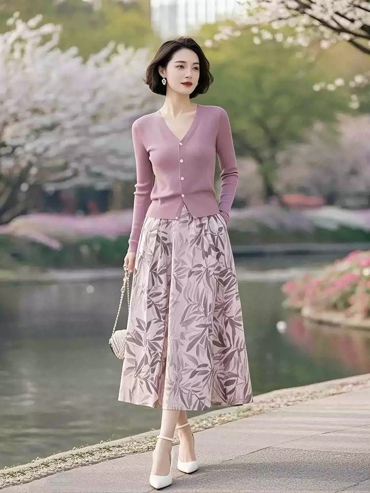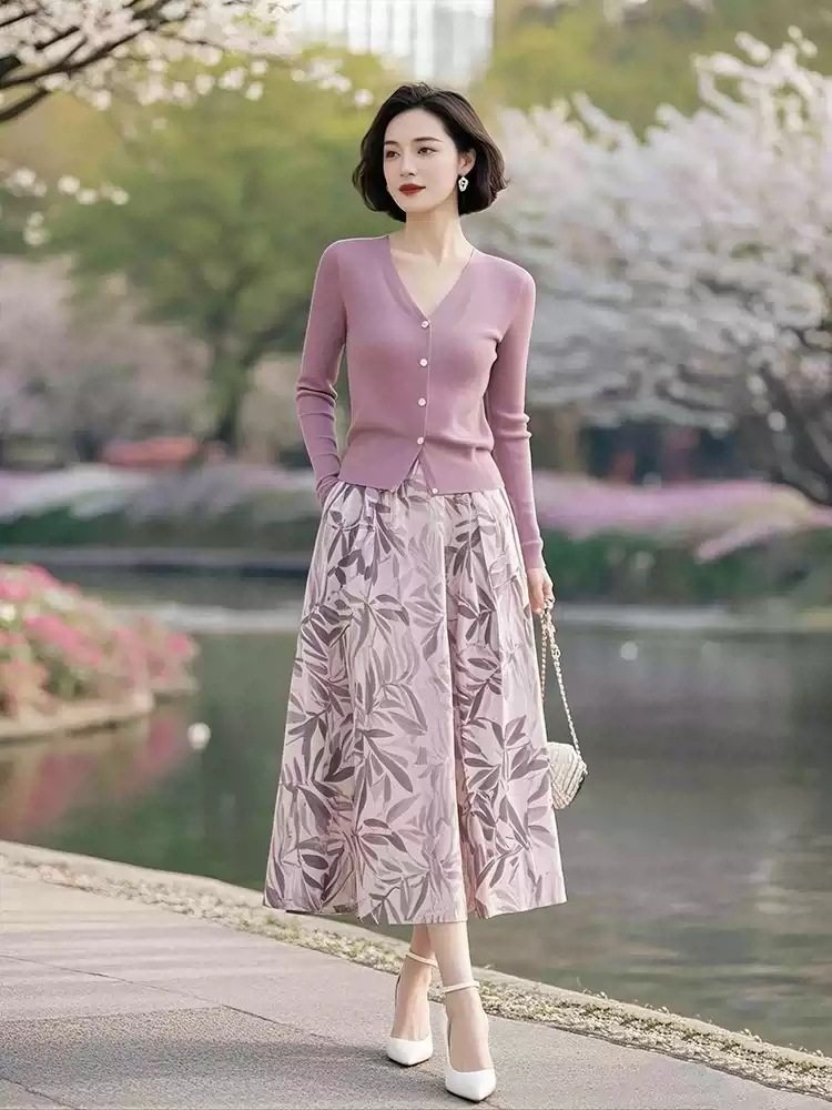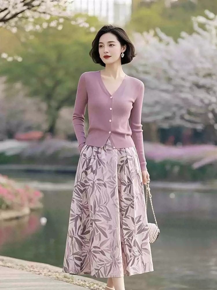 春季穿搭一整套中年妈妈时尚气质粉紫色针织开衫碎花时尚百搭上衣