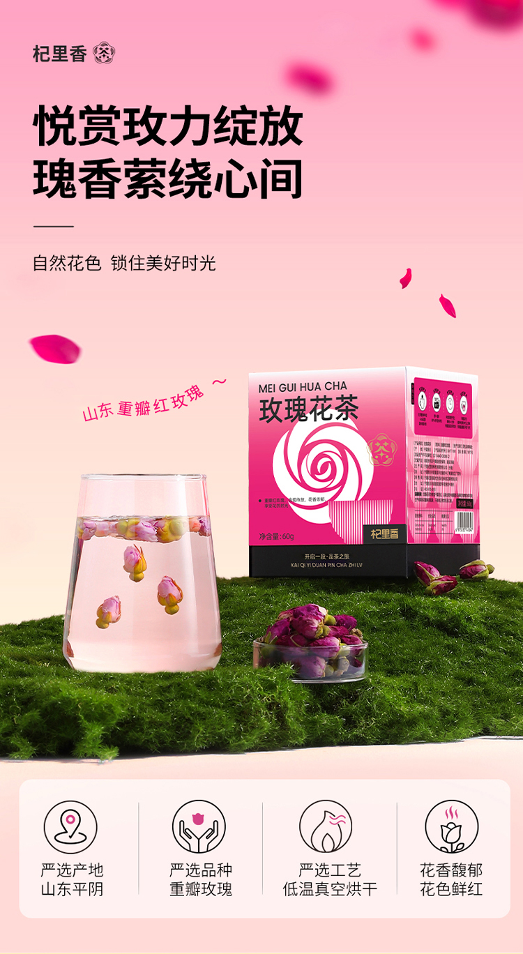 杞里香60g盒装玫瑰花茶重瓣红玫瑰香气浓郁,花大色艳,瓣多瓣厚,营养丰富
