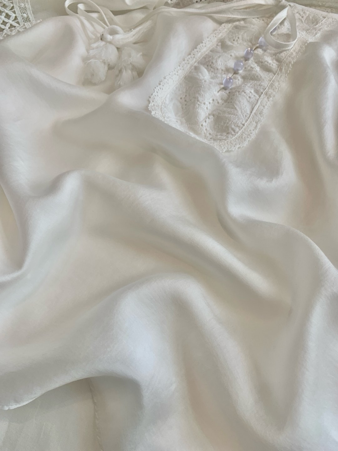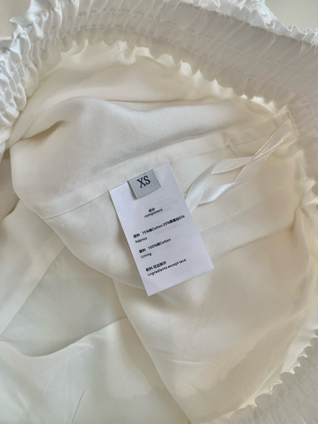 75%棉25%桑蚕丝,布面纹理清晰,触感舒适自然,非常轻薄,超软糯糯那一种,毫无束缚的贴身亲肤,夏天穿也不会感到闷热,清凉柔润,无刺激,释放出干练洒脱的气息,简直不要太舒服了~裤脚缝制手工镂空水溶蕾丝花边