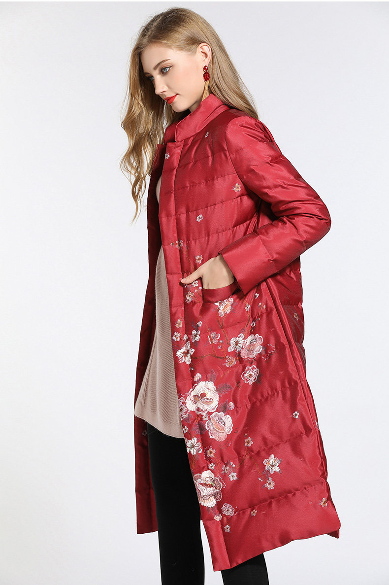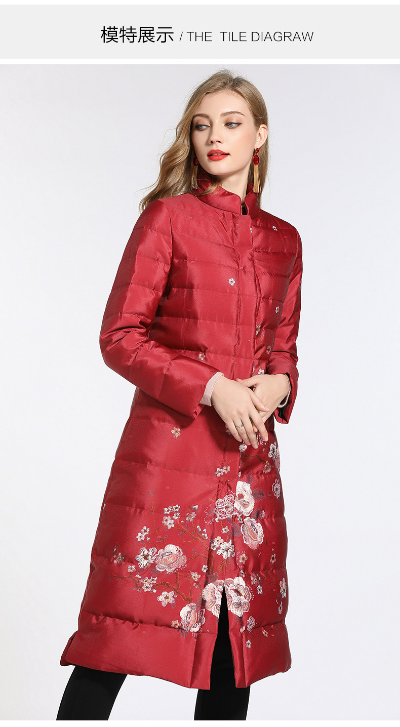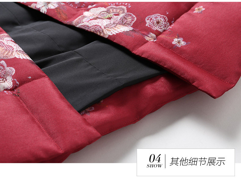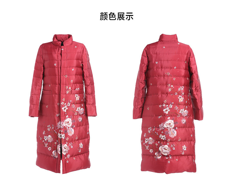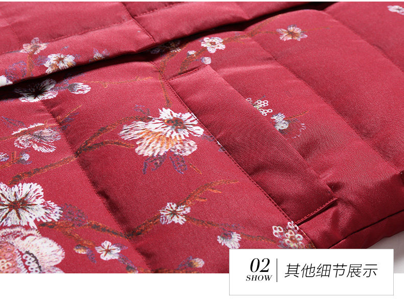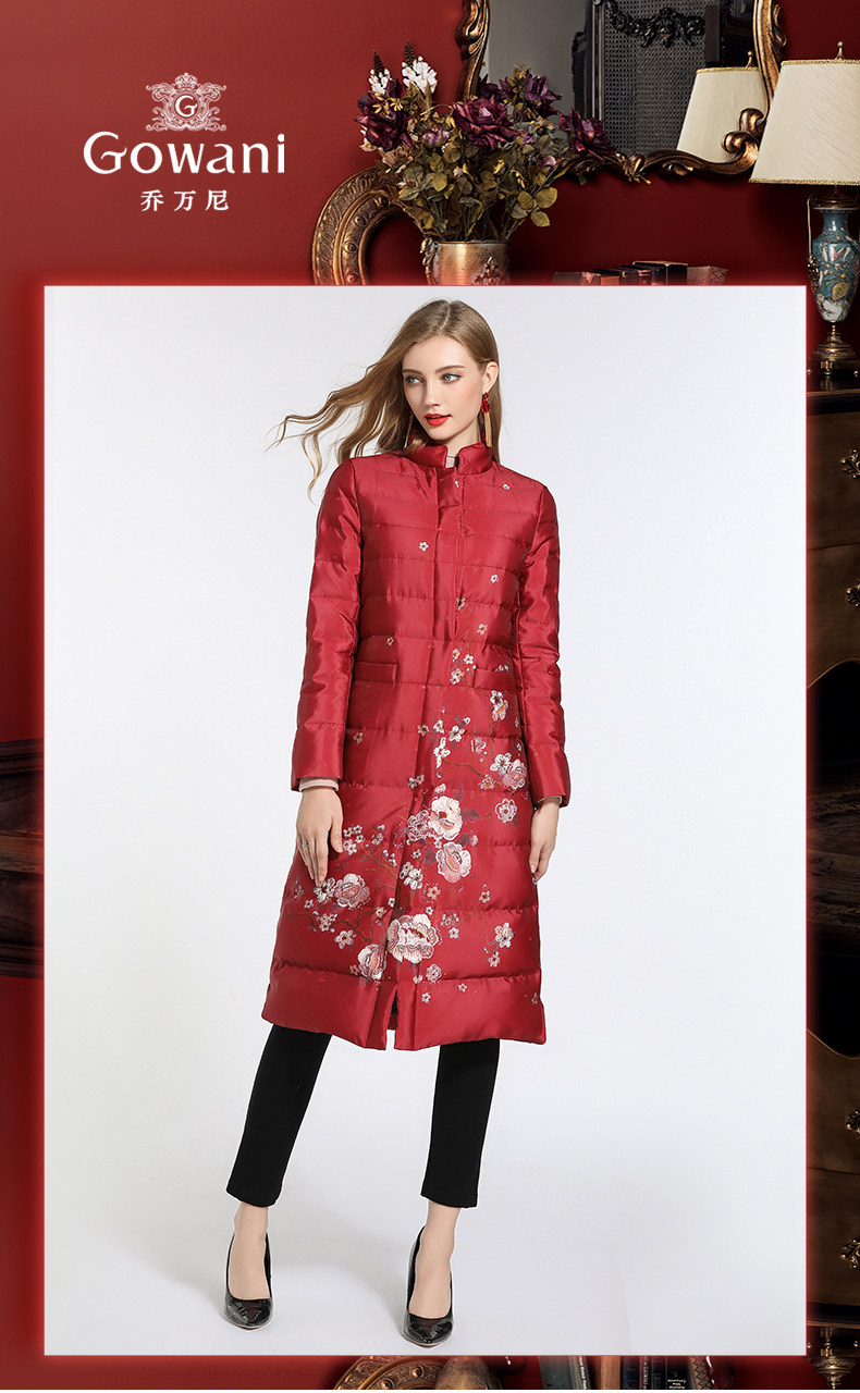 乔万尼羽绒服女复古名族风红色印花宽松立领保暖过膝长款EB4T087