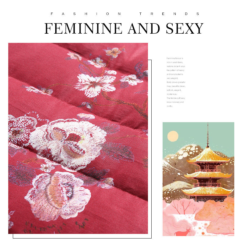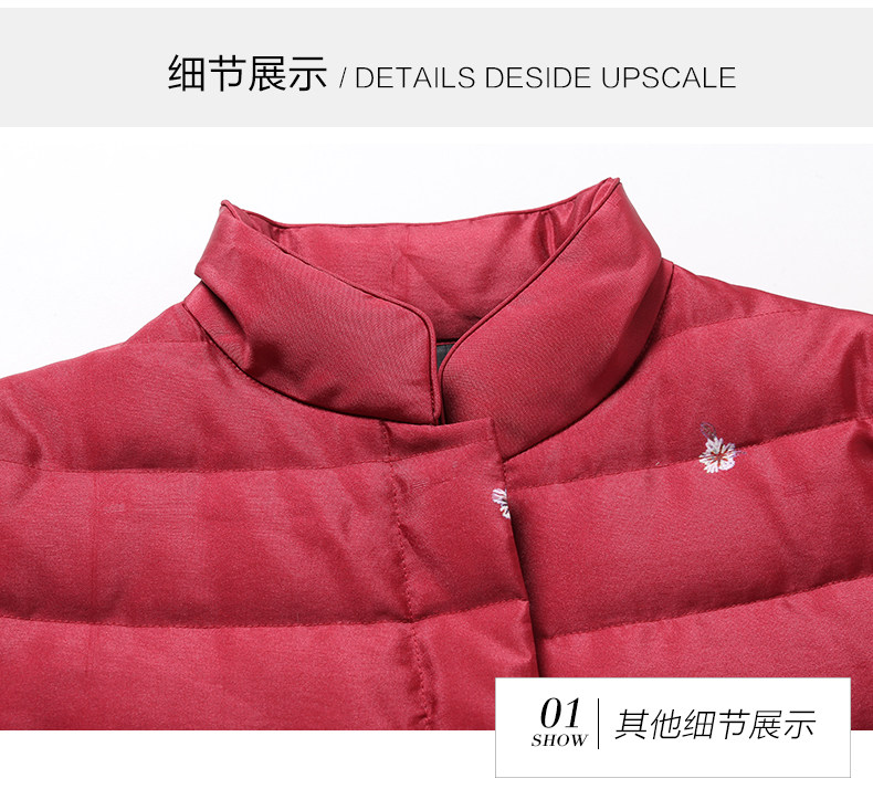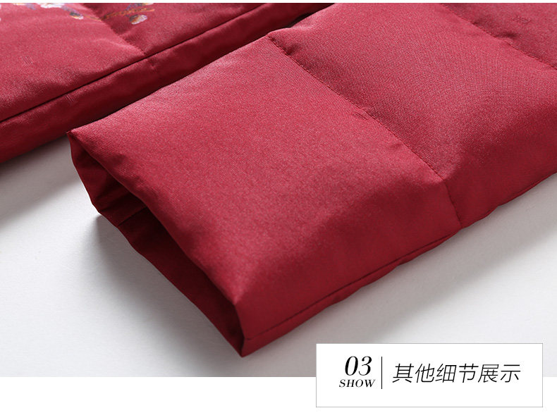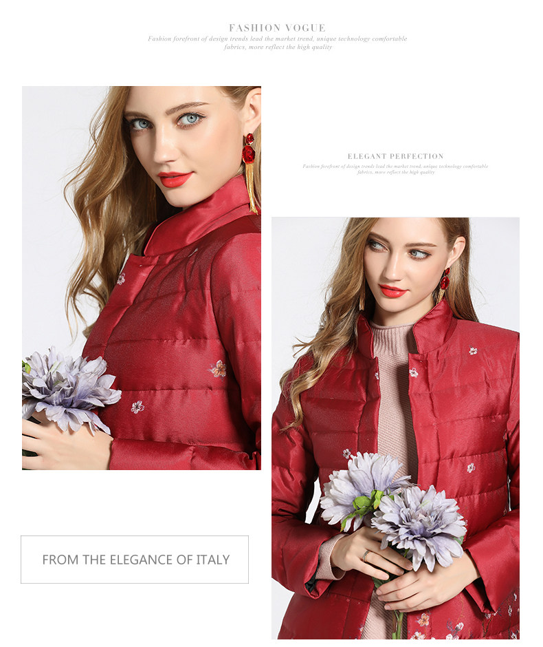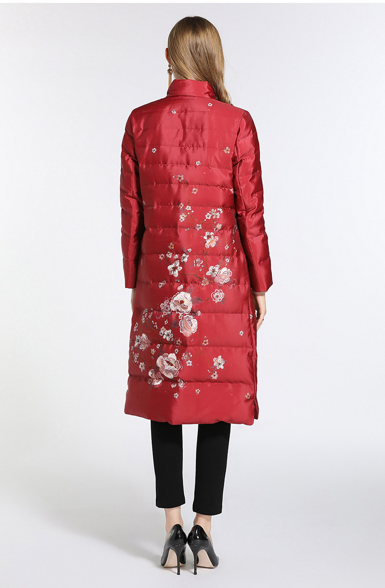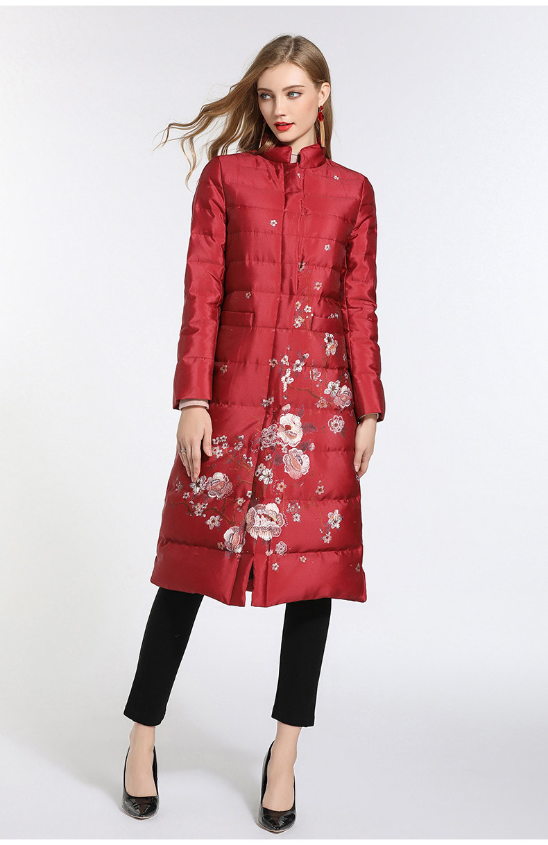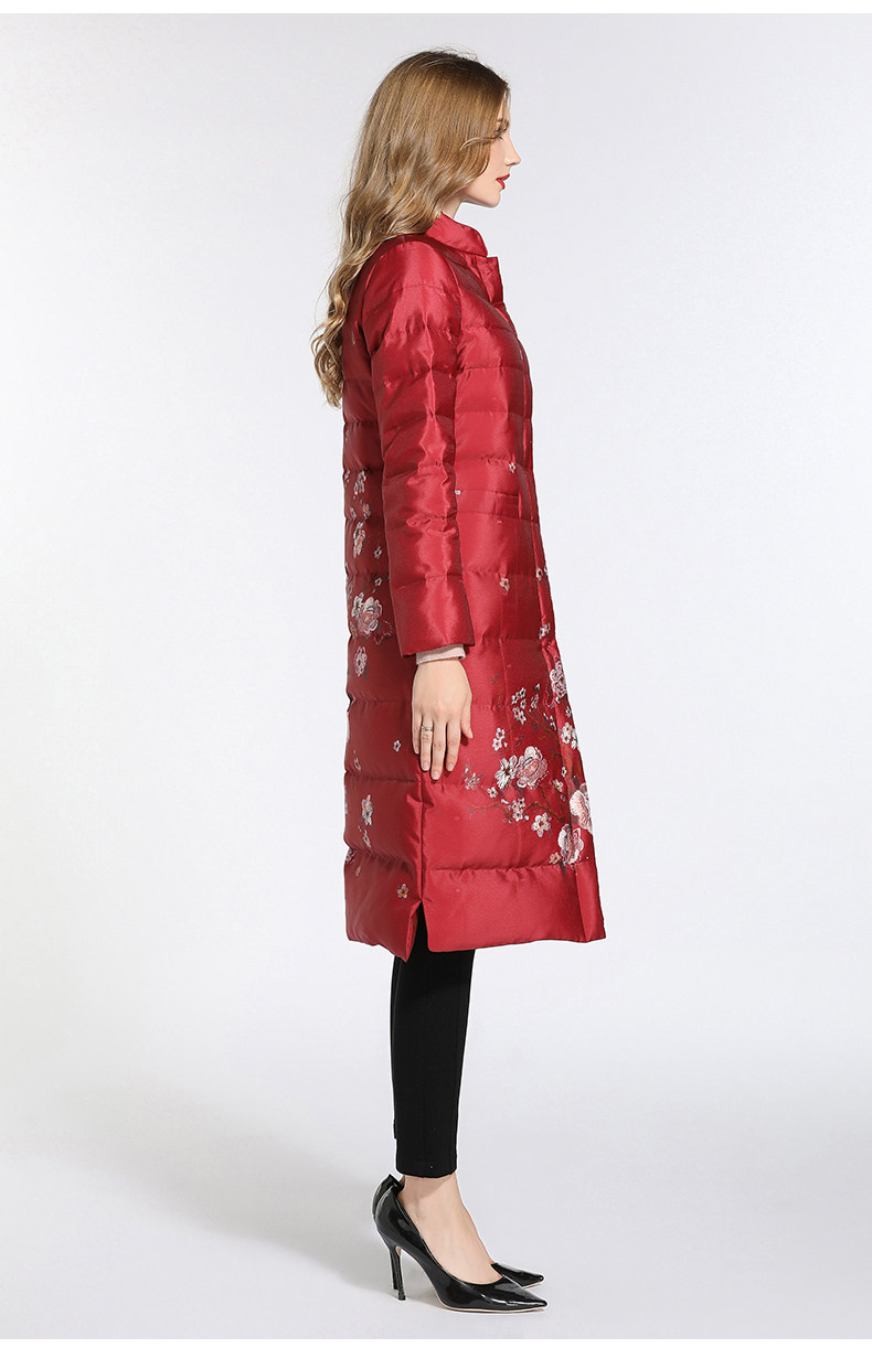 乔万尼羽绒服女复古名族风红色印花宽松立领保暖过膝长款EB4T087
