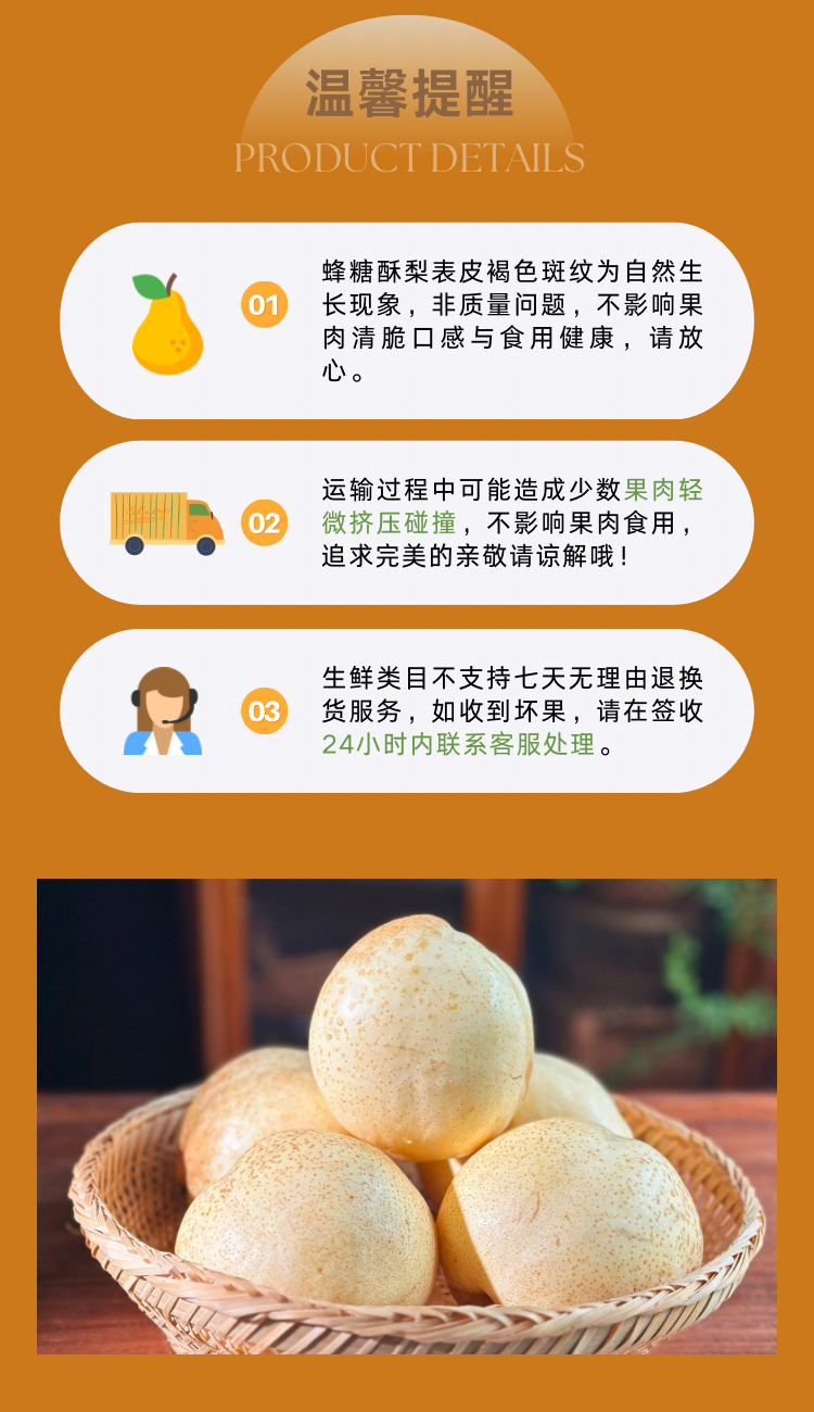 | 【品名】山东蜂糖酥梨 【规格】净重3-4.5斤装 【供货周期】10月-12月 【产地】山东 【发货地】山东 【发货快递】京东 【不发货区域】新疆,西藏,海南,港澳台地区不发 【发货时效】48小时,节假日顺延 |