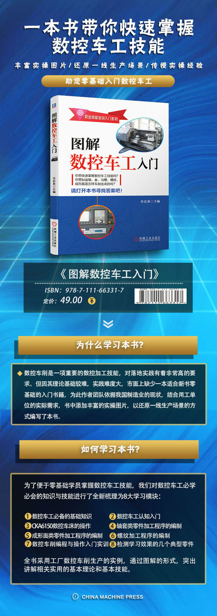 许多人只是粗略地知道数控车削,对数控车削能加工的内容知之甚少,这与数控车削在制造业的地位不相称。鉴于此,我们从普及科学常识、提高一点数控车工知名度的角度出发,依据我国制造业的现状及用工单位的实际需求编写了这本通俗易懂的《图解数控车工入门》,本书采用工厂数控车削生产的实例,通过图解的形式,突出讲解相关实用的基本理论和基本技能。全书共分八个模块,内容包括数控车工必备的基础知识、数控车工认知入门、CKA6150数控车床的操作、轴套类零件加工程序的编制、成形面类零件加工程序的编制、螺纹加工程序的编制、数控车削编程与操作入门实训、检验学习效果的几个零件,书中的各种操作方法让人一看就明白。