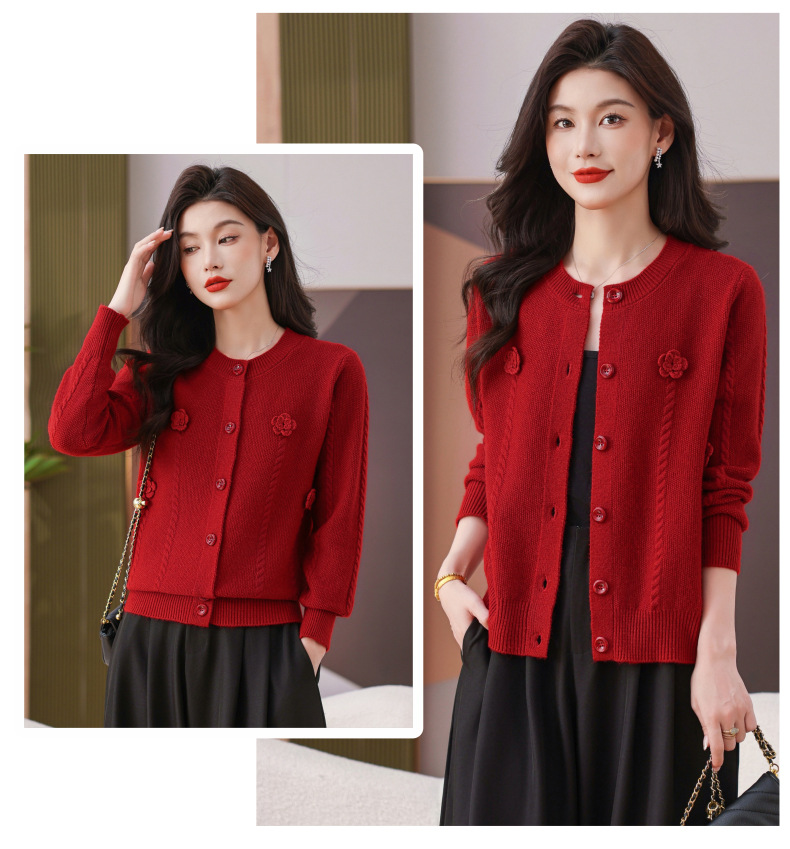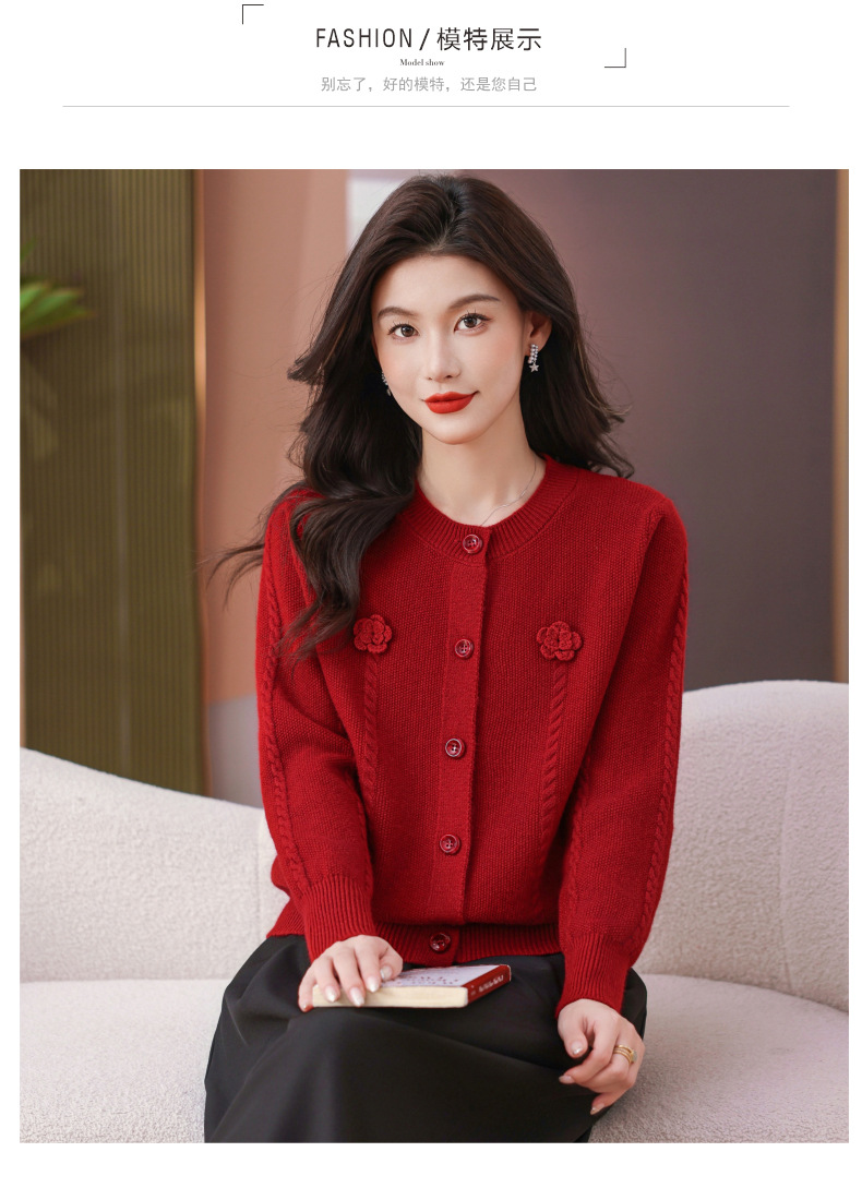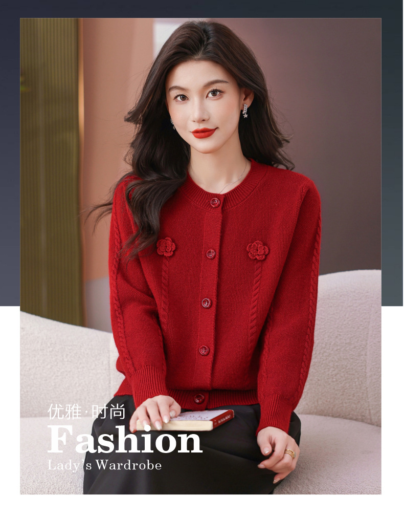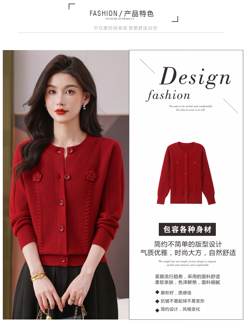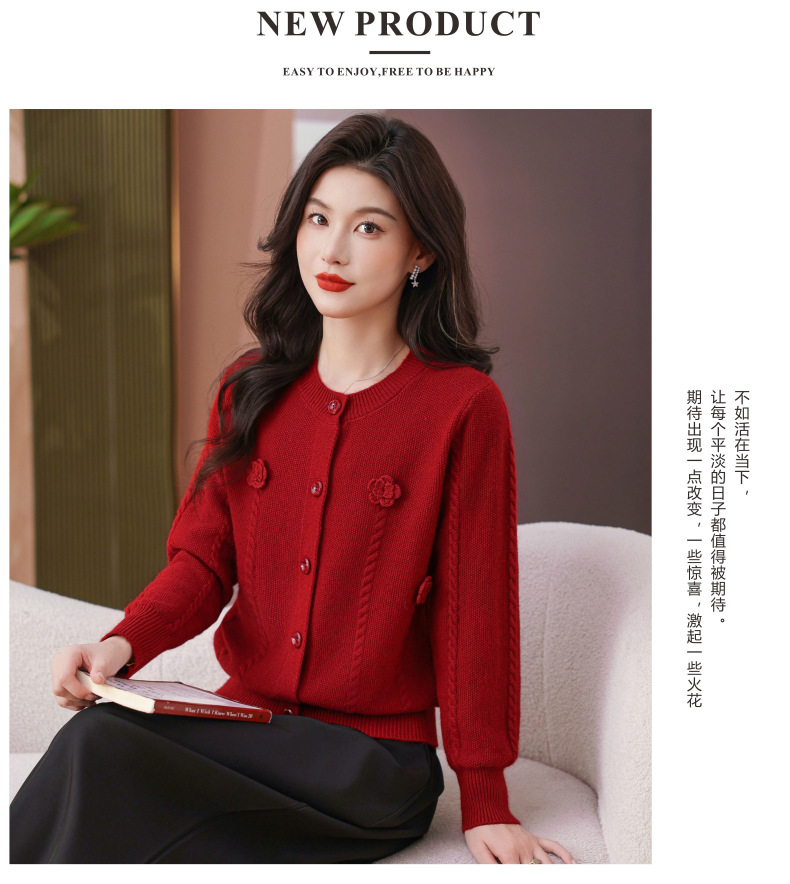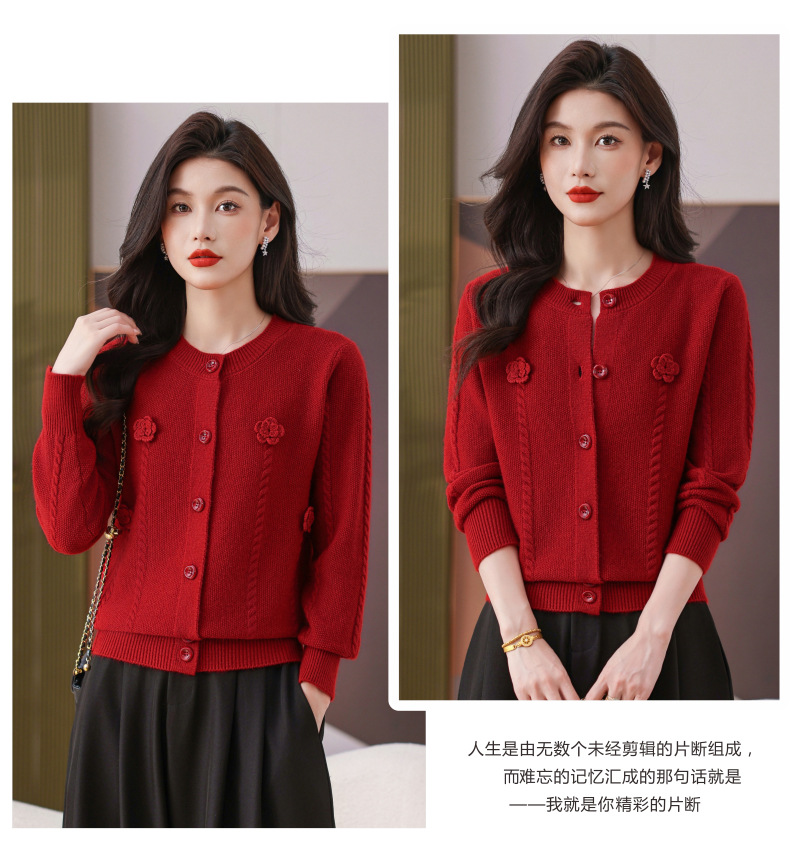 CC红色针织开衫女士气质外搭长袖上衣秋装2025新款立体花朵毛衣外套