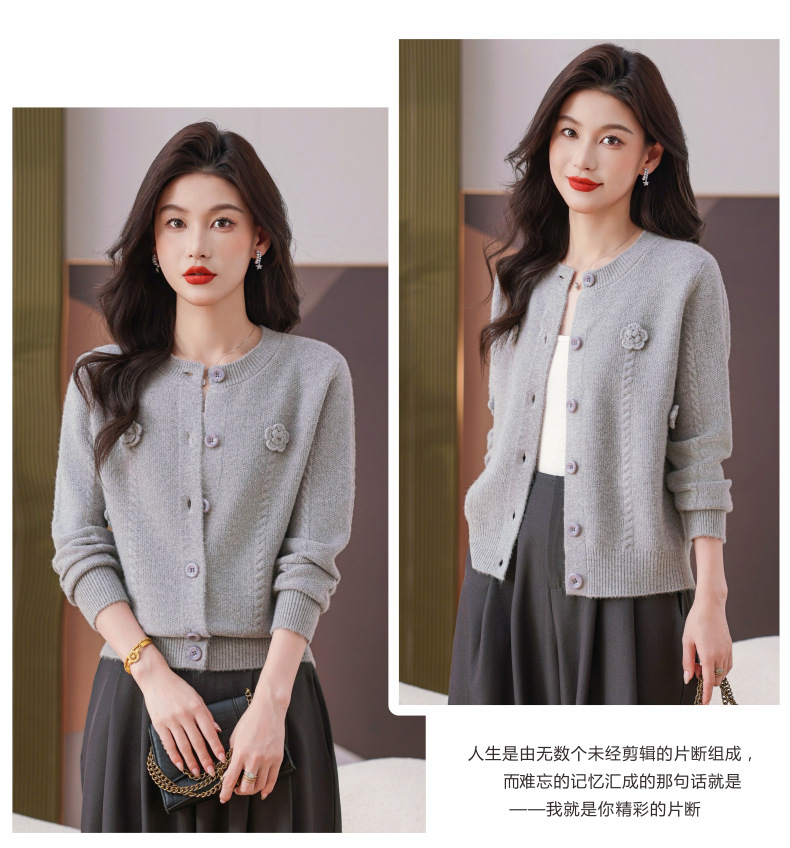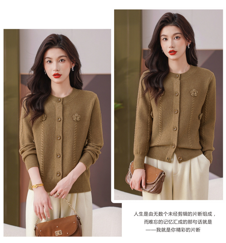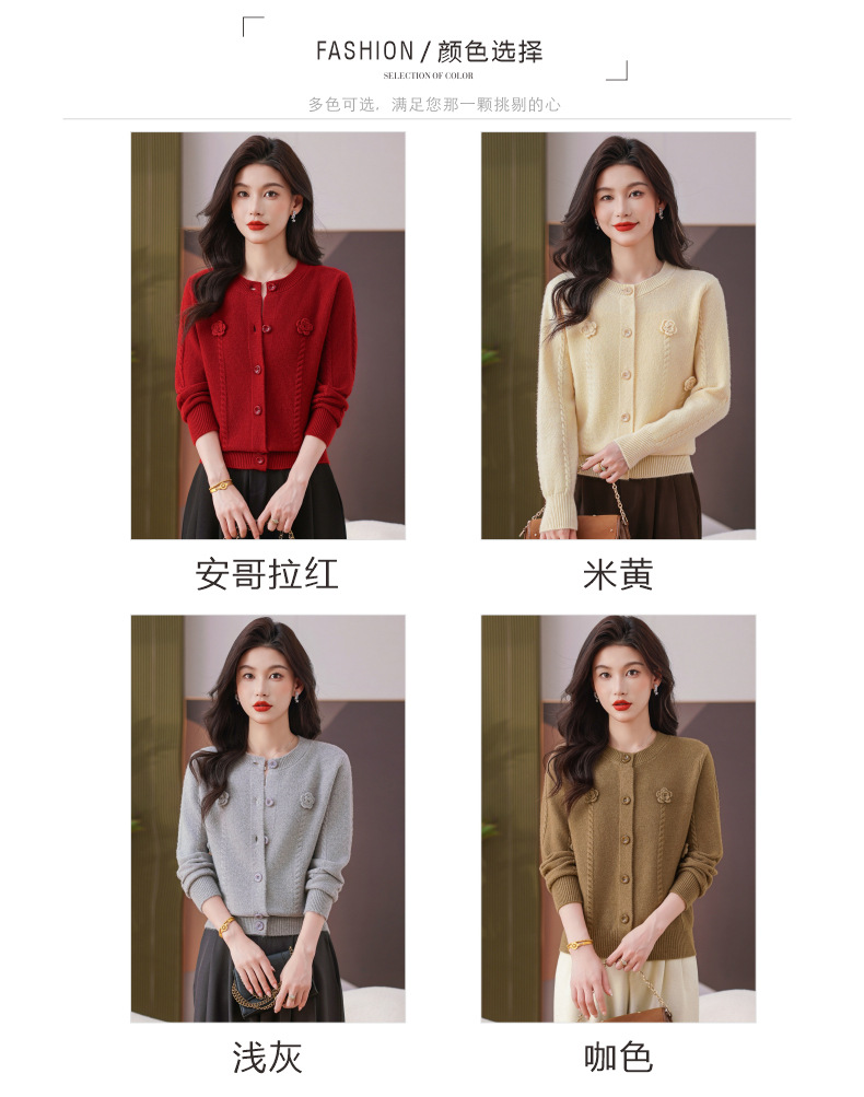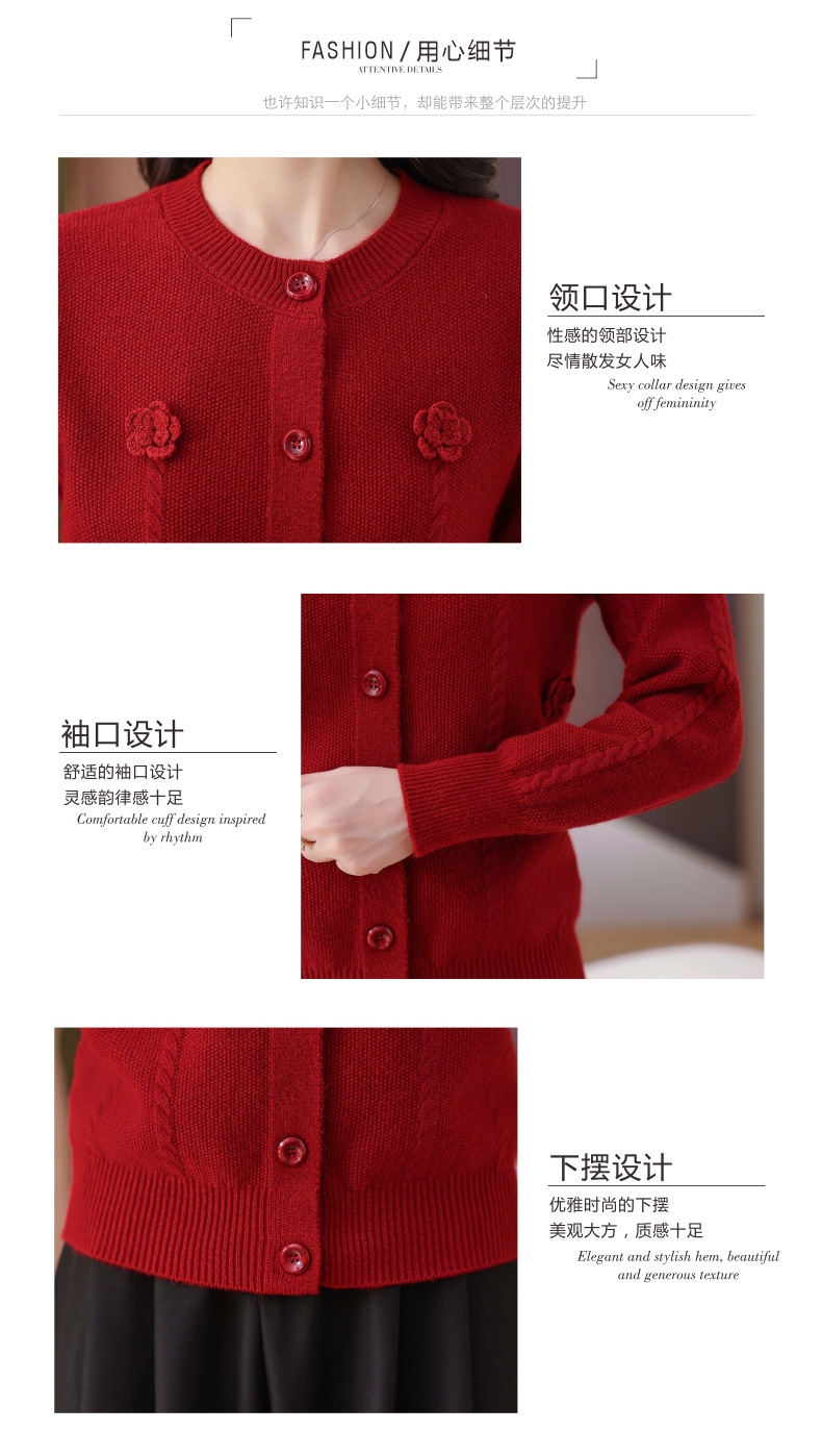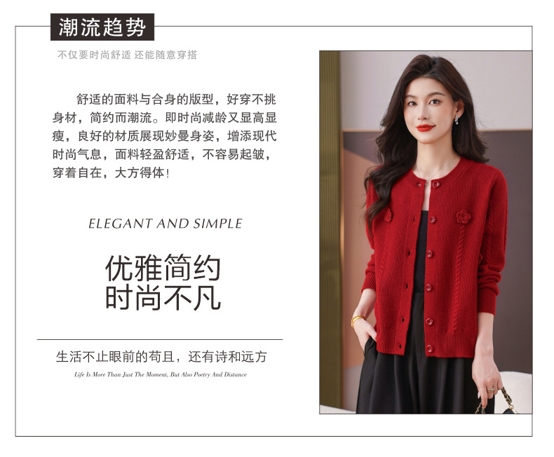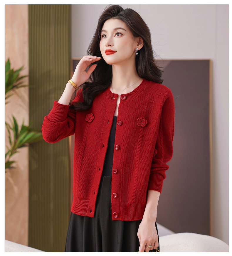 CC红色针织开衫女士气质外搭长袖上衣秋装2025新款立体花朵毛衣外套