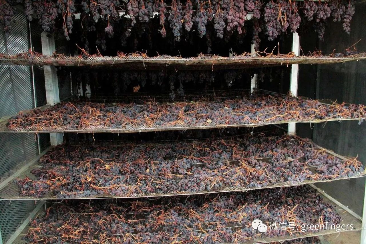 2、再采摘下来,进入棚内风干2个月。这里是洋溢着幸福感的葡萄海。