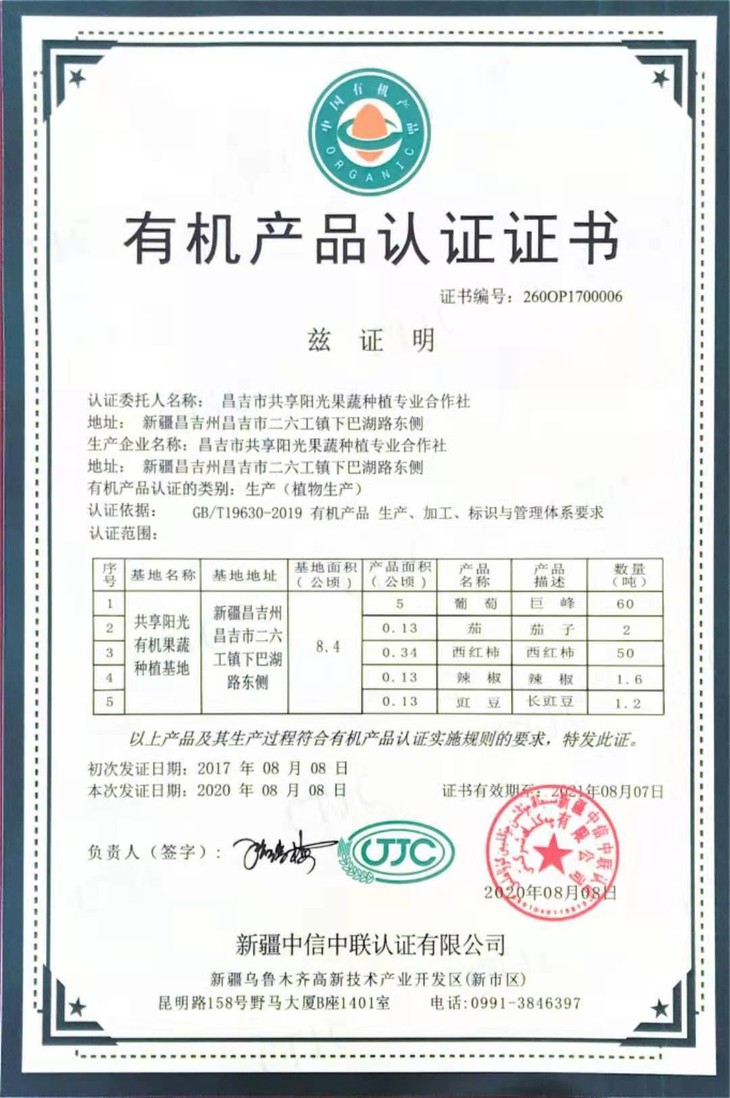 葡萄有机认证证书