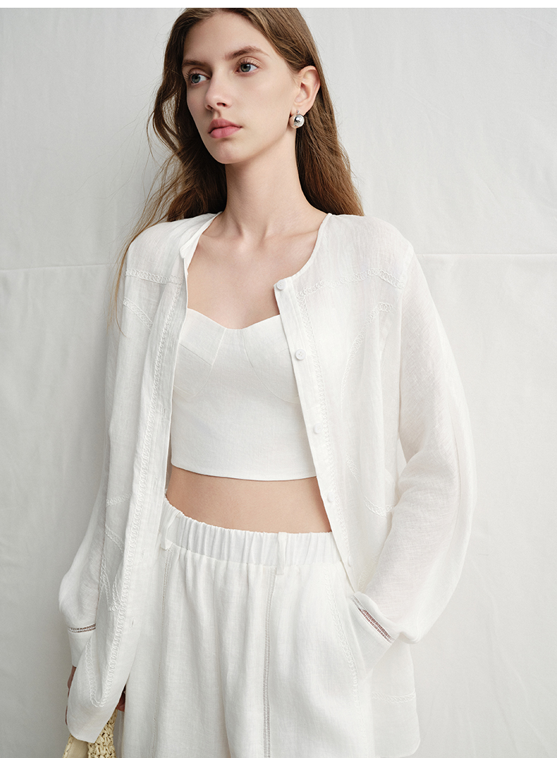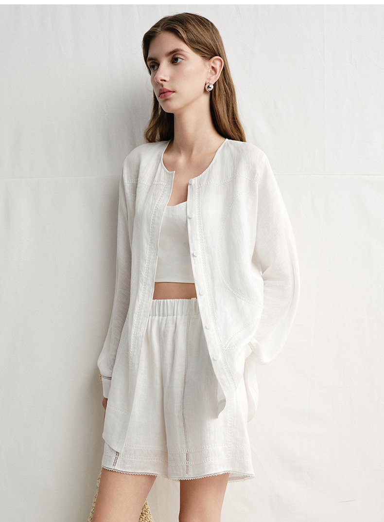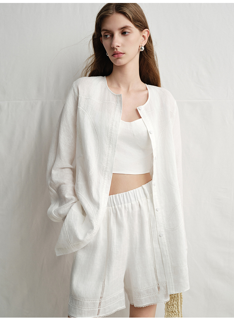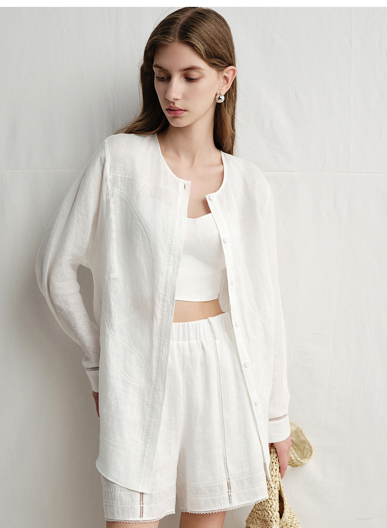VIMAGE纬漫纪休闲亚麻慵懒感廓形白色圆领衬衫上衣2025夏季新款V2309914
