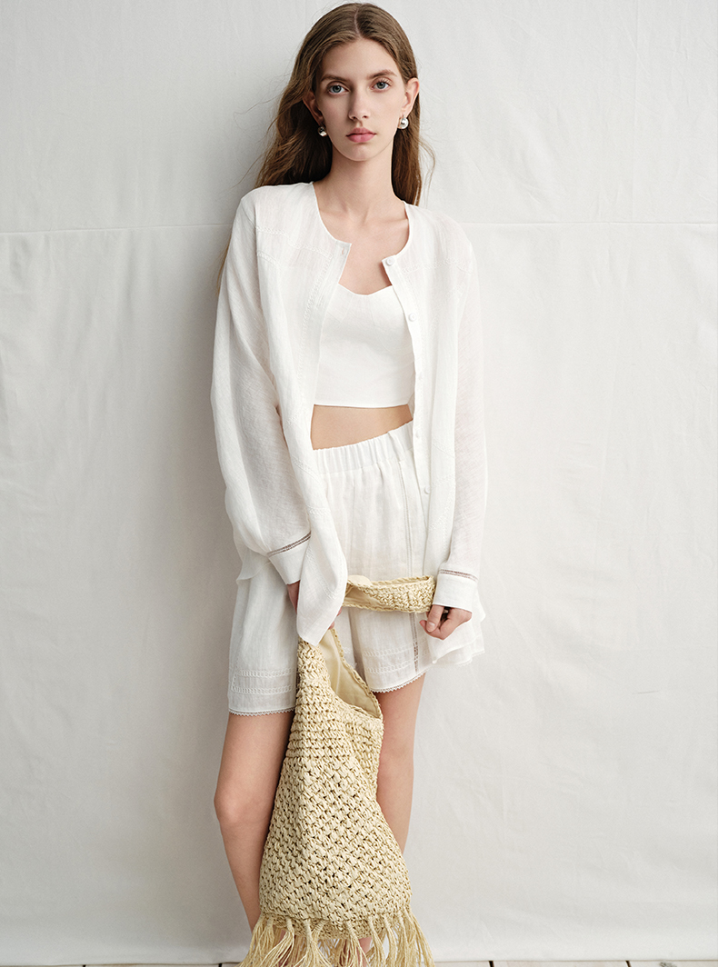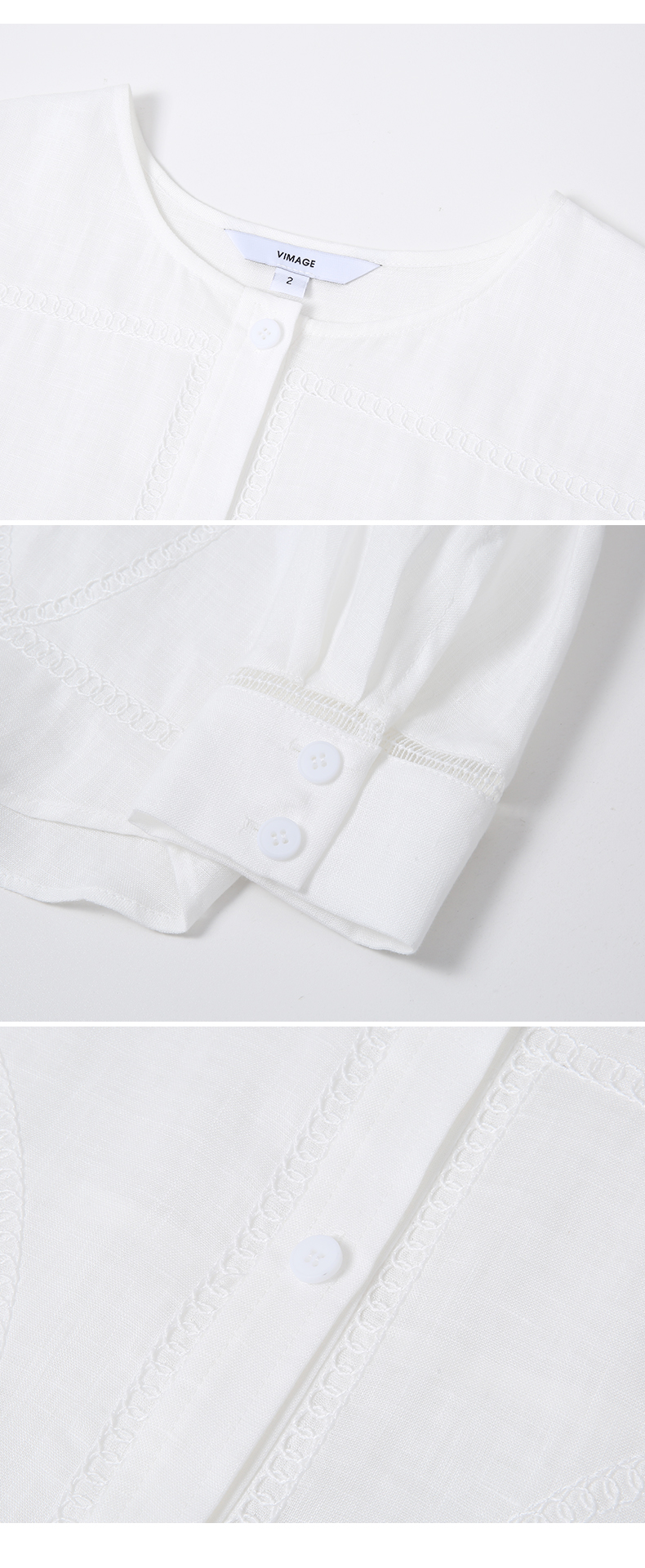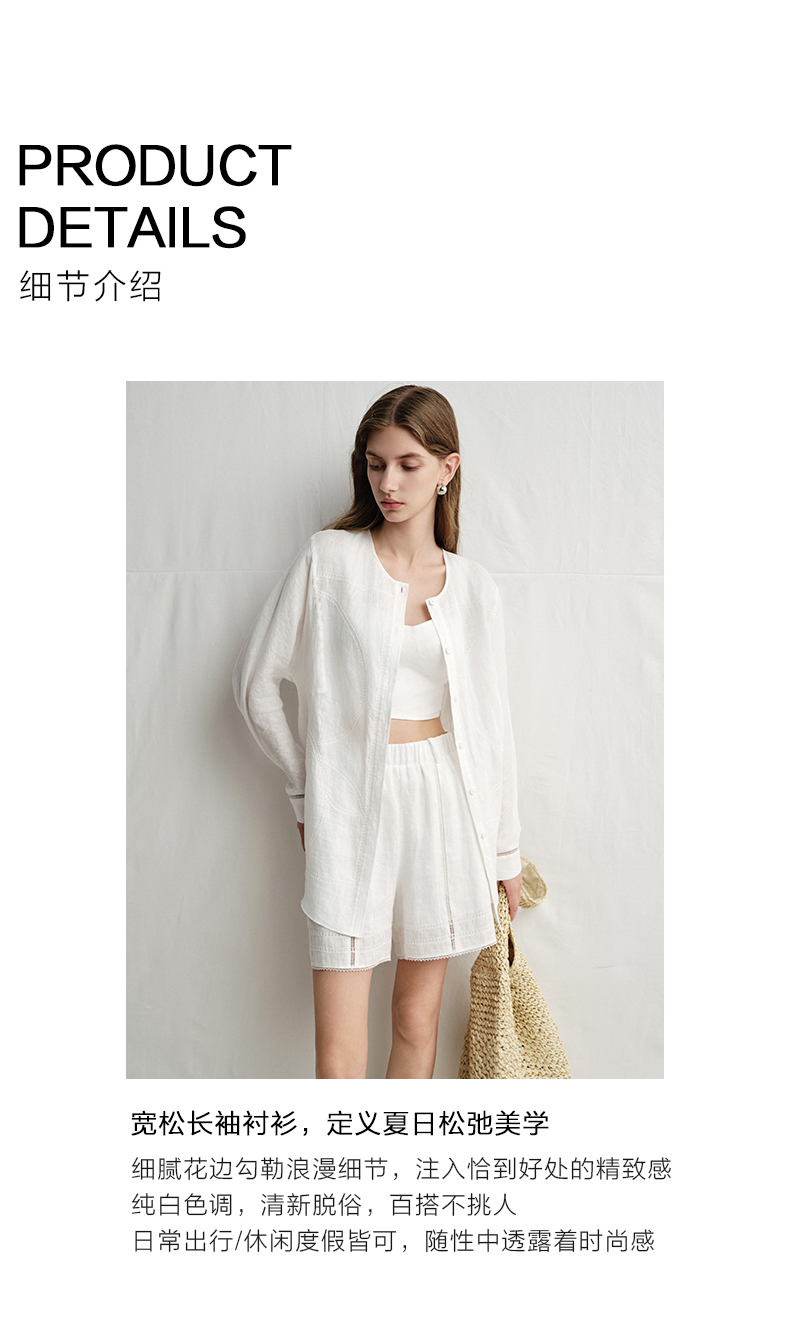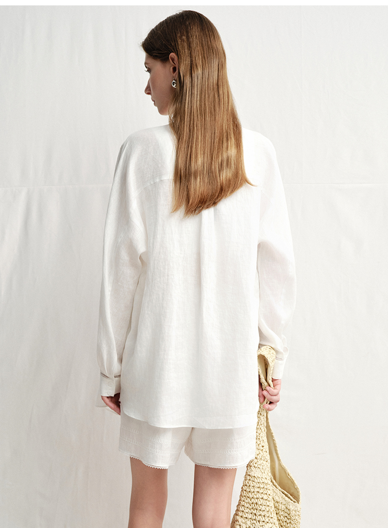 VIMAGE纬漫纪休闲亚麻慵懒感廓形白色圆领衬衫上衣2025夏季新款V2309914