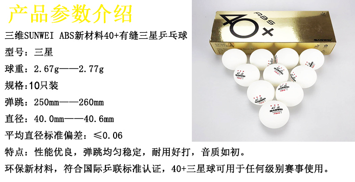 三维SANWEI 新款ABS新材料40+有缝三星球3星球三星乒乓球 10个装