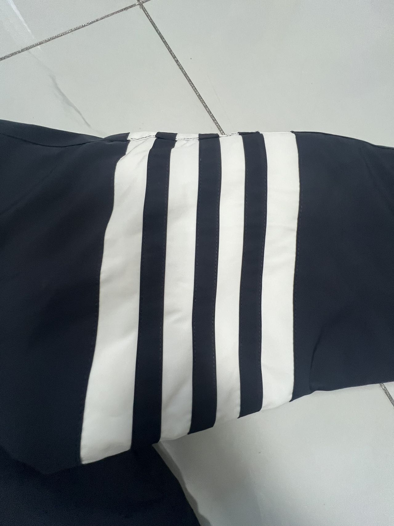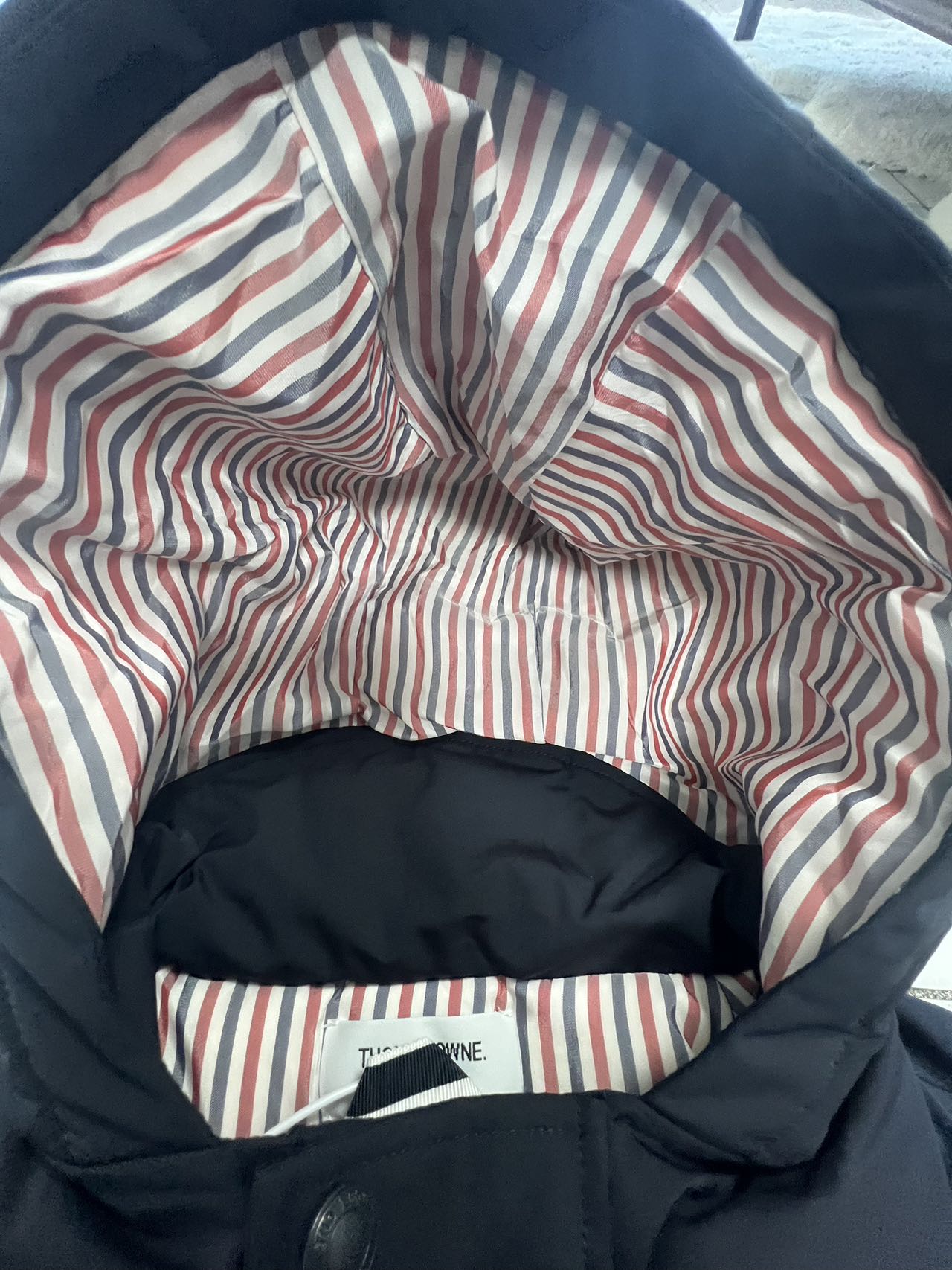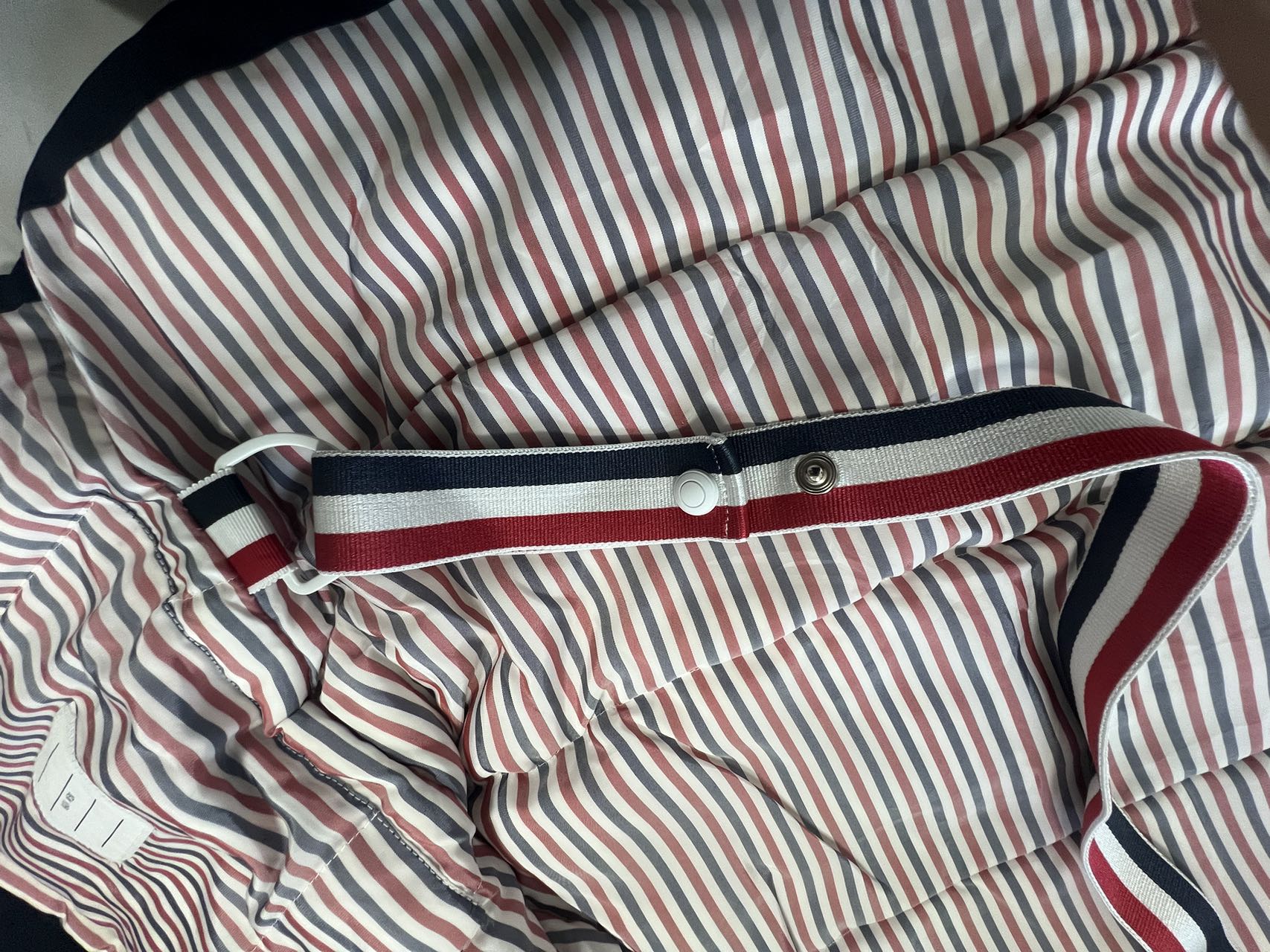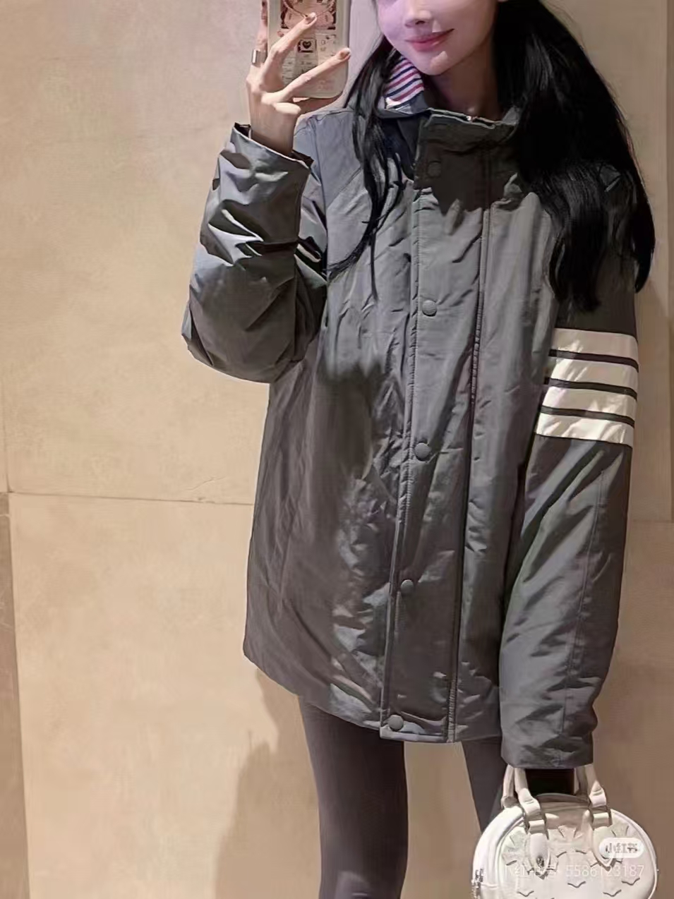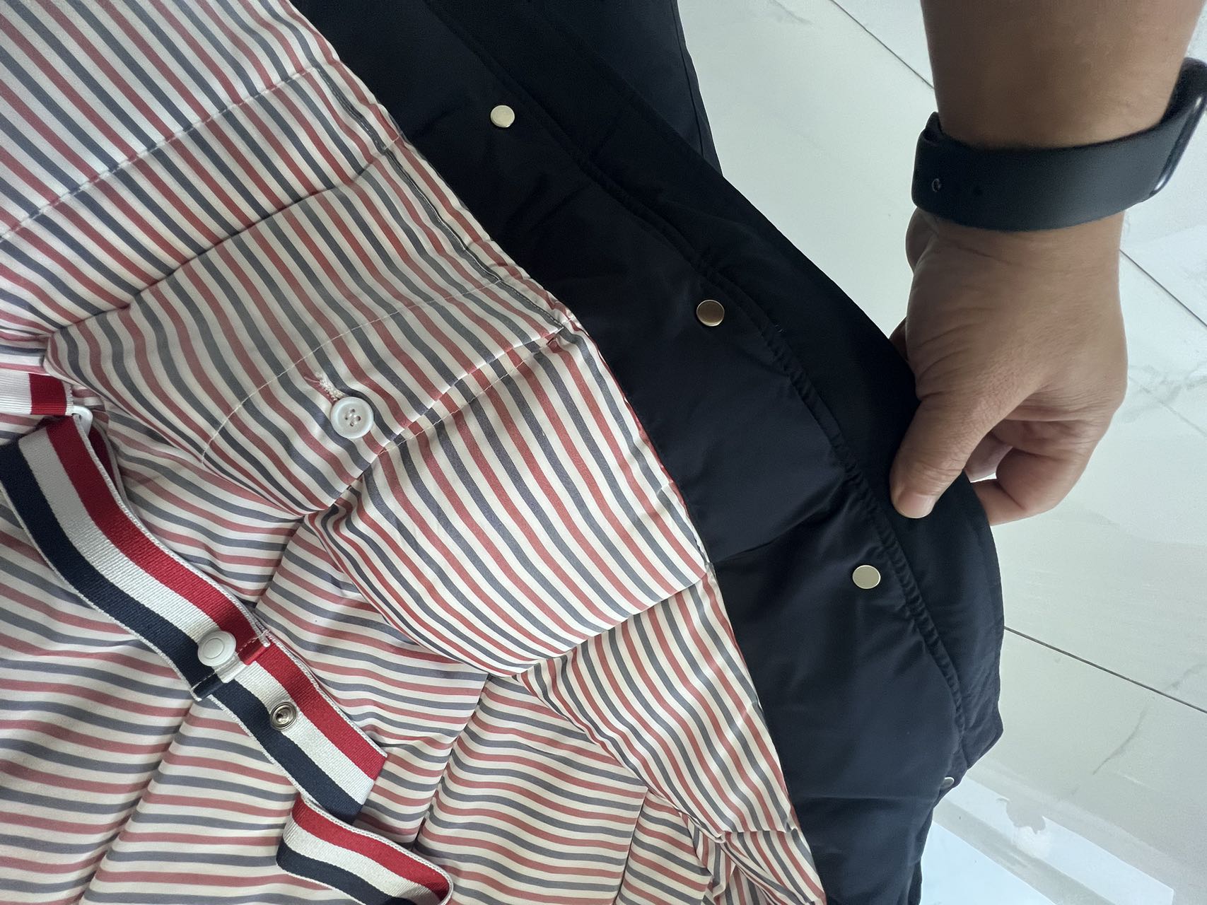 短款的设计也是一样,蓬松度不高,内里是标识性的条纹内衬设计,里面两根背带,不光是外表,内里也是帅气