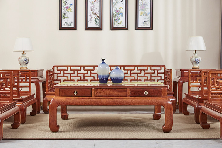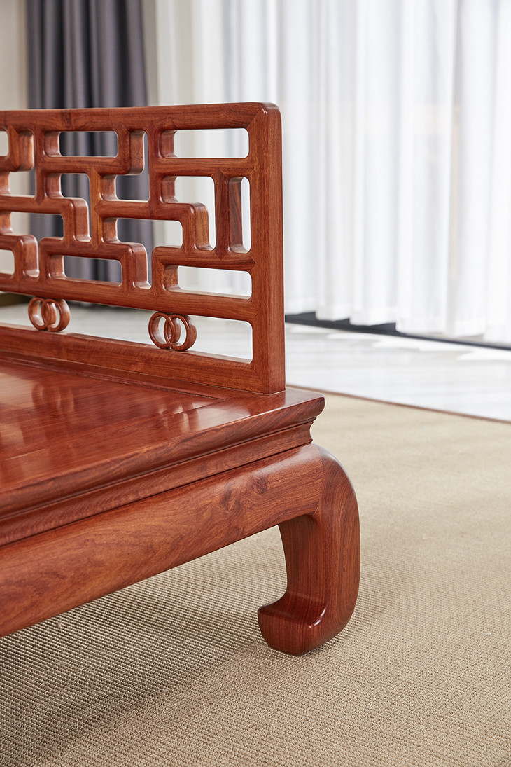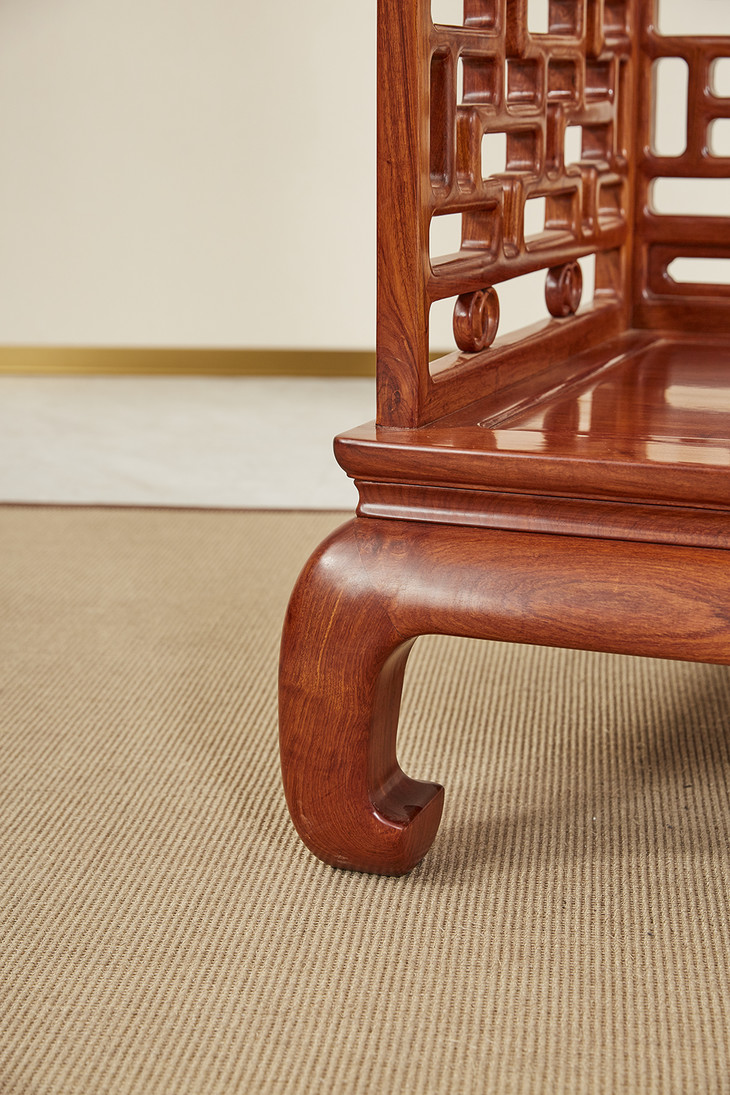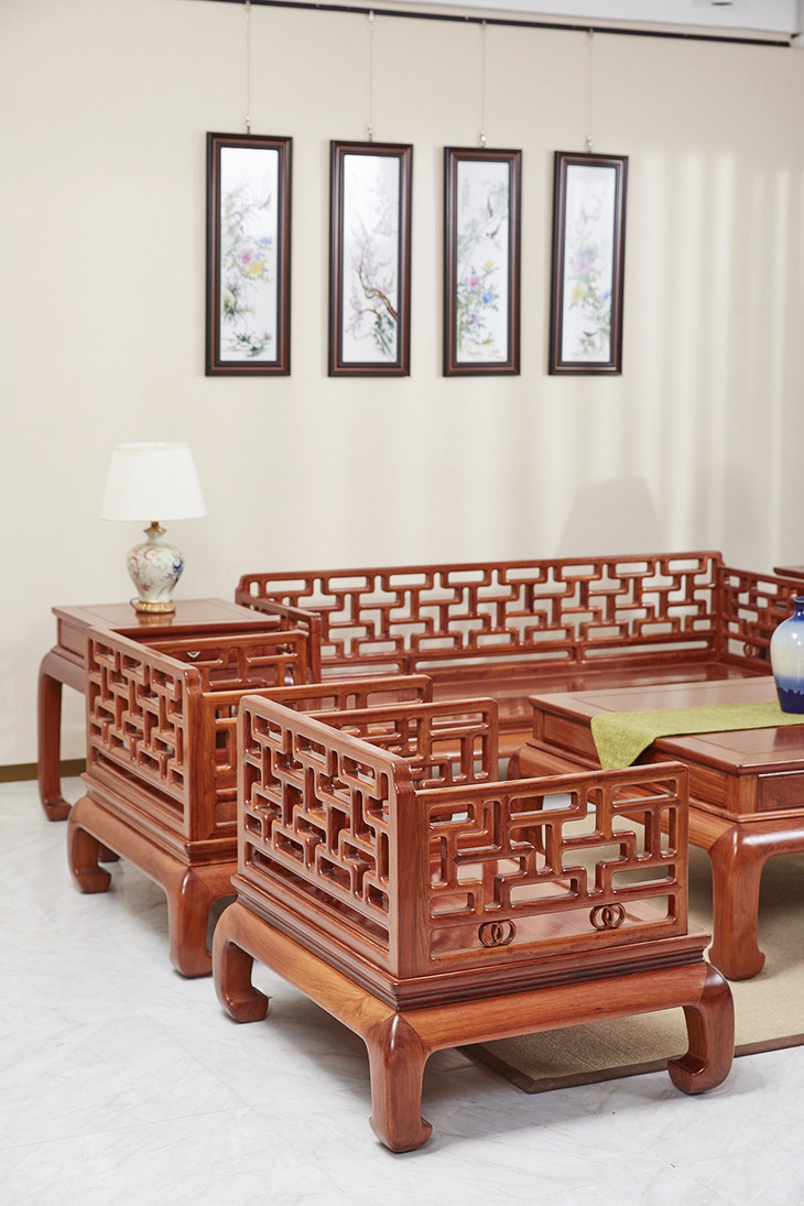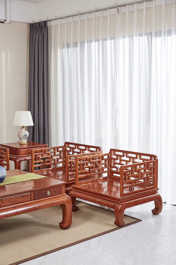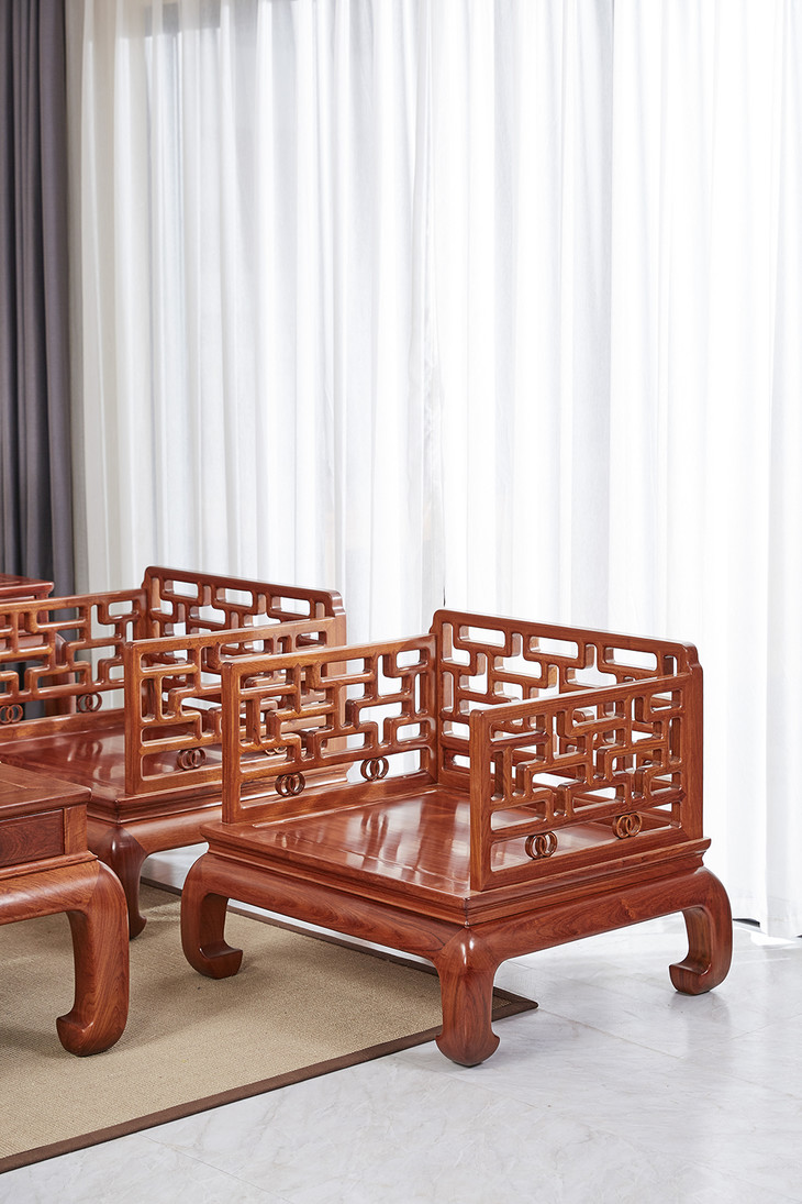 沙发靠背及扶手是通过榫卯,手工攒接曲尺式棂格,并搭配双环卡子花,冰盘沿下接洼面有束腰做工精严,鼓腿彭牙式,造型内敛简约。