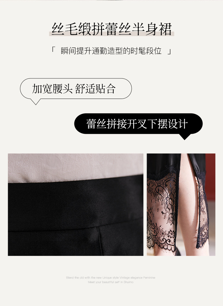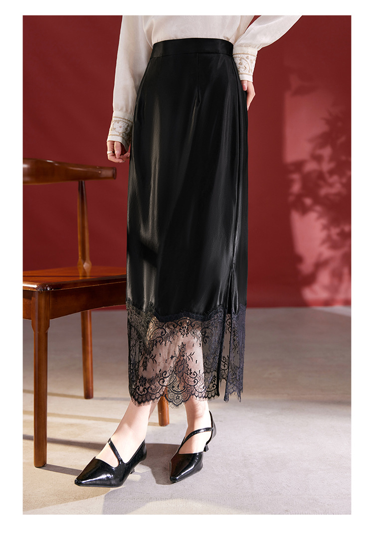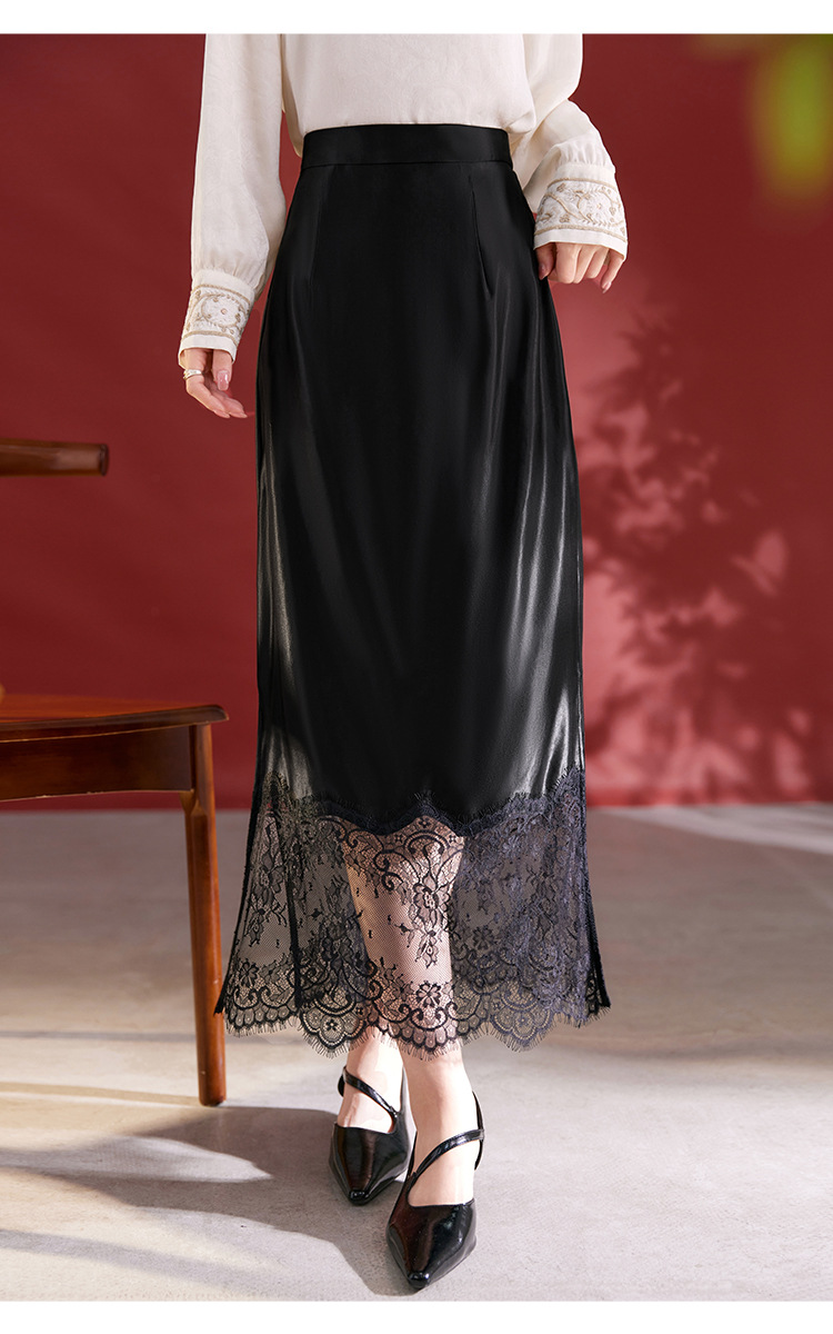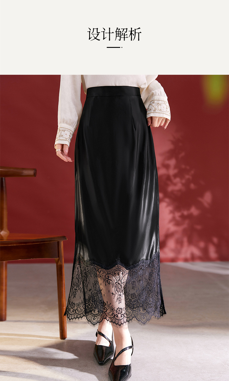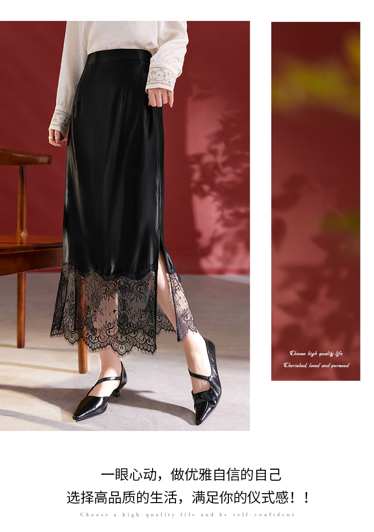 QS法式丝毛缎黑色蕾丝拼接半身裙女真丝秋季新款高腰显瘦a字裙1813
