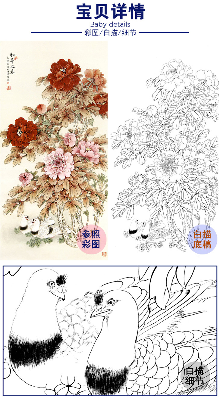 四尺六尺竖幅工笔花鸟白描底稿-牡丹-王庆升《和平之春》-多种白描尺寸可选-RT16