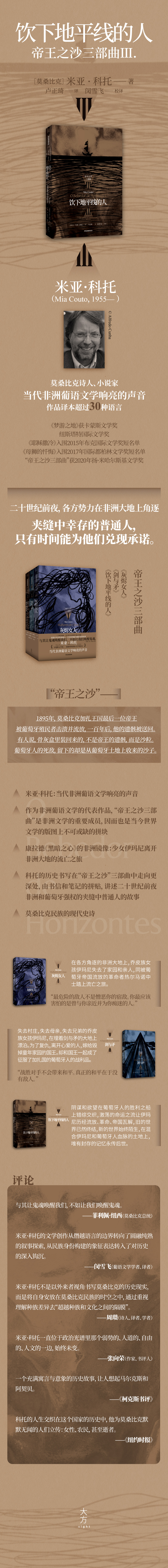 《饮下地平线的人》★ 当代非洲文学版图不可缺少的拼块,米亚·科托:当代非洲葡语文学的中坚力量、卡蒙斯文学奖和纽斯塔特国际文学奖得主、备受期待的诺奖人选、莫桑比克民族史诗的书写者。