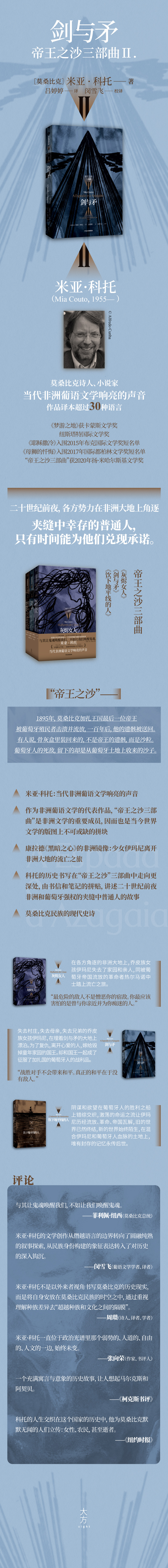 米亚·科托的文学创作从僭越语言的边界转向了圆融纯熟的叙事探索,从民族身份构建的象征表达转入了对历史的深入钩沉。——闵雪飞(葡语文学学者、译者)