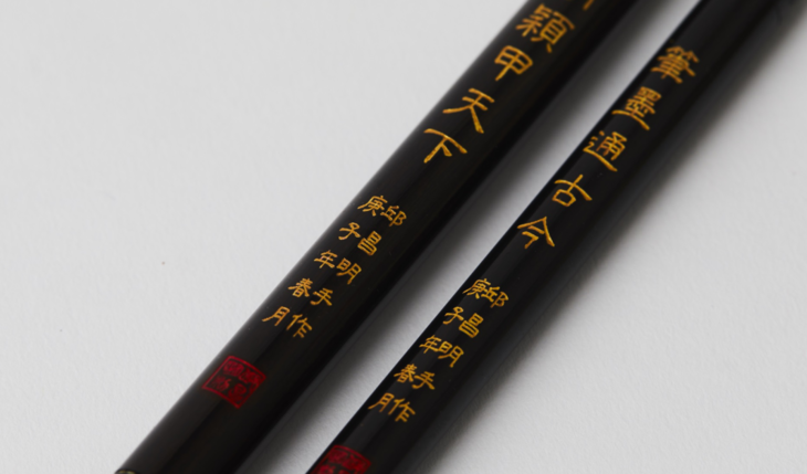 刻字遵循先横后竖之法,分横刻刀和竖刻刀,我们看到成品湖笔上的品名、题词落款等所有字的笔画都是先刻好横画,再刻竖画,但最终的成字自成一体,完全看不出是横竖分开刻的。