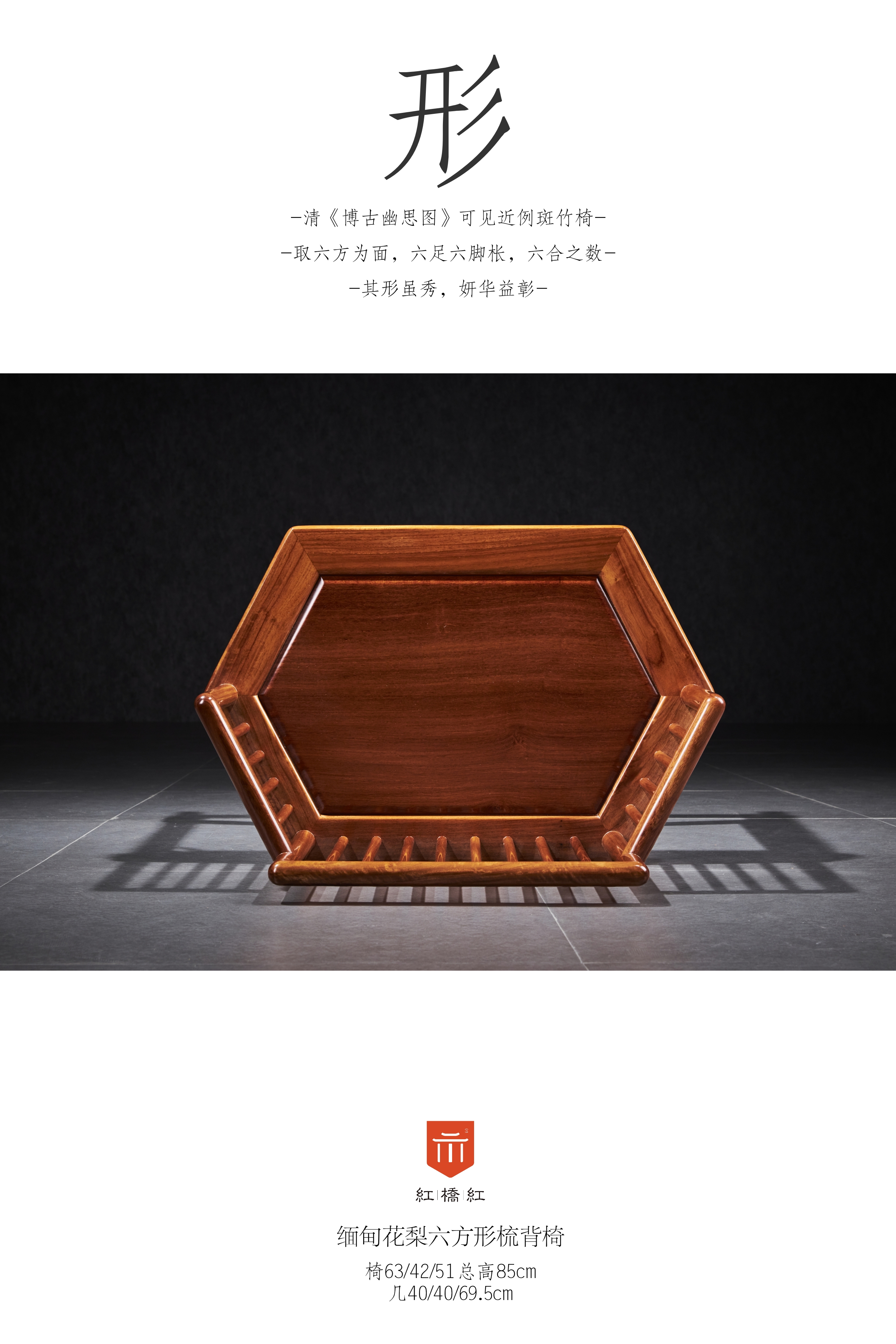 此椅除六足及椅面六角形外,它的制式应为梳背椅,椅盘与搭脑或扶手间安数根直立棂柱,似梳子状,鹅脖与靠背立柱均与腿足一木连做,梳背式靠背及扶手。