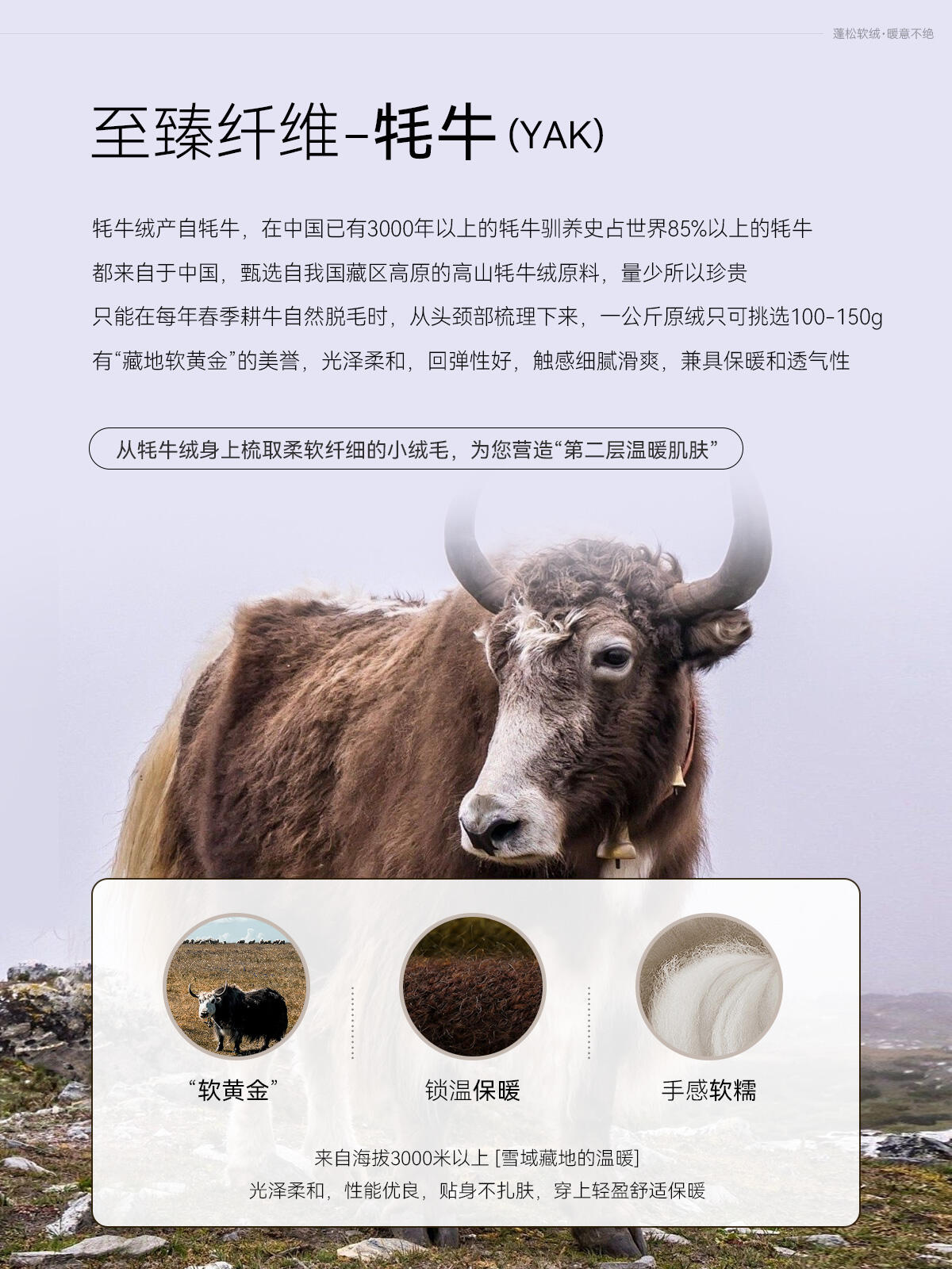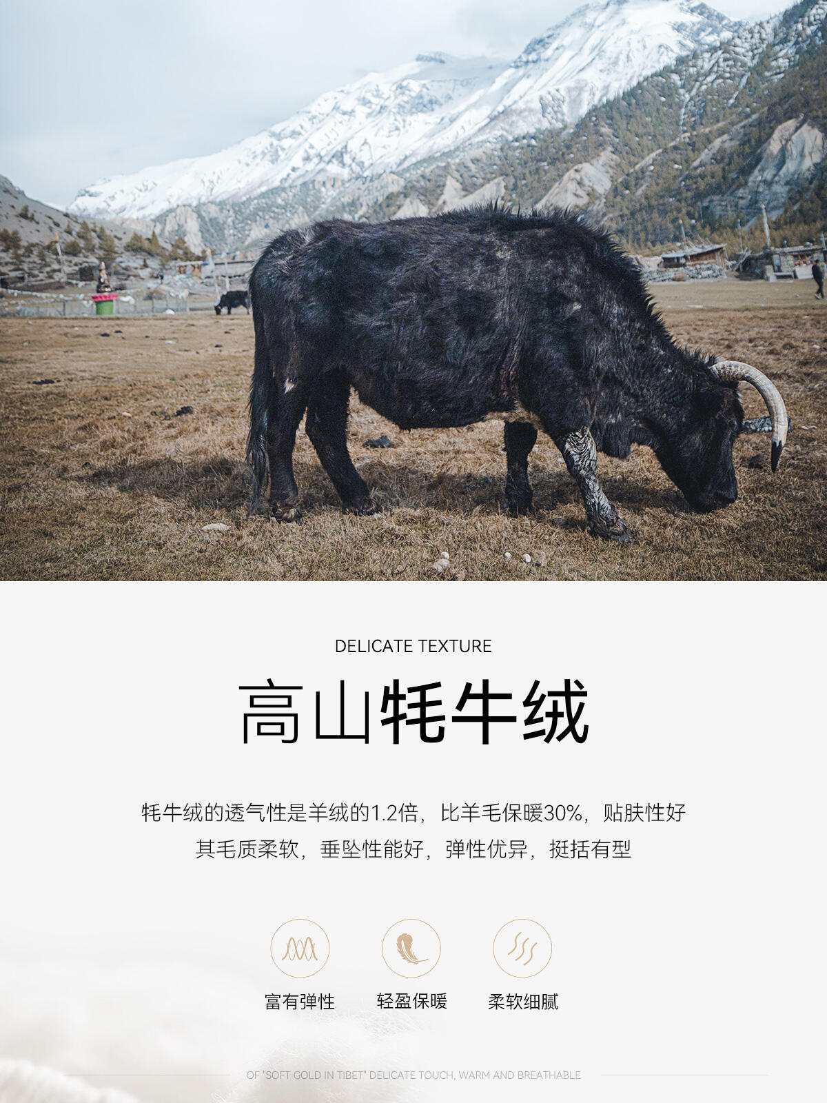 •牦牛绒不仅有公认的高质量和高保暖性,兼顾柔软和亲和丰满的质量,更是产量极少的动物纤维,因而更显珍贵和特别。